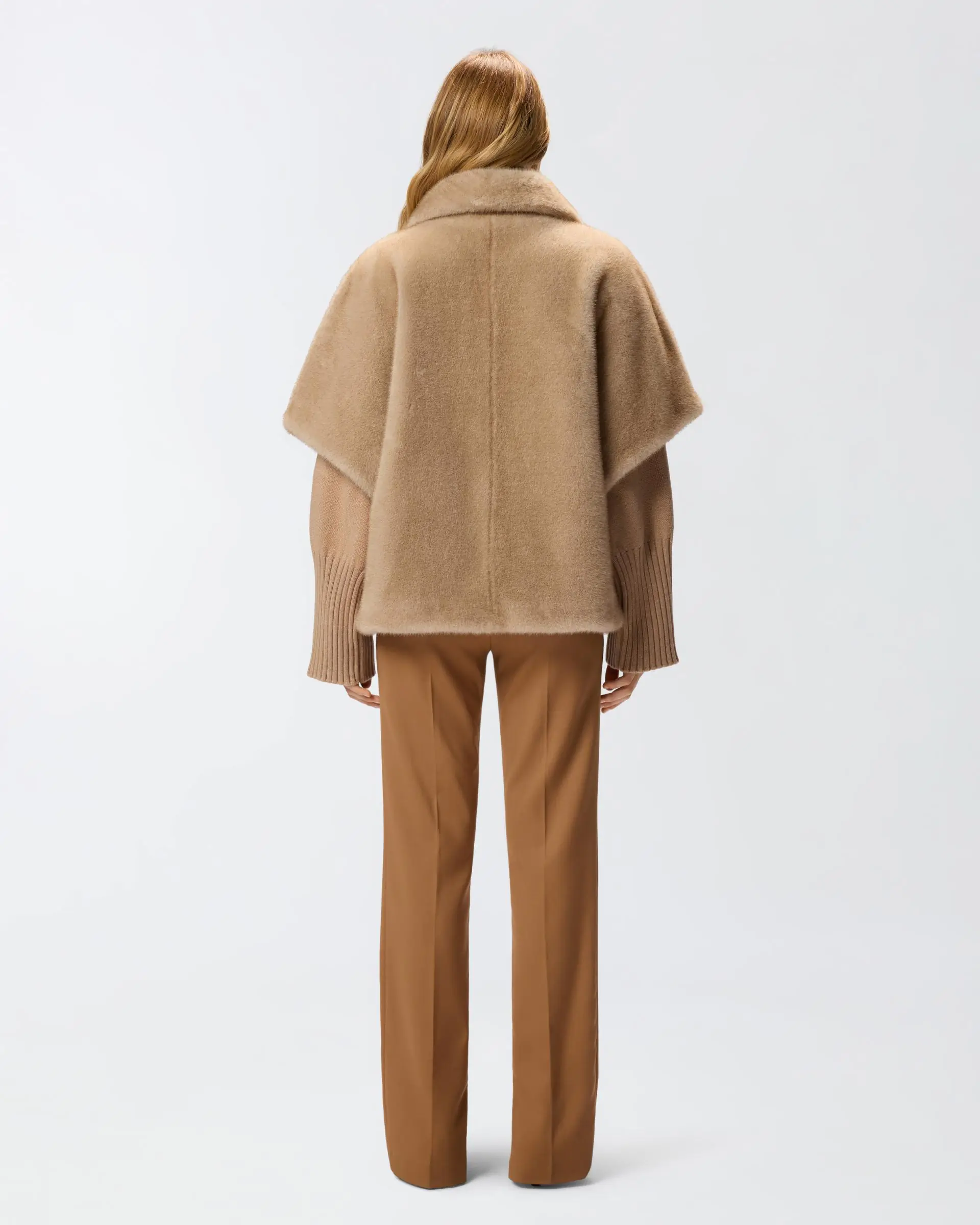 Short cape with short sleeves, welt pockets, a wraparound folded collar and off-centre front fastening. This piece is made from soft Aspen fabric with a fur effect, which is particularly pleasant to the touch. Lined model. This outerwear is ideal for wearing on cooler early-season days in the open air with maximum comfort without sacrificing a touch of style.