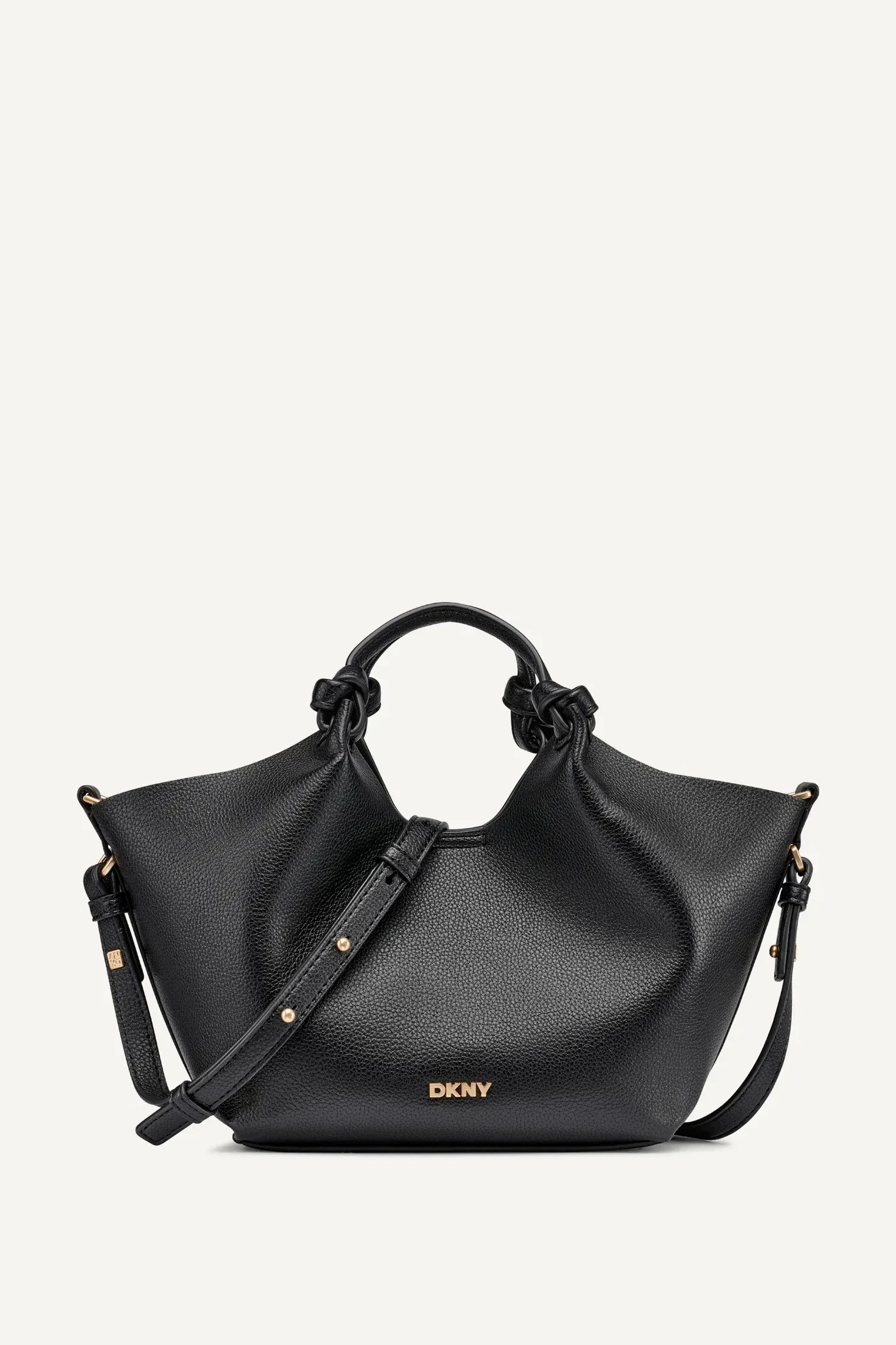 Exterior back slip pocket; detachable, adjustable shoulder strap; knotted dual top handles; magnetic snap tab fastening