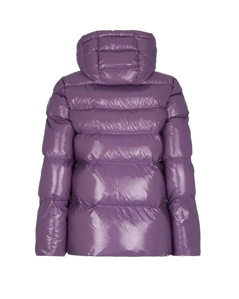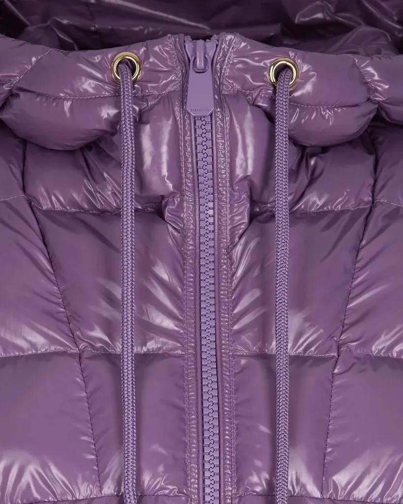 Padded pea coat in crystal-effect nylon fabric with a special glossy finish, customised with the Love Birds logo patch on one sleeve. Hood with metal-tipped drawstring, long sleeves and vertical welt pockets at the sides. This outerwear garment is lined for greater comfort when worn. Two-way zip fastening on the front.