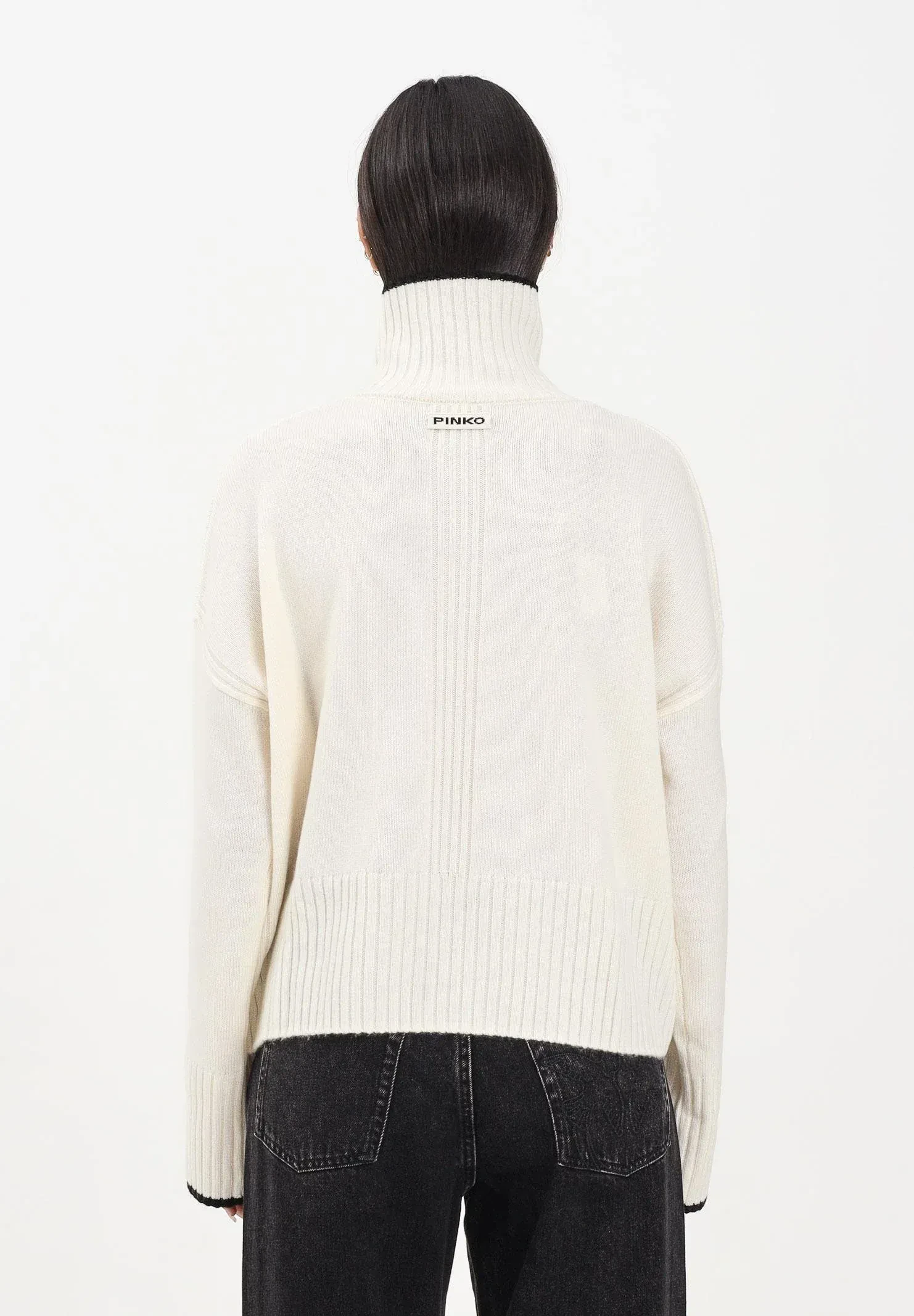 Long-sleeved polo-neck in a merino wool and cashmere blend, ideal for warming up your cold-season outfits. Understated and contemporary, this design will become the undisputed star of all your outfits, whatever the occasion. The contrasting yarn on the neckline and cuffs adds a touch of vibrancy to the design. The neck, hem and cuffs are ribbed, while the final touch is given by the PINKO lettering logo on the back. The piece has undergone finishing tests to minimise the possible formation of pilling, ensuring greater fabric softness and durability.