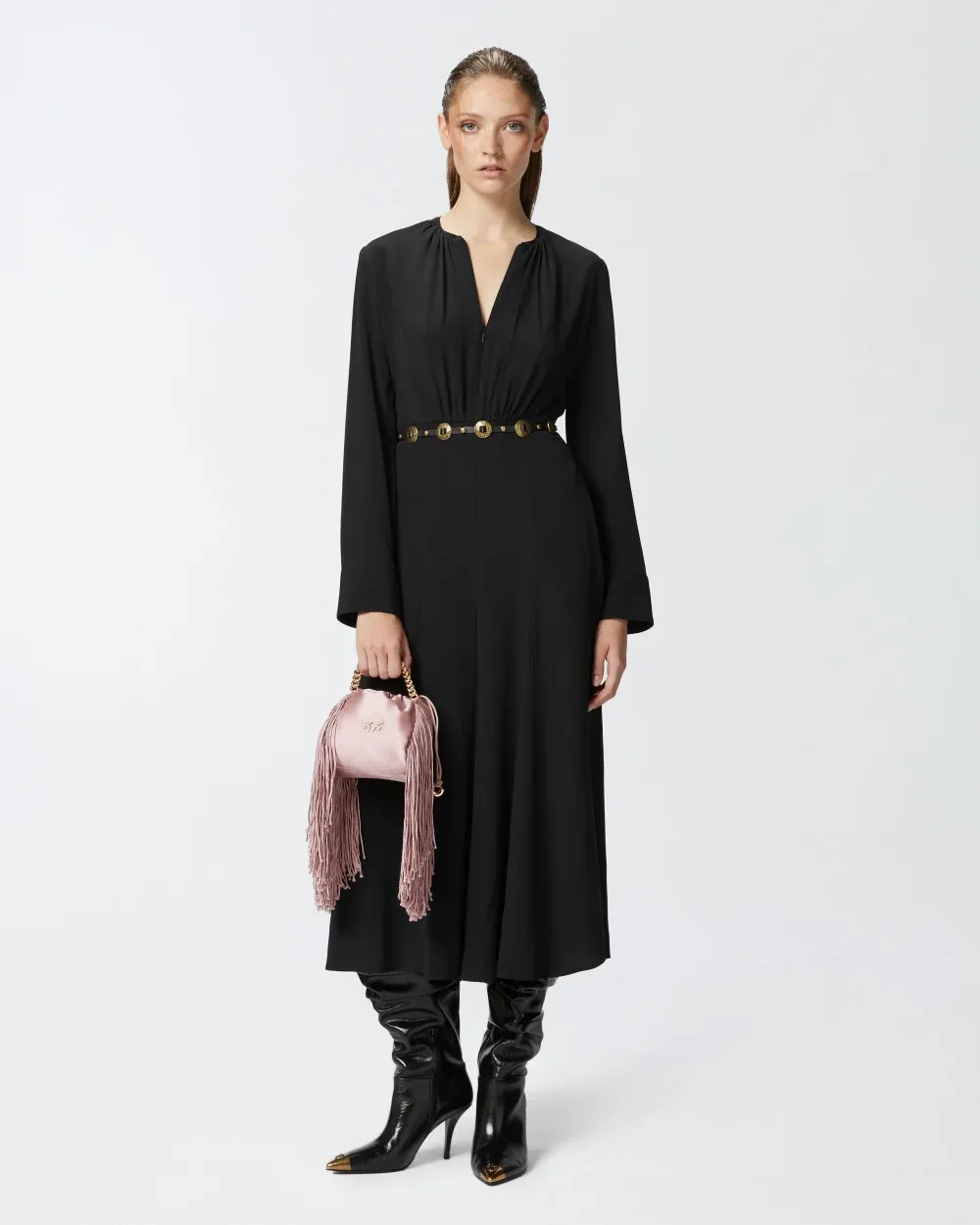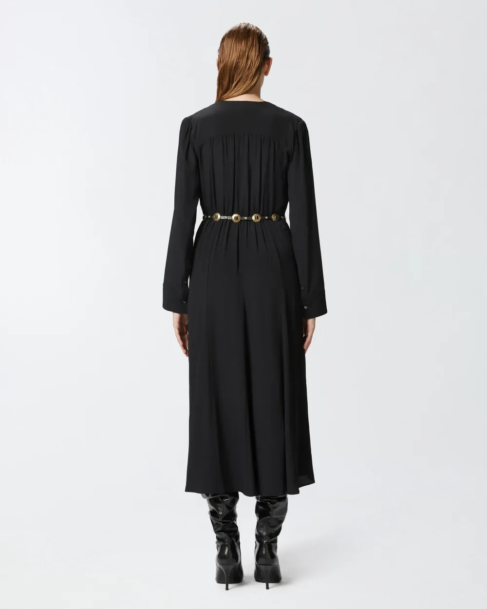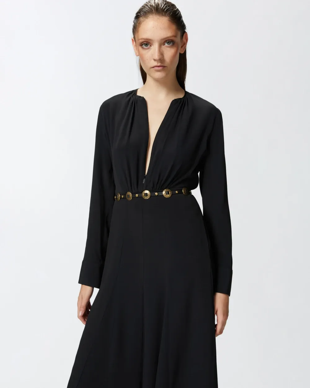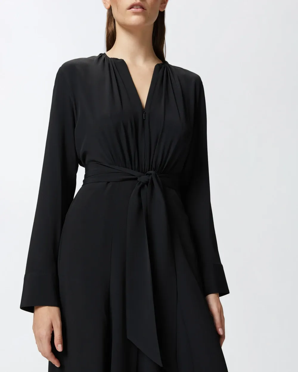 Long dress in lightweight silk-blend crepe de Chine fabric, complete with matching-fabric belt that ties at the waist. Round neck, long sleeves with cuff and invisible zip fastening down the front.