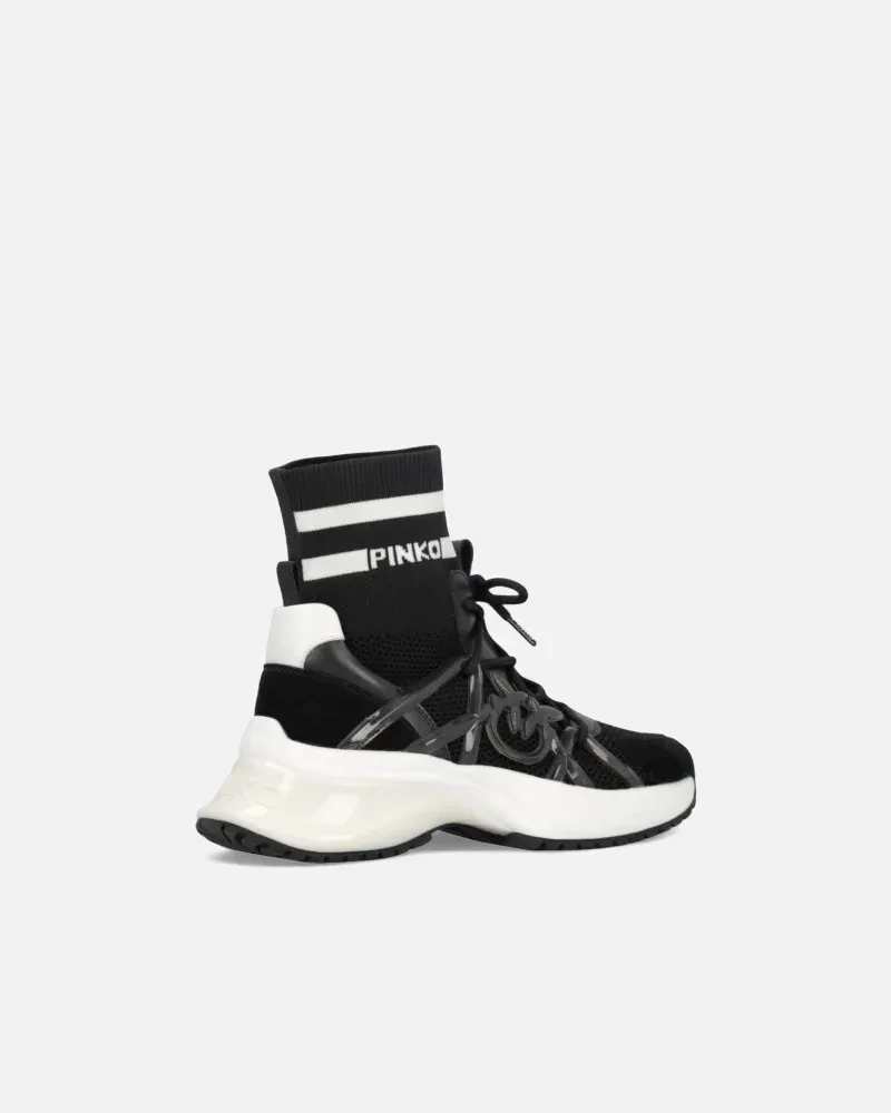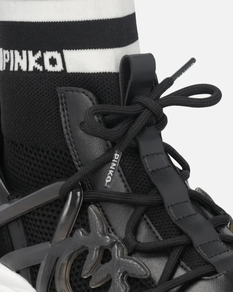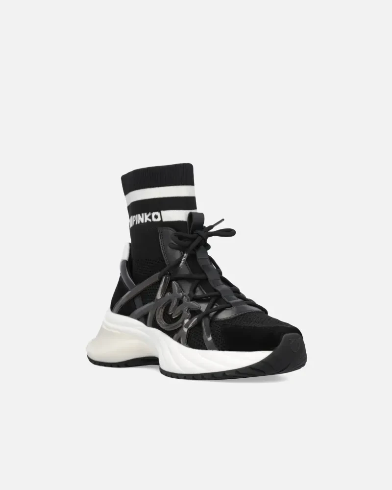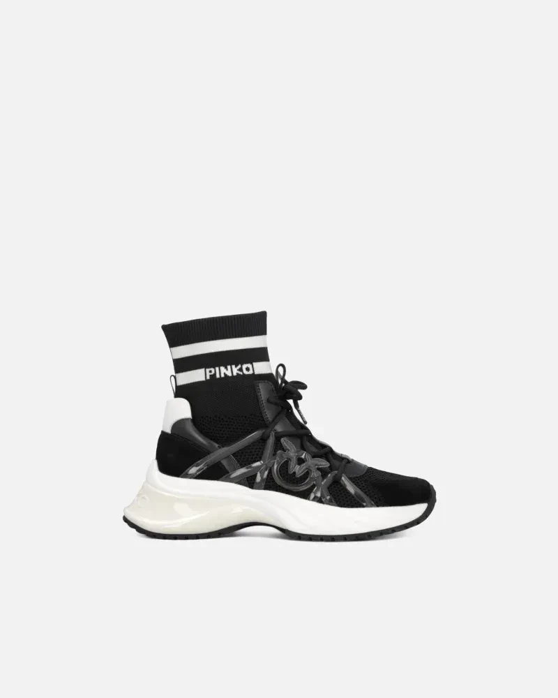 Slip-on sneakers in technical fabric and leather sections, with round laces and embossed detail on the side with the Love Birds logo. They feature a knitted sock-style ankle section in technical fabric with a striped pattern and logo. Running rubber sole, TPU spoiler, textile lining and leather insole.