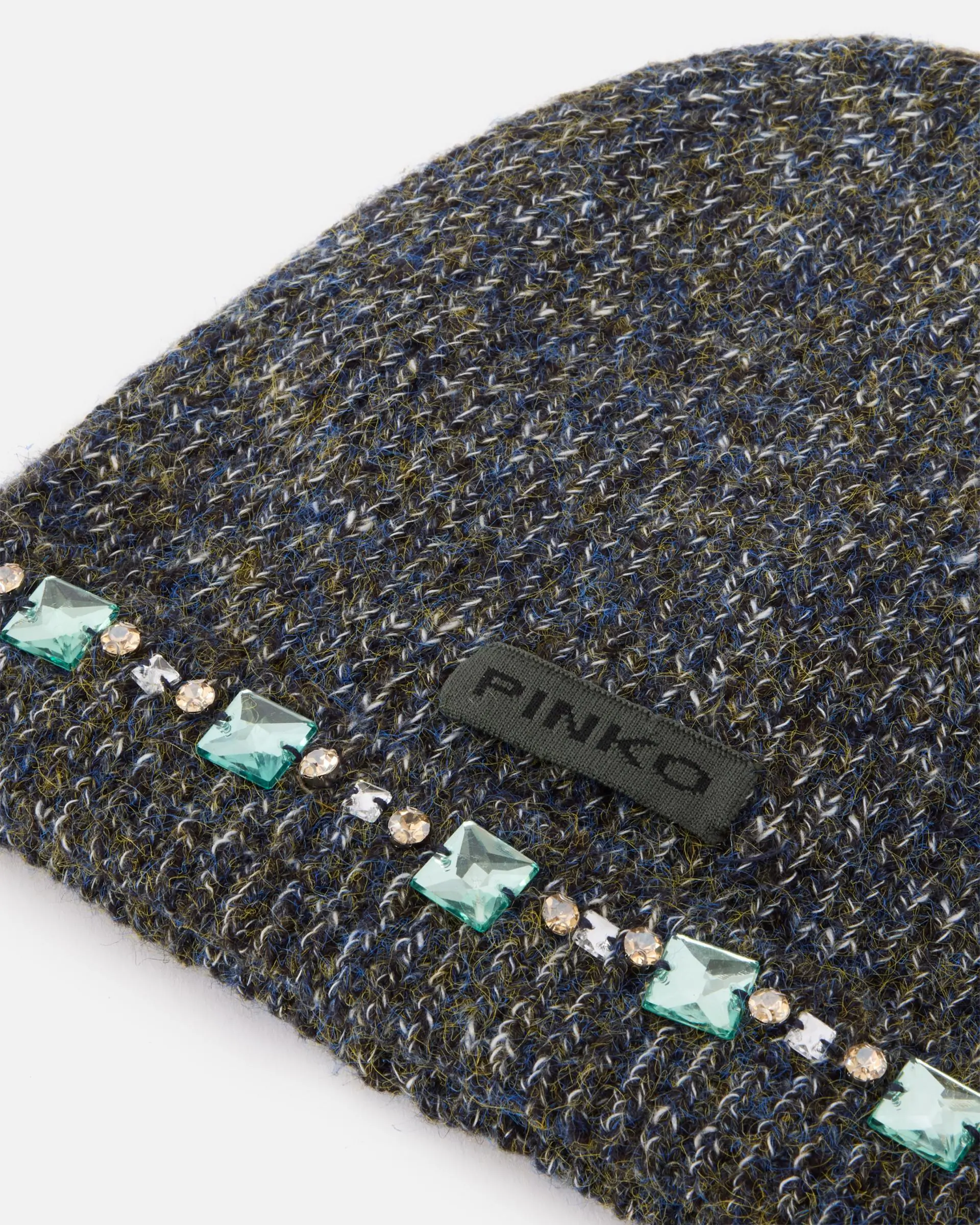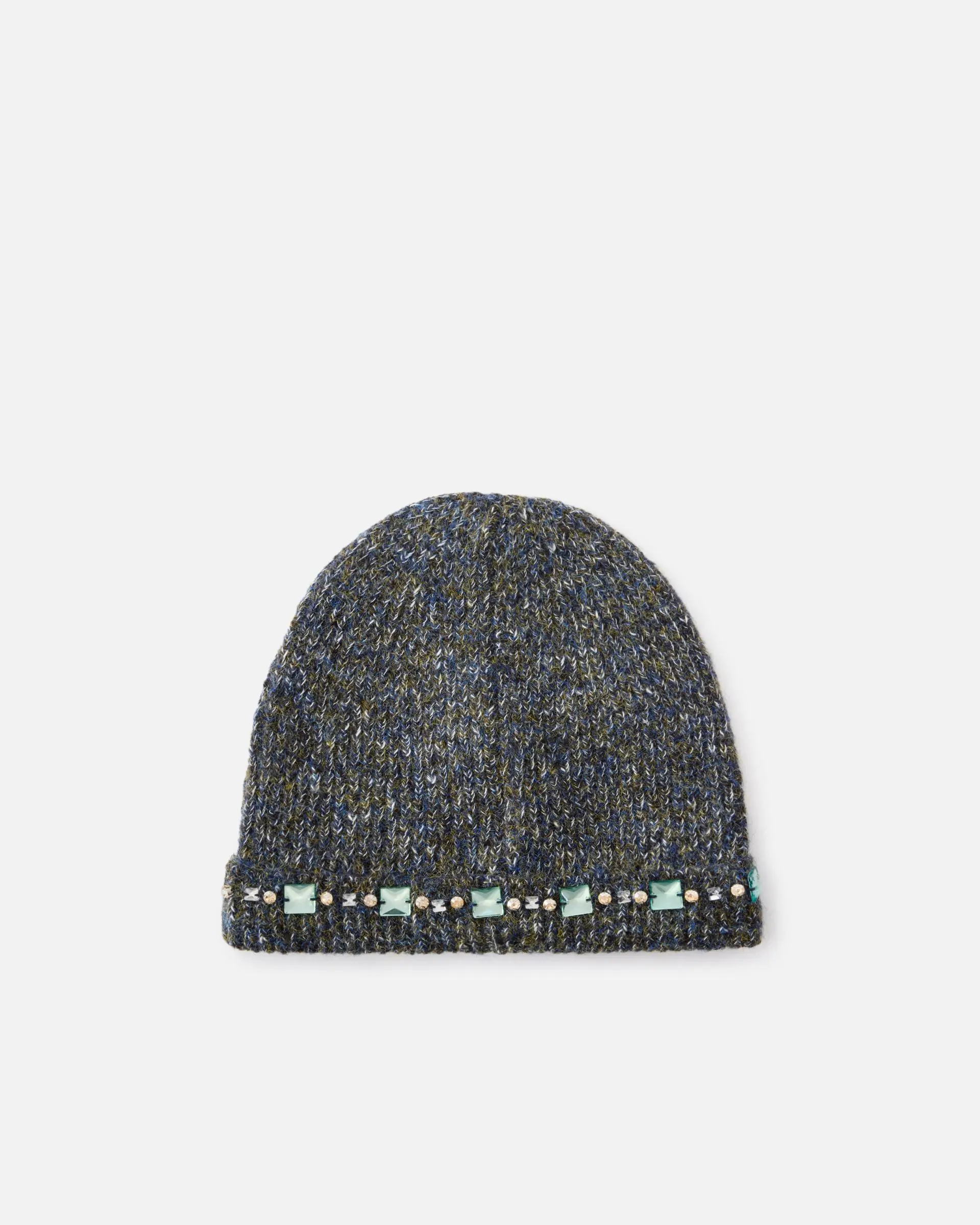 Warm mouliné knit beanie with an urban-chic charm, characterized by an elegant mélange effect that mixes different shades creating a rich and sophisticated texture. The essential design is embellished with a sequence of luminous crystals that capture the light with every movement. The soft, enveloping fit ensures comfort and warmth, while the tone-on-tone logo plate adds a discreetly glamorous touch. The fine weave and the quality of the yarn ensure strength and durability, making this accessory perfect for facing the cold season in style. Pair it with an oversized coat and sneakers for a trendy street style look, or wear it with a technical down jacket for a sporty yet sophisticated outfit.