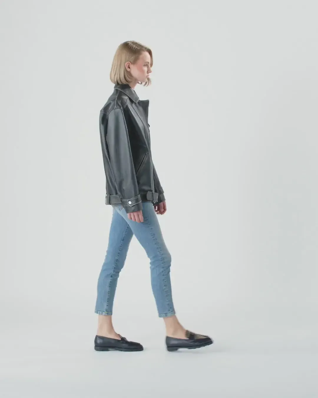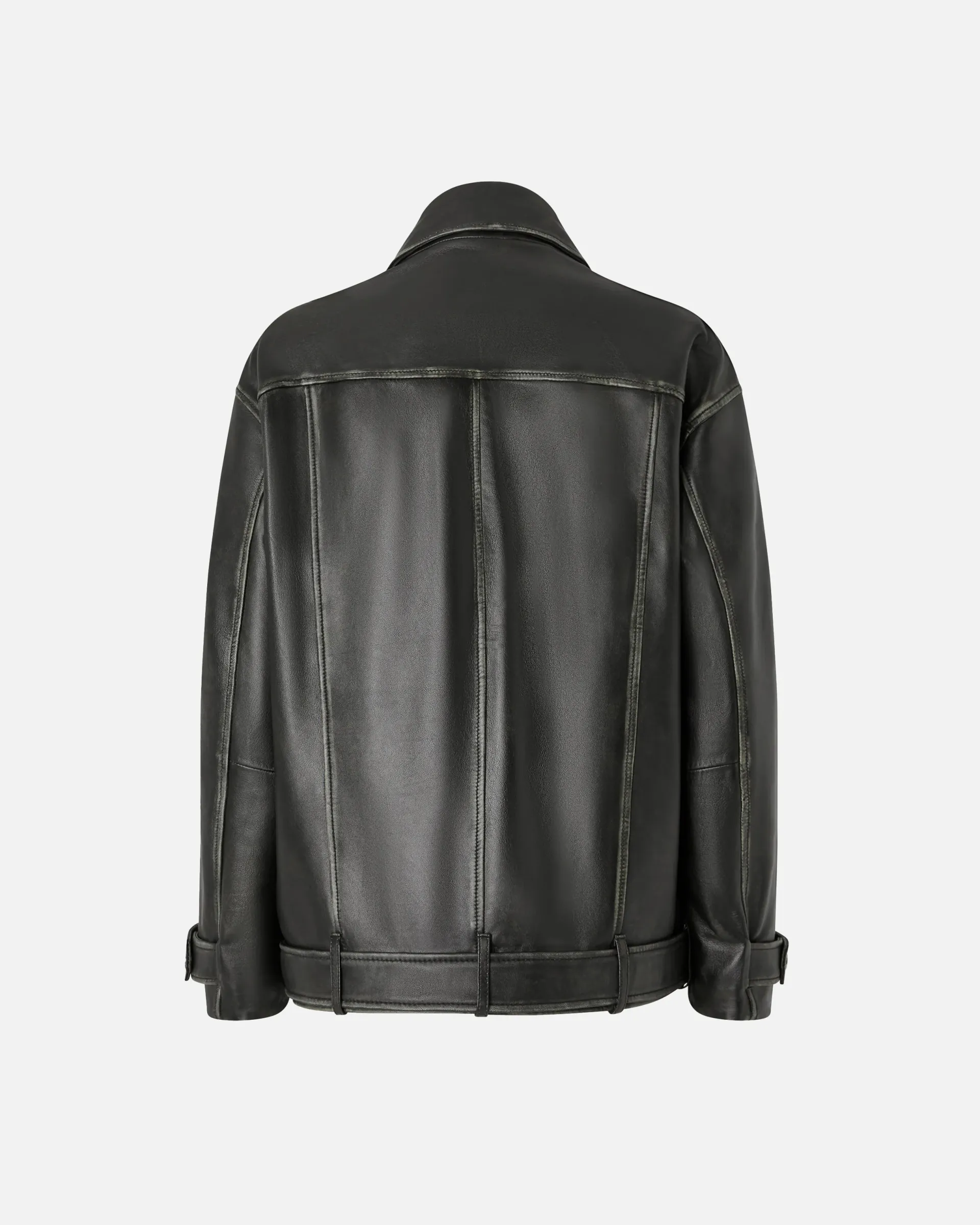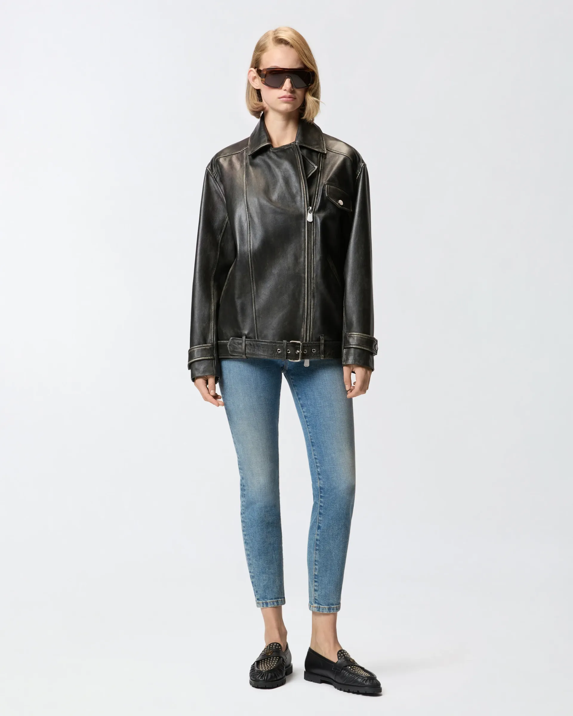 Biker-style biker jacket with shirt collar, cuff closure adjusters, slanted pockets and pocket with flap and snap button. The garment is offered in a leather version with an attractive aged effect, obtained through a special dyeing and finishing process. Belt with buckle at the bottom of the garment, to be worn open or closed to customize the wear of the garment. Off-center zip closure. This jacket is a contemporary reinterpretation of the classic leather biker jacket, with a slightly softer and less structured line, perfect to combine with your everyday looks and light them up with the style that this outerwear represents. Made with sustainable leather certified GRS (Global Recycle Standard) and LWG GOLD, for greater attention to environmental impact.