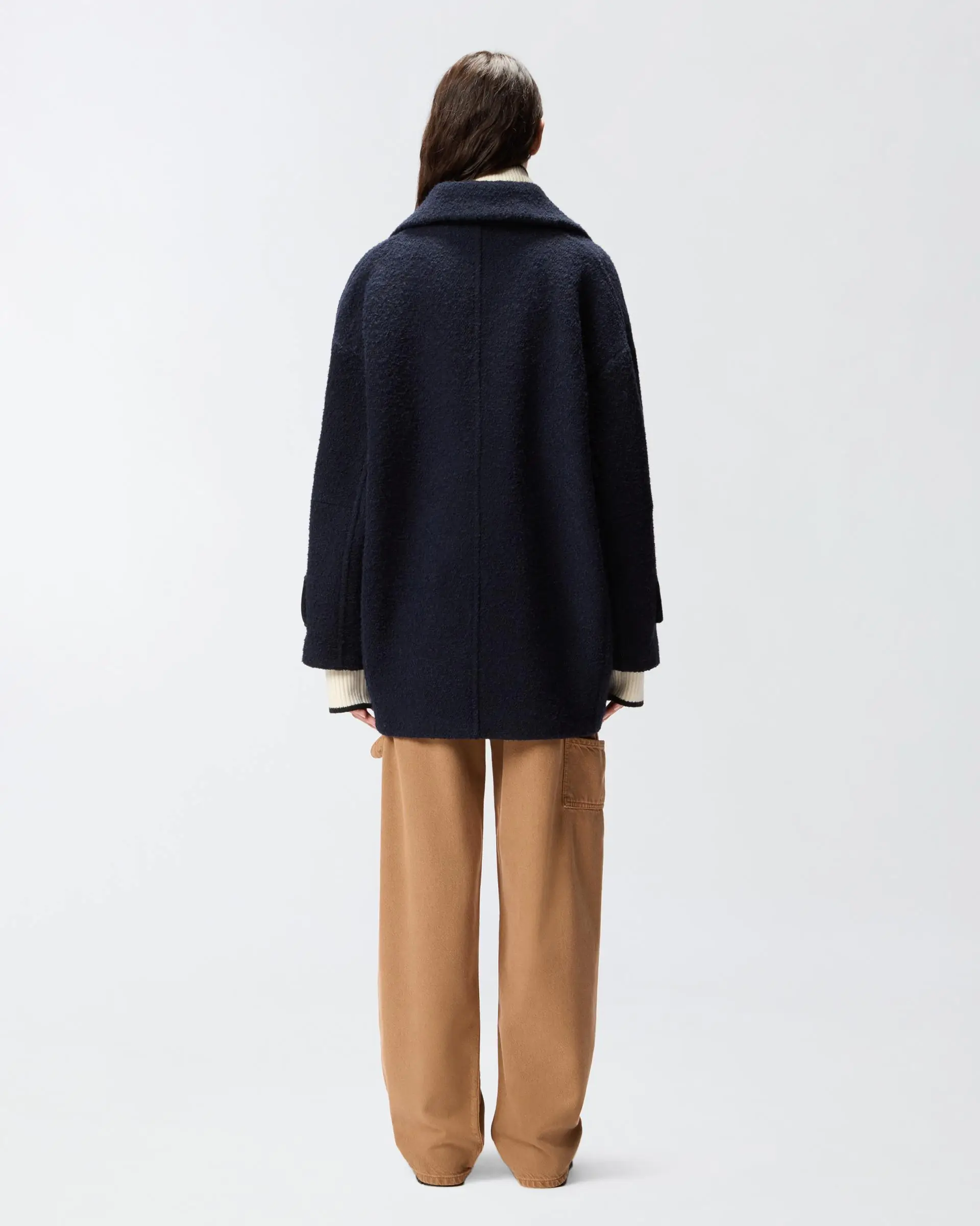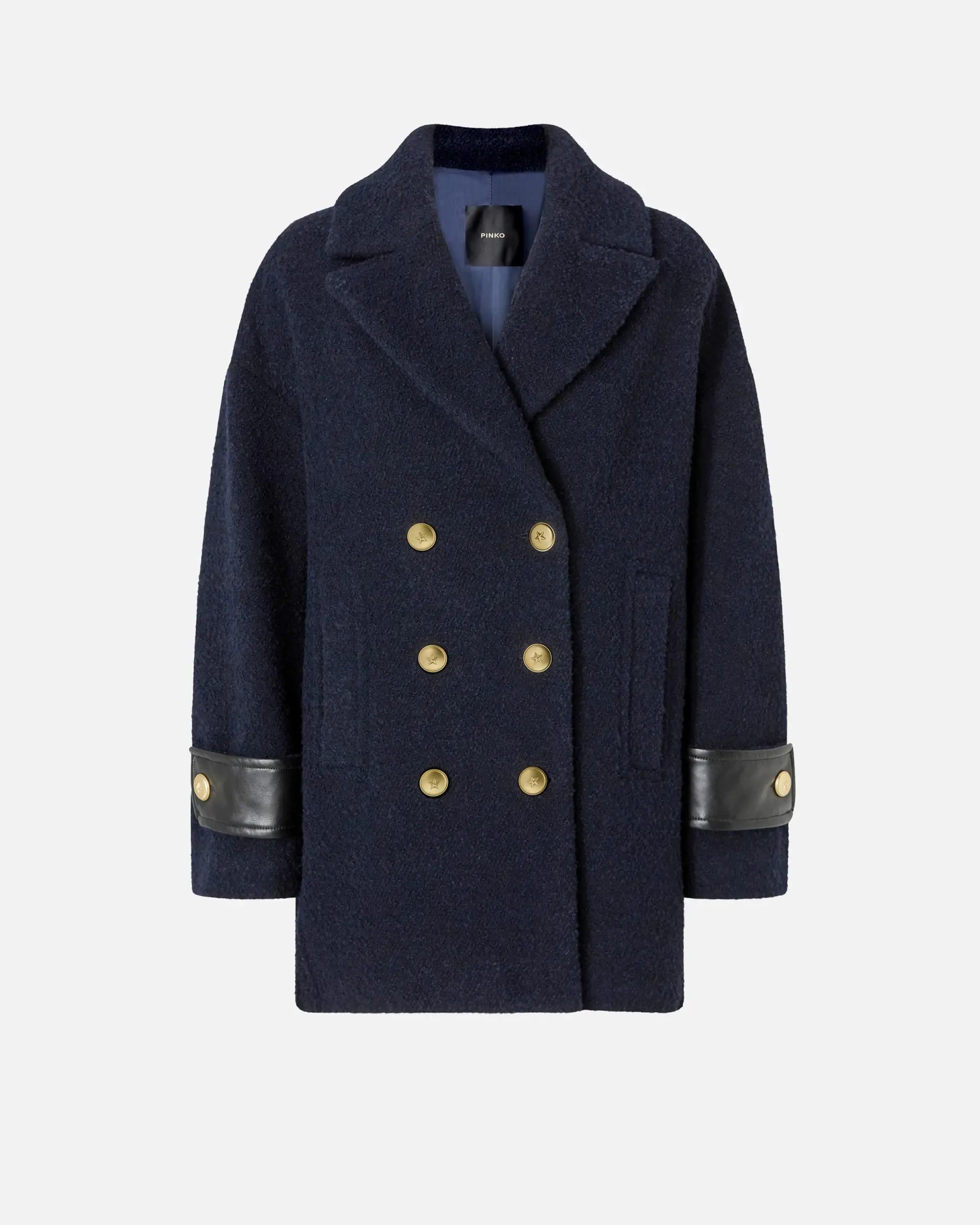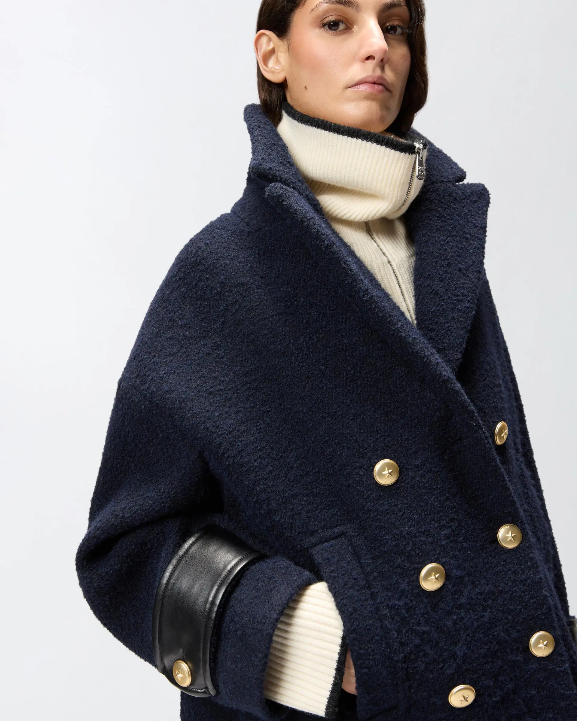 Short pea coat in diagonal-weave wool-blend bouclé fabric with coated fabric tab details on the cuffs. Lapel collar and vertical welt pockets on the front. Double-breasted fastening with star-decorated metal buttons. Wear this sailor-inspired garment for a comfortable look and timeless style.