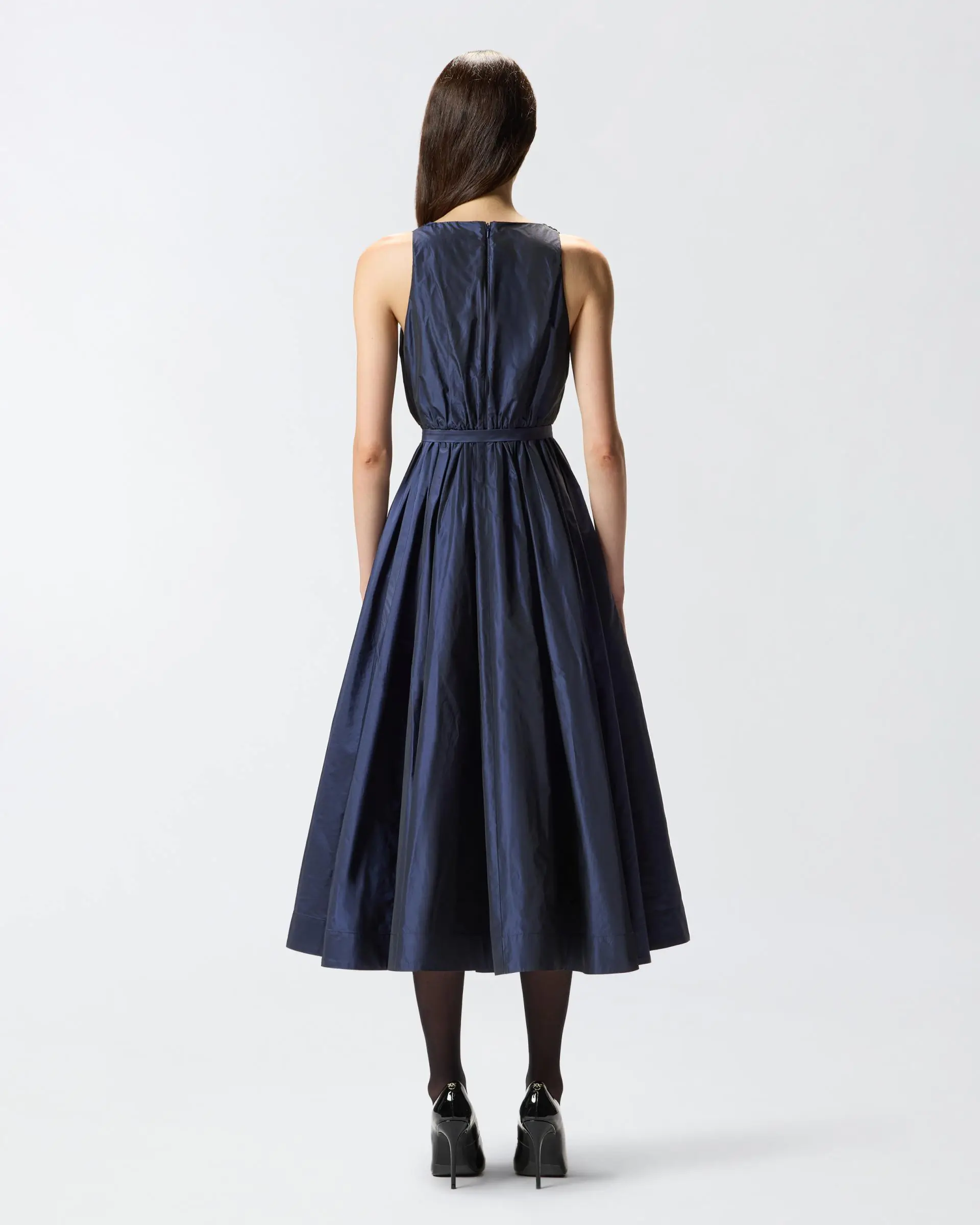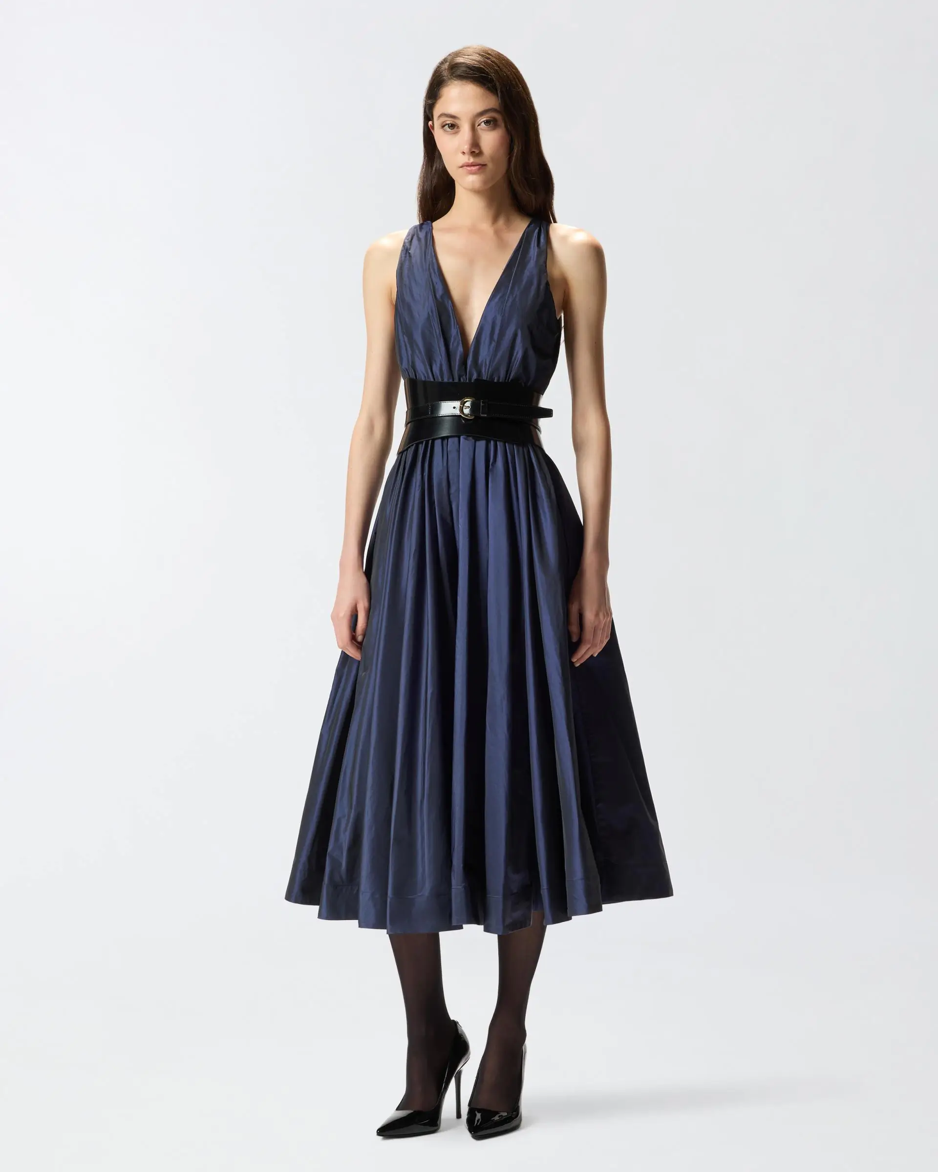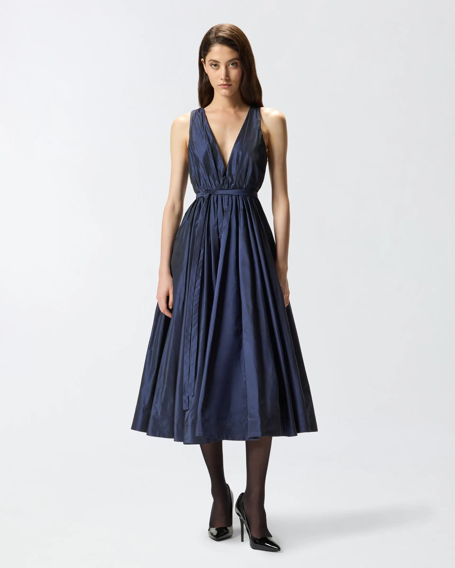 Long sleeveless dress with a V-neck and a cinched waist with top-stitching and matching belt, complete with a feminine bow on the front. The light and glossy fabric creates shimmer and goes perfectly with the soft, dynamic volume that distinguishes the piece. Wear this dreamy style and become the star of all special occasions.