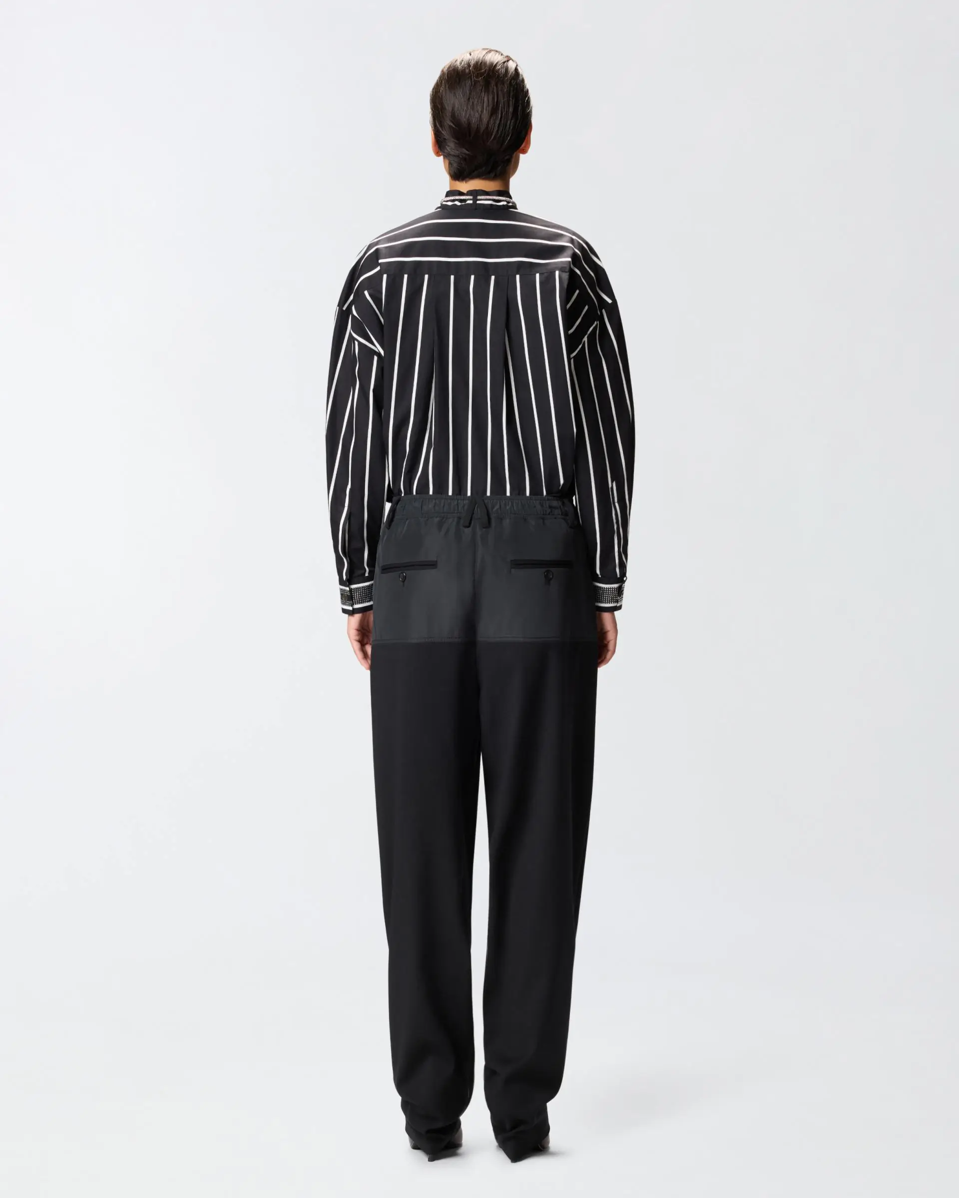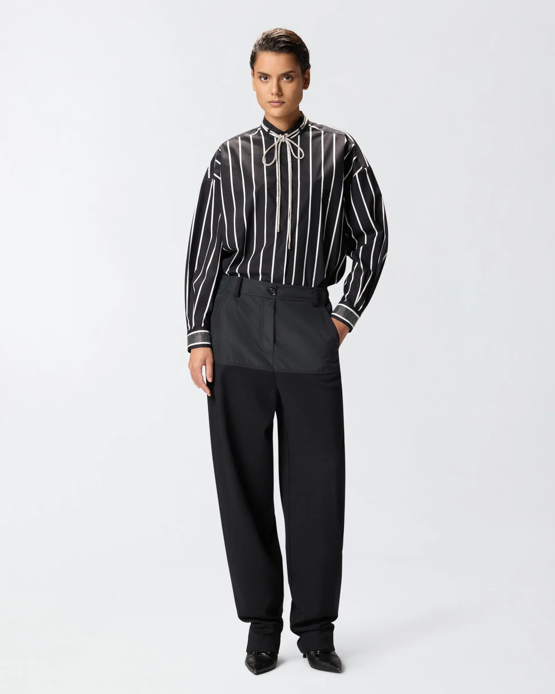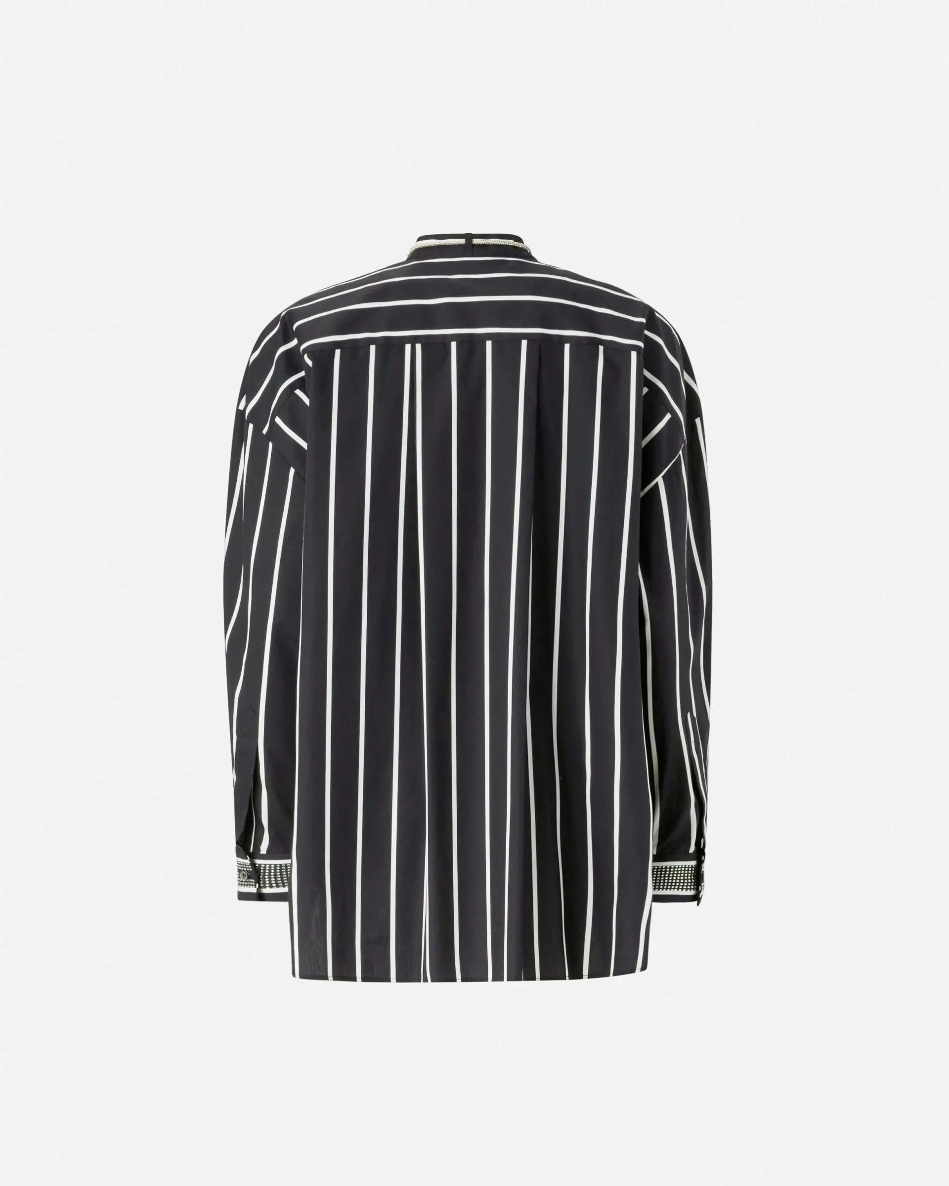 Slightly oversized classic-cut shirt featuring a contrasting vertical-stripe pattern. The style has a straight hem and a hidden front fastening and is embellished by an inverted collar with rhinestone-covered laces, which also features on the cuffs of the long sleeves. Wear this shirt with black trousers for a stylish, feminine look.