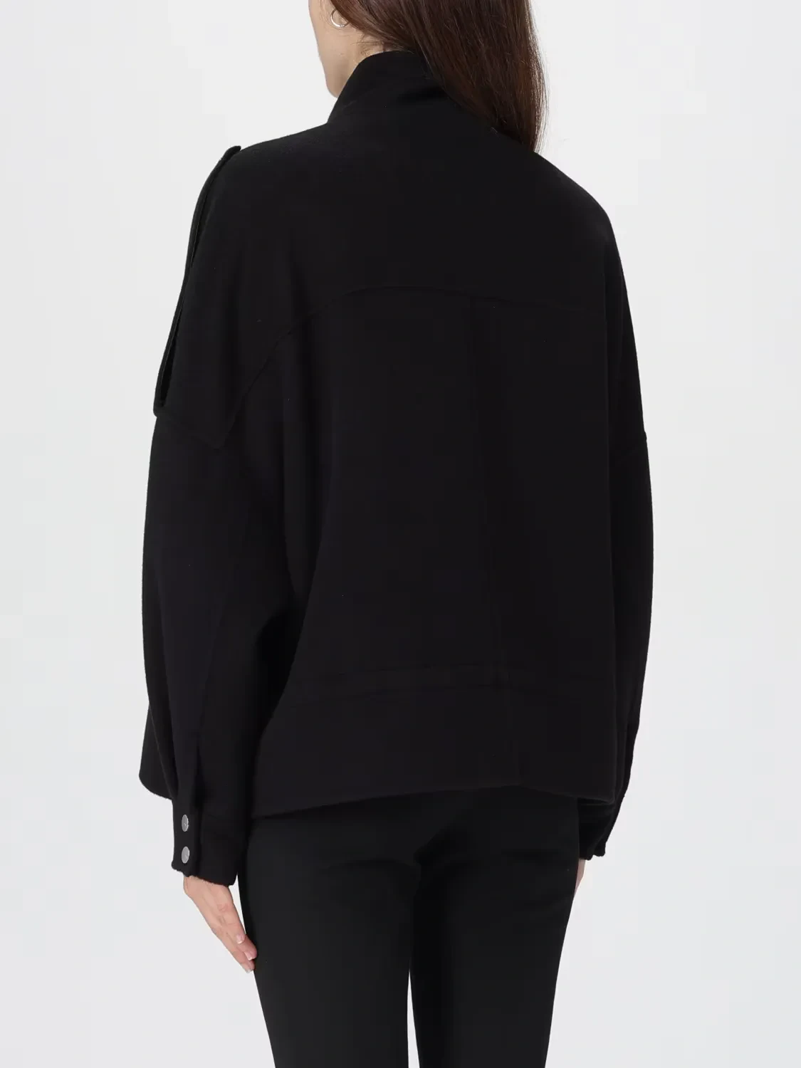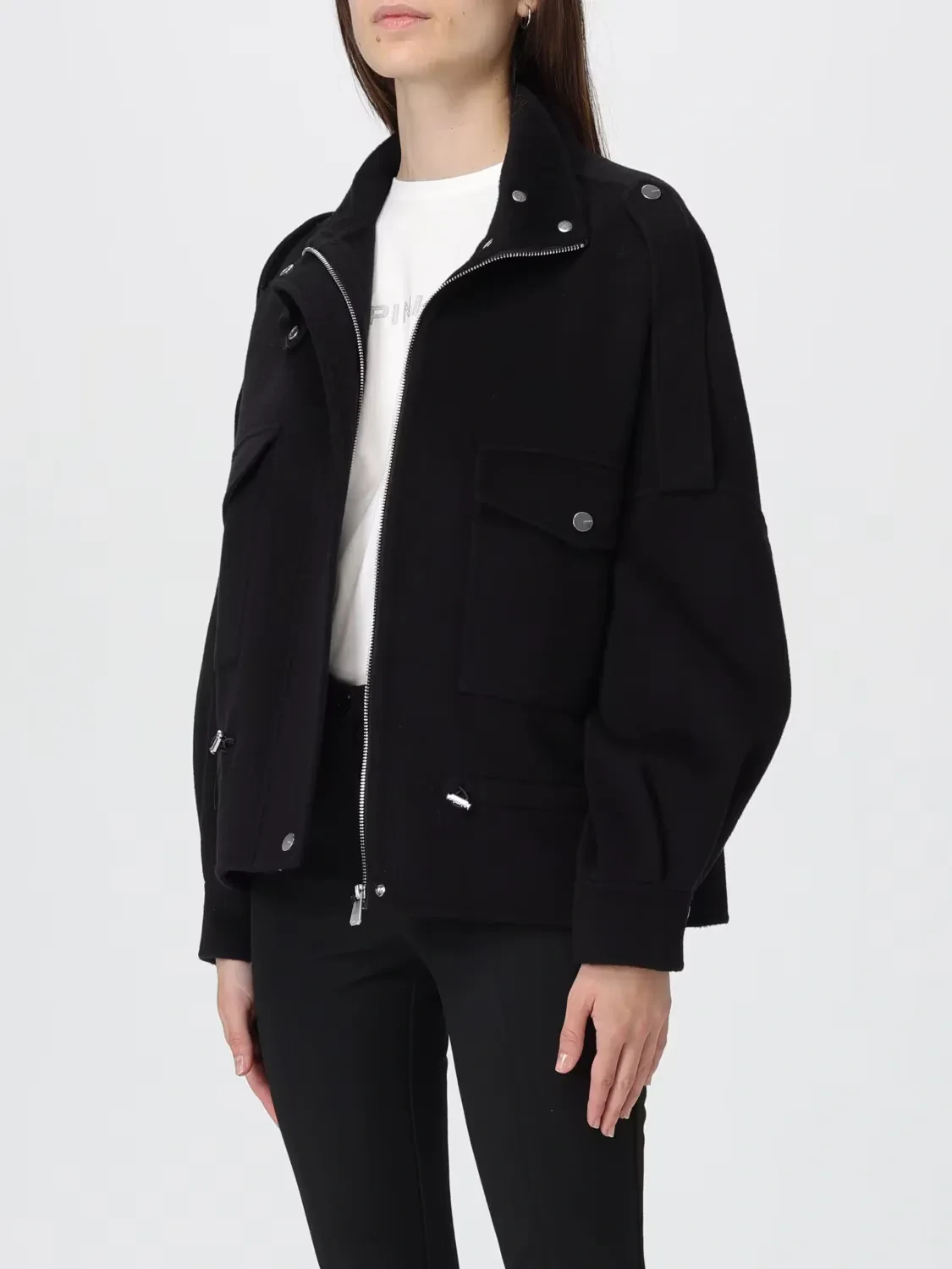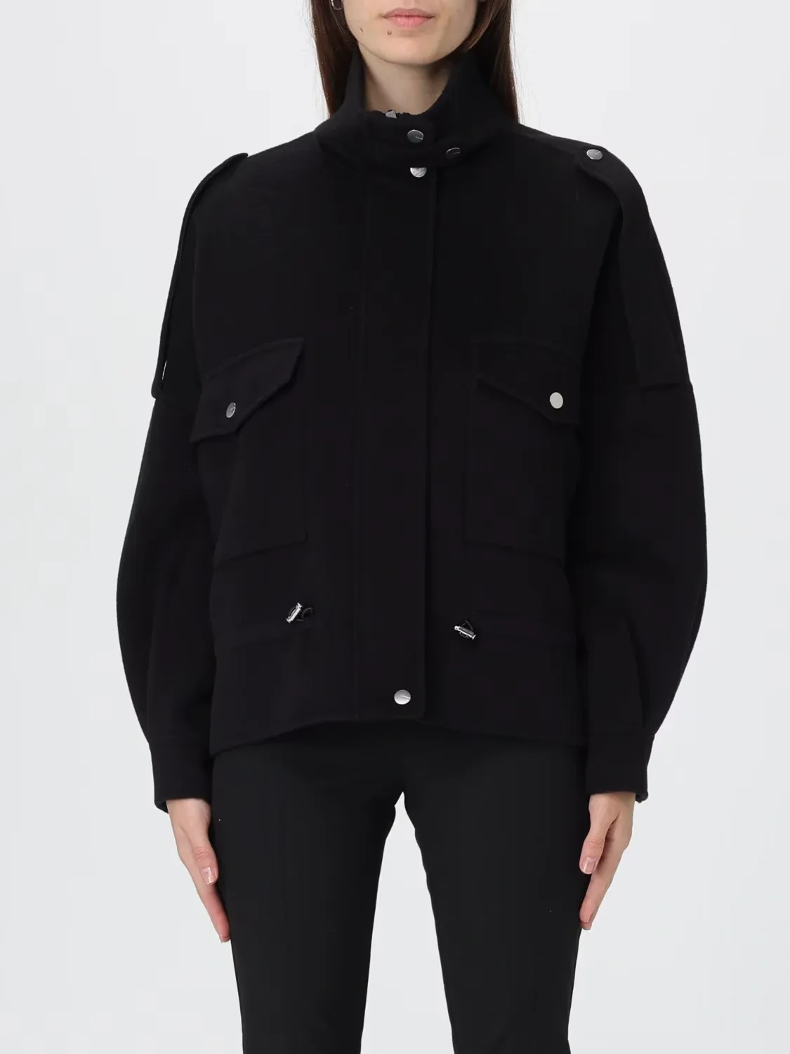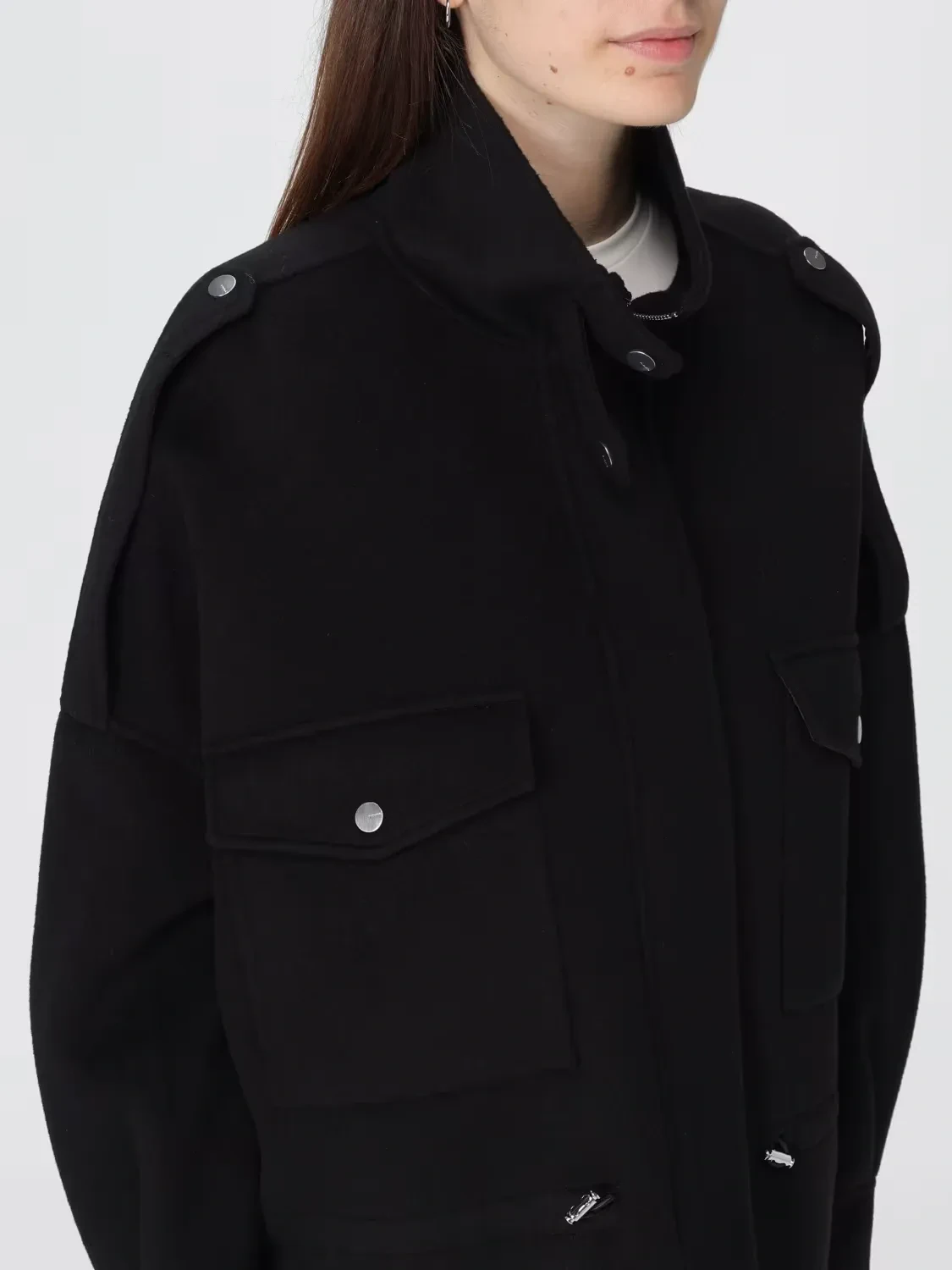 Wool-blend fabric pea coat featuring a high collar with strap, long epaulettes on the shoulders and large utility-style patch pockets on the front with flap and press-stud button. A comfortable trekking-inspired drawstring on the waist allows you to adjust the fit. Concealed press-stud fastening. Lined model. A piece of outerwear that combines functionality and style, this short pea coat is ideal for wearing for everyday engagements, even when the weather is unpredictable.
