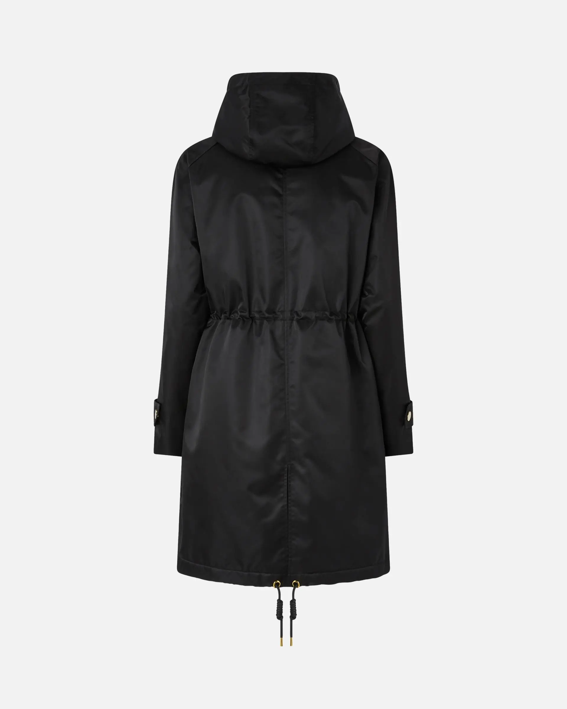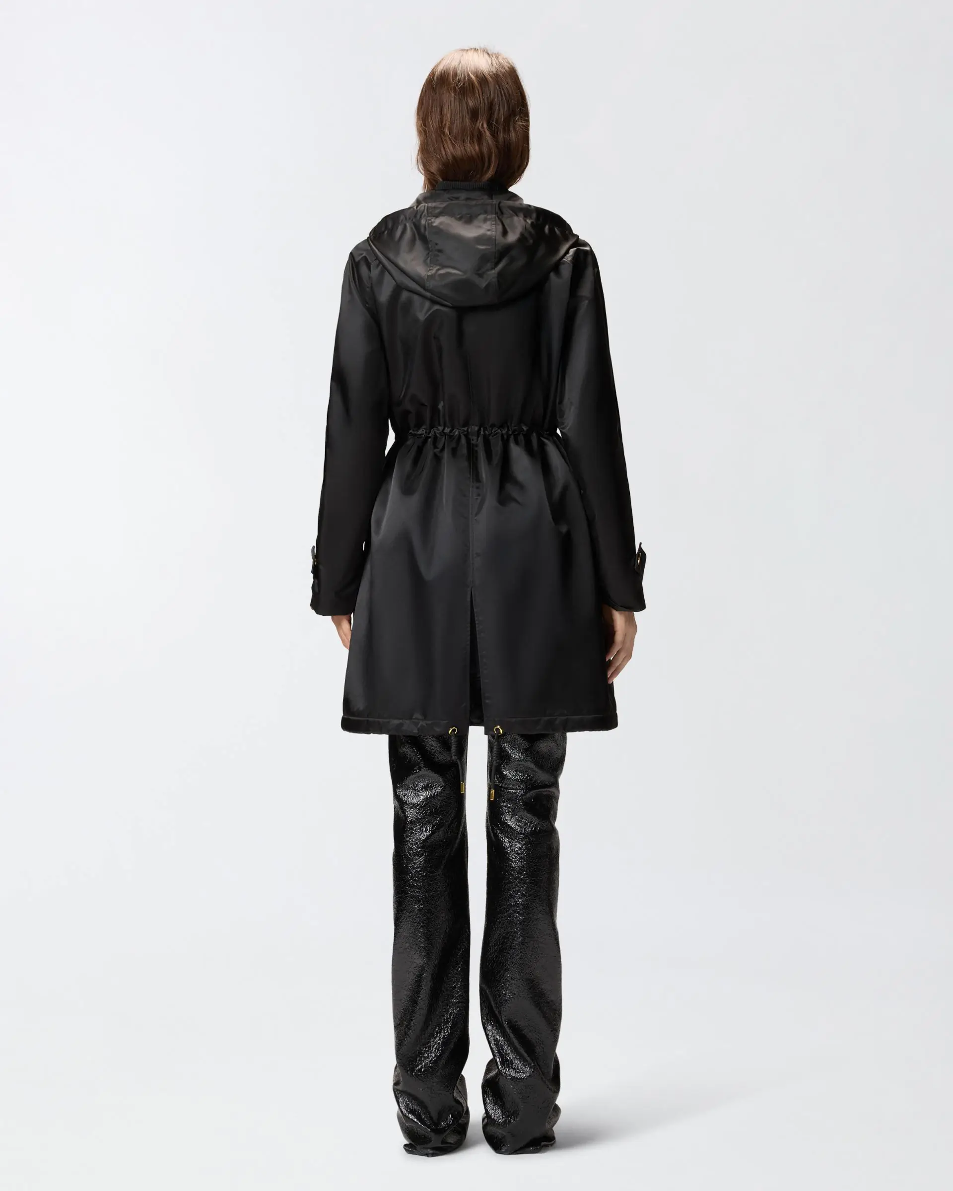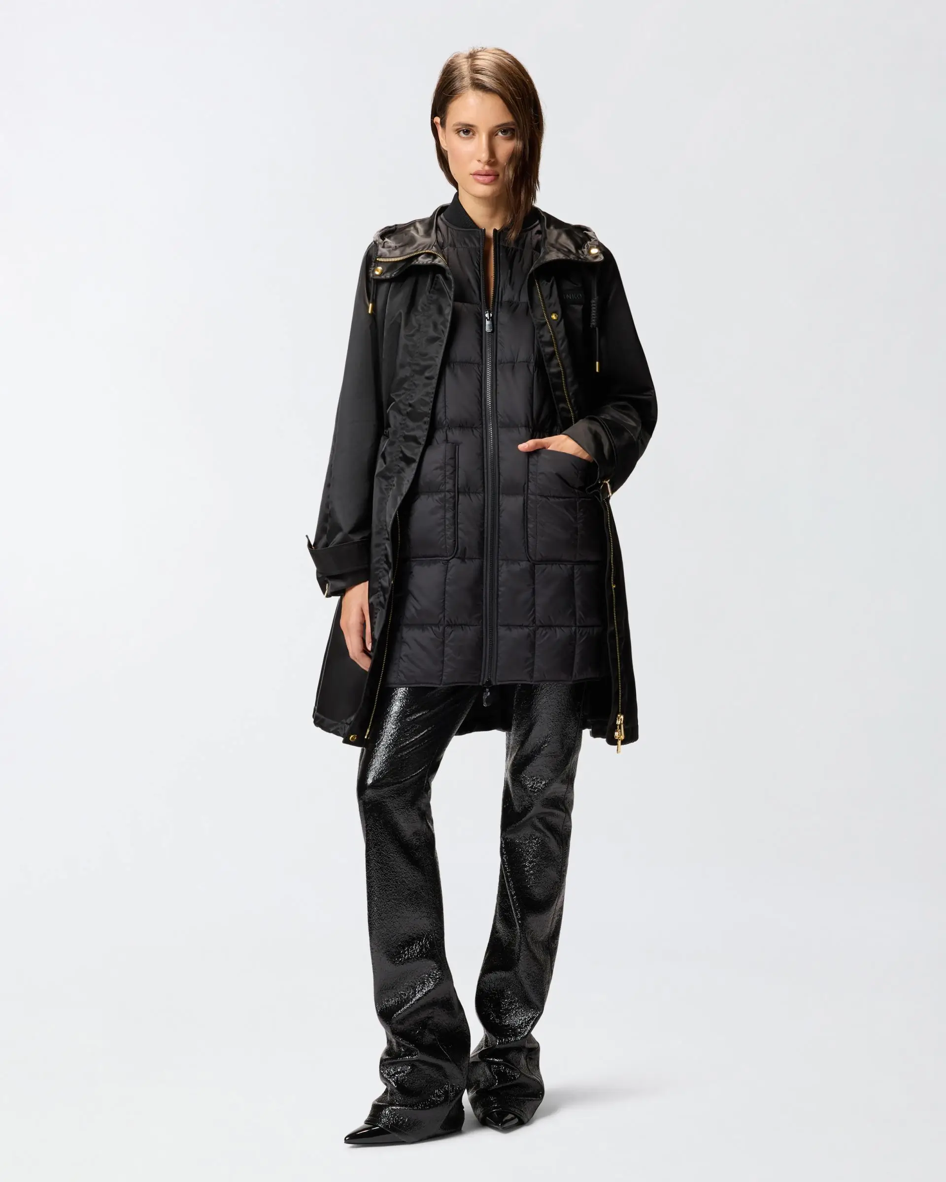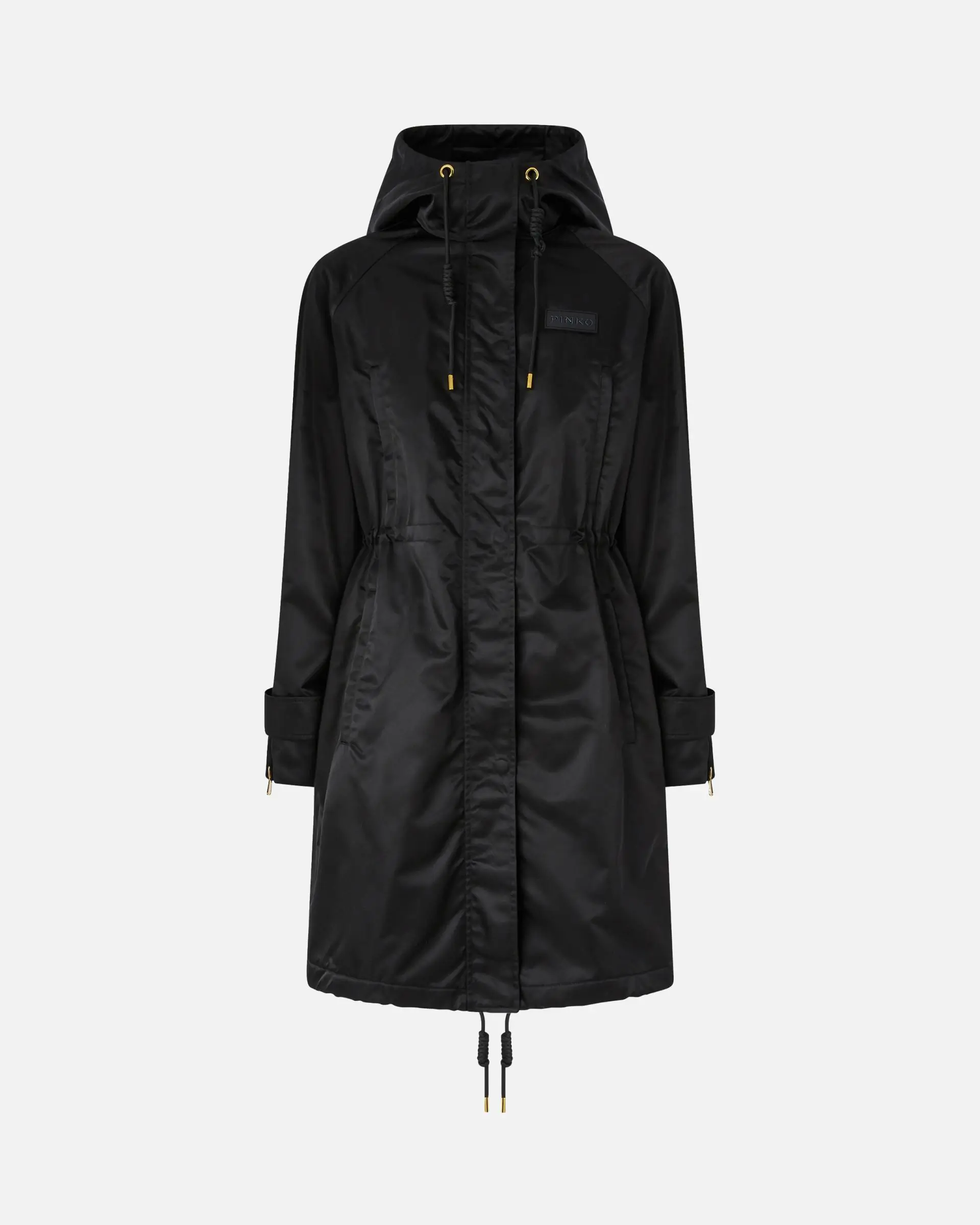 Long down jacket with highly functional design, featuring a high neck with hood, chest pockets and drawstrings at the neck and hem to adjust the fit as needed. The glossy canvas used to make it and practical details, including concealed front fastening and press stud-fastened cuff straps, emphasise the minimalist aesthetic of this outerwear garment, which is perfect for braving bad weather and more in style. The style is completed by a tone-on-tone label with the PINKO lettering logo on the left side of the chest.