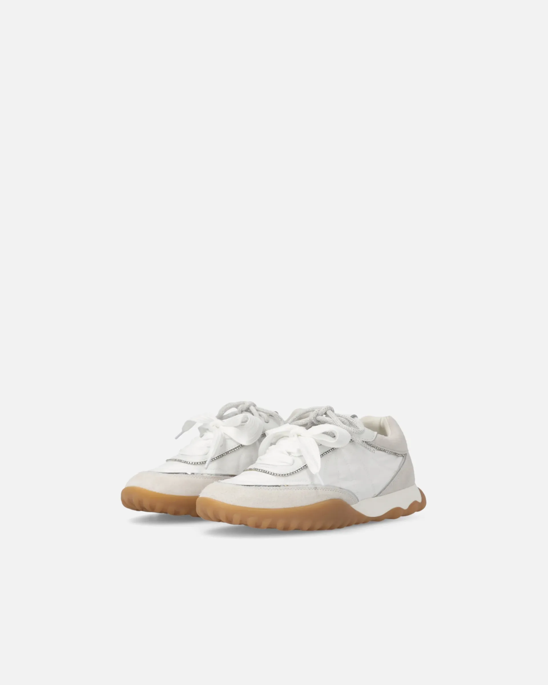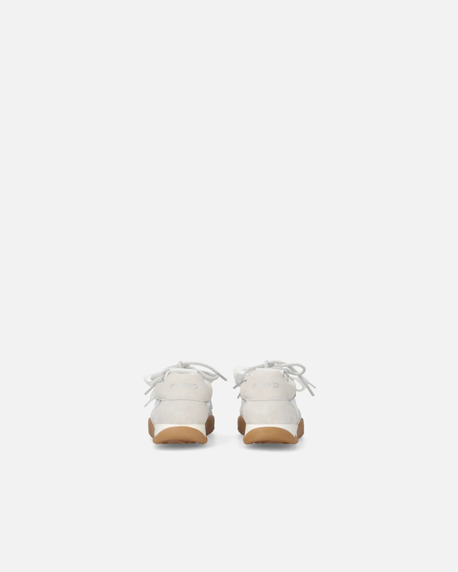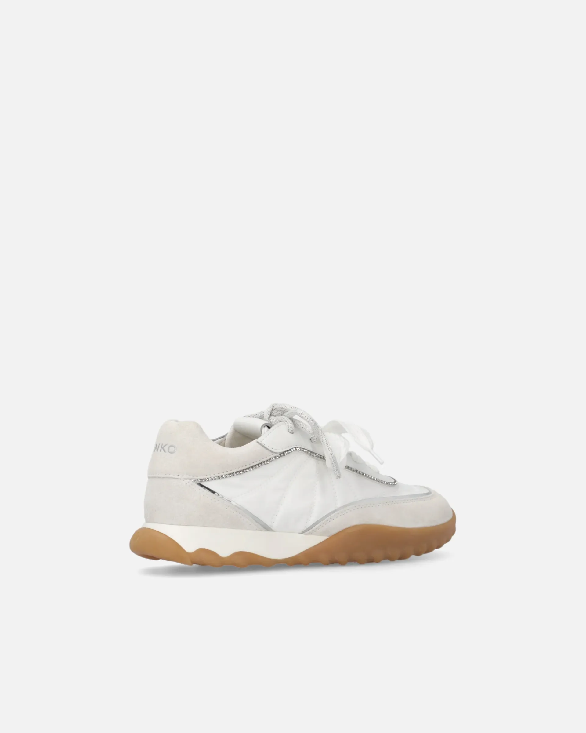 Suede and technical fabric sneakers finished with matching shiny piping on the upper and piping with mini studs along the vamp. In addition to the classic flat laces, the model is adorned with a double version of laces: with graphic details or with a glittery finish, for a subtle touch of radiance. The PINKO logo lettering decorates the tongue, while the comfortable two-tone rubber outsole is complete with an all-over Love Birds logo embossed on the tread. An ideal model for those who like to stand out in style without sacrificing practicality.