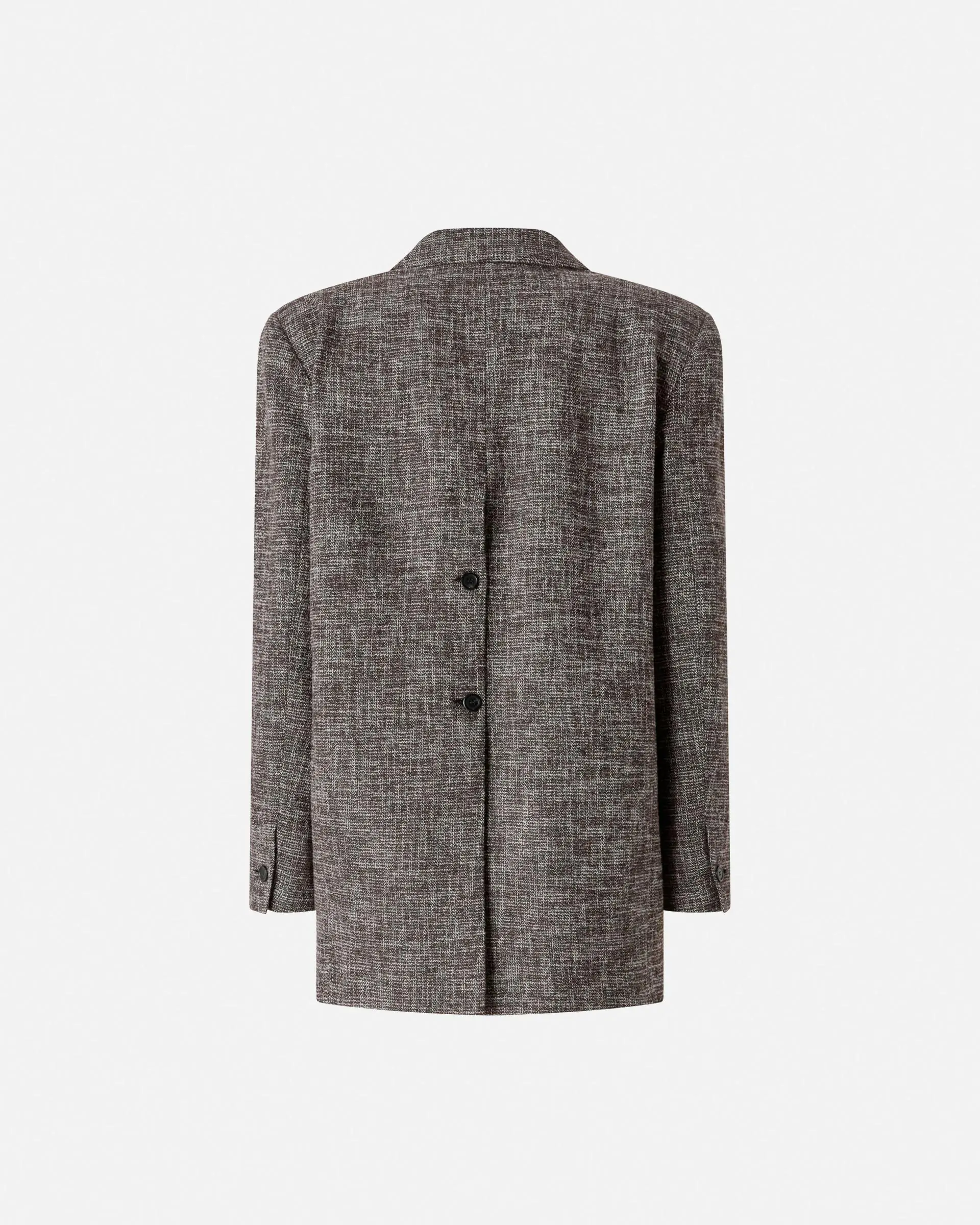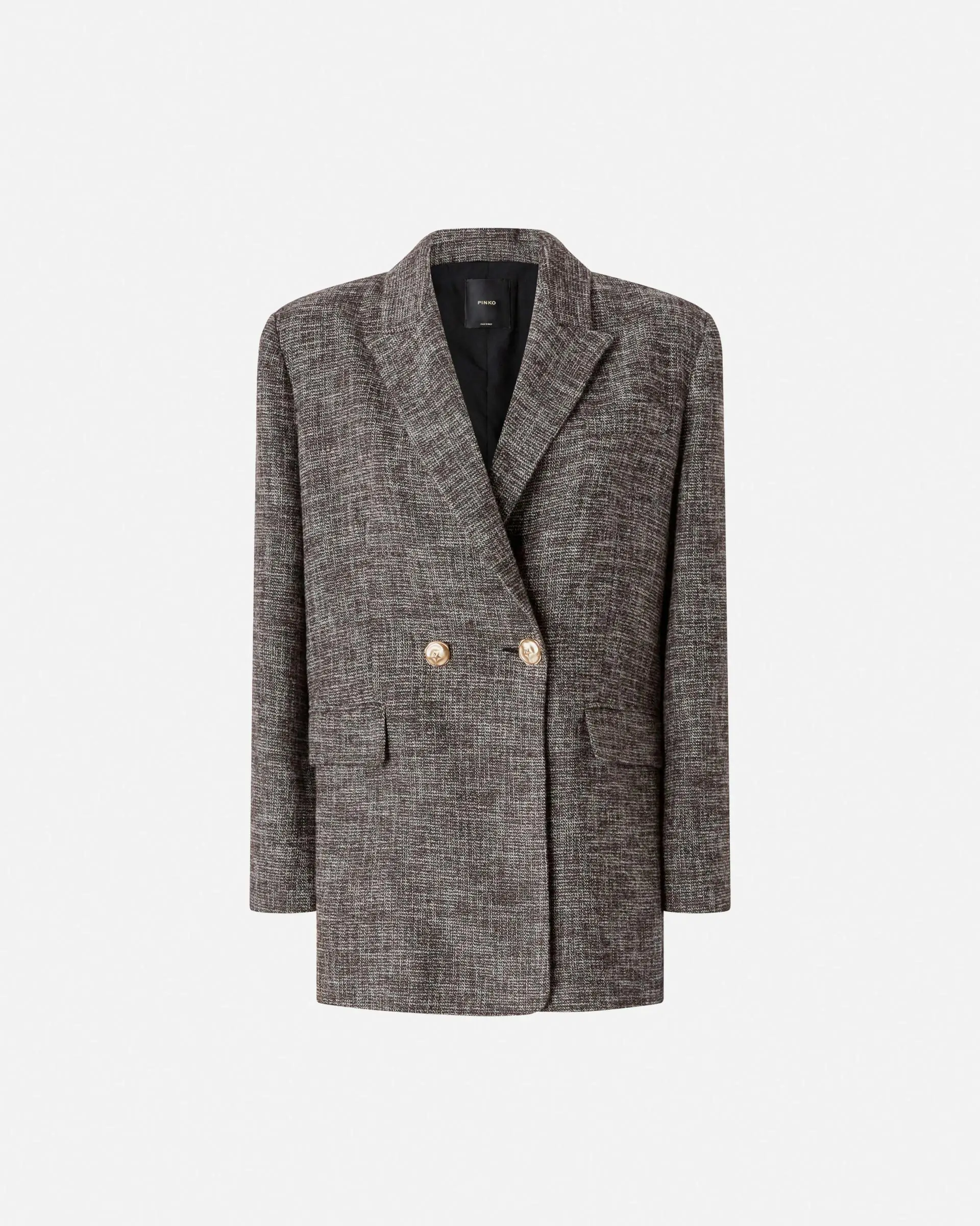 Double-breasted blazer with a straight cut and an oversized fit with lapel collar and front flap pockets. This garment is made from flannel with a pleasant and warm hand and features a classic-inspired tweed design. The style features a front fastening with metal star-decorated buttons and a rear slit, which is also buttoned. Pair the blazer with the trousers in the same fabric to create an elegant yet contemporary outfit.