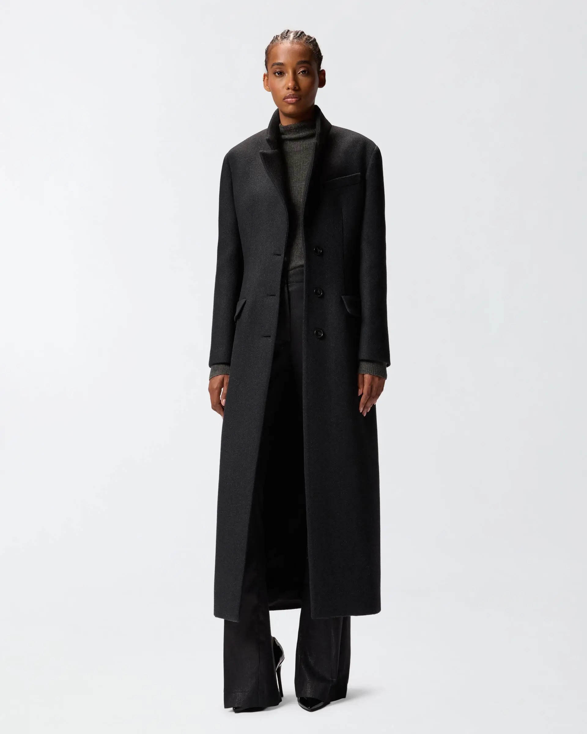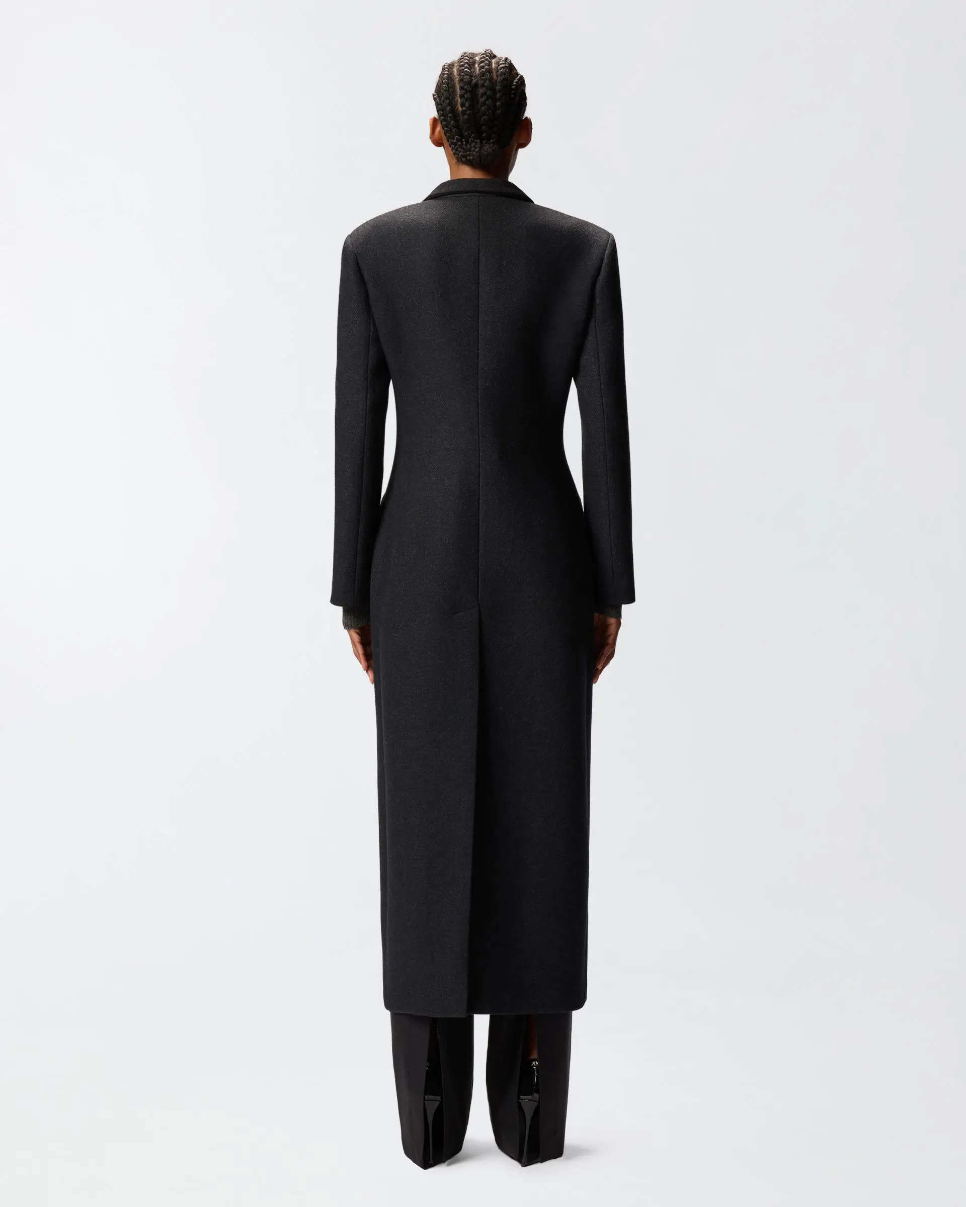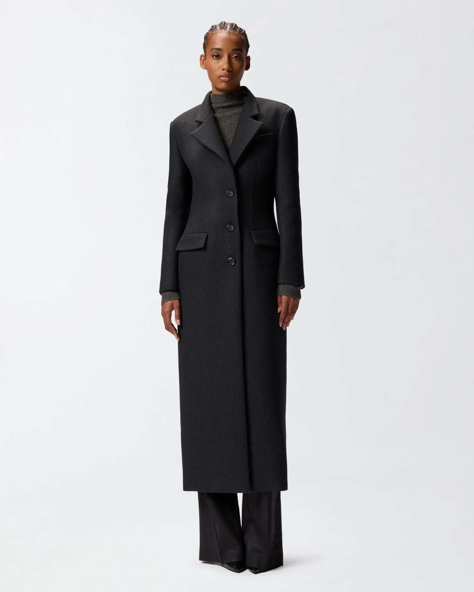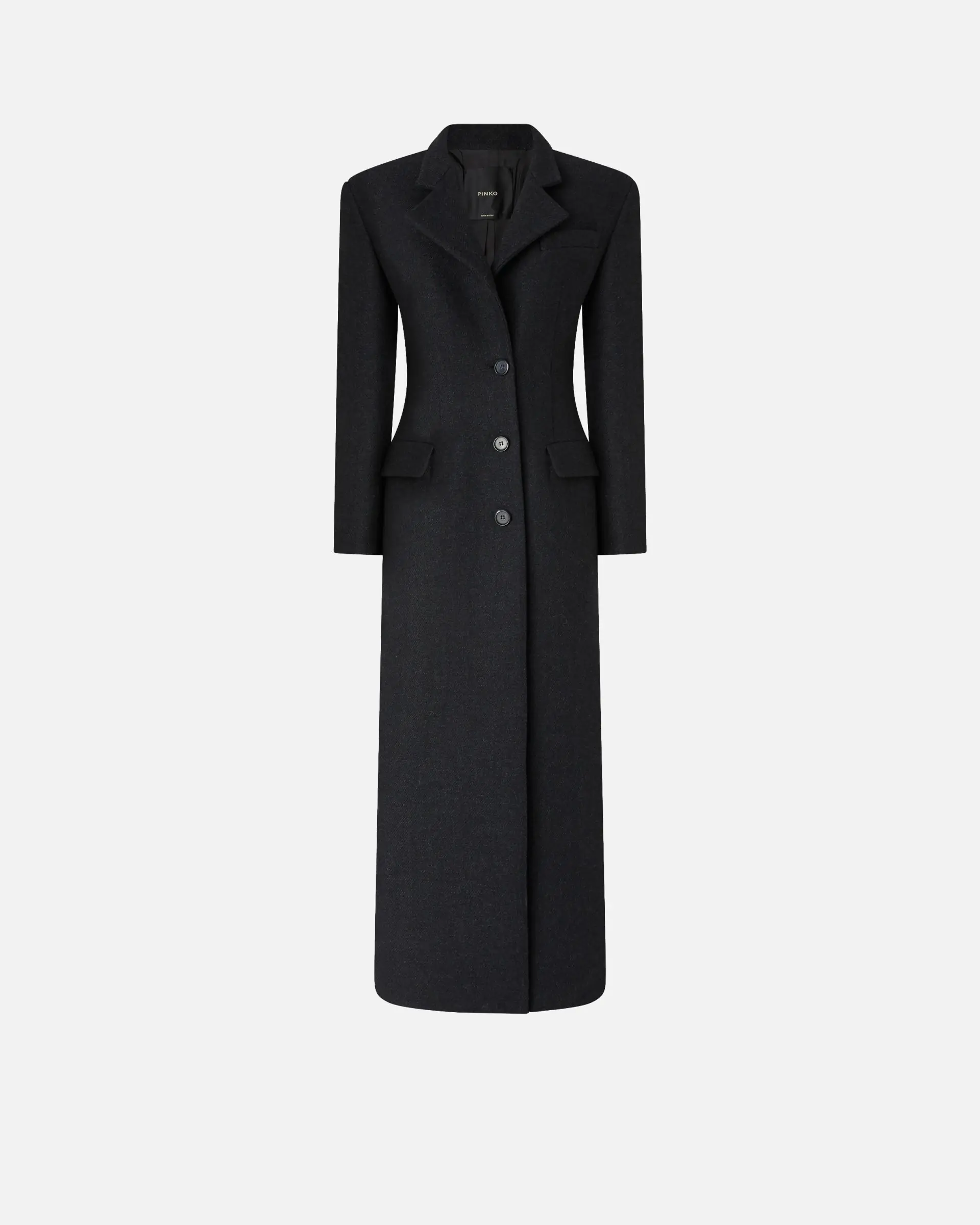 Long, single-breasted, fitted-waist coat in soft wool-blend cloth with lapel collar, structured shoulders and flap pockets. The long asymmetric seam at the back and off-centre button fastening at the front help reinvent a classic design, resulting in an understated yet classy item brimming with that signature PINKO style and destined to become a new cold-season staple.
