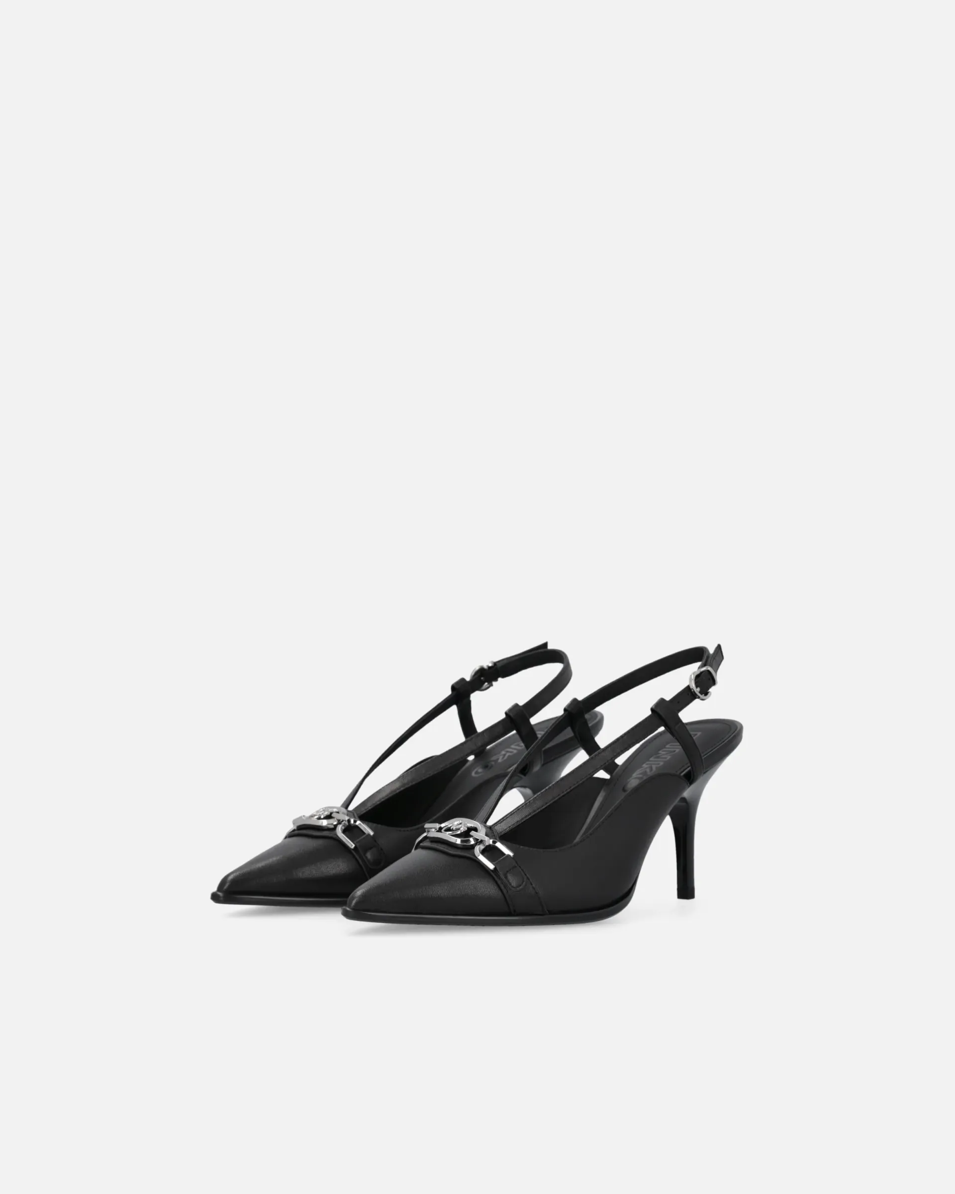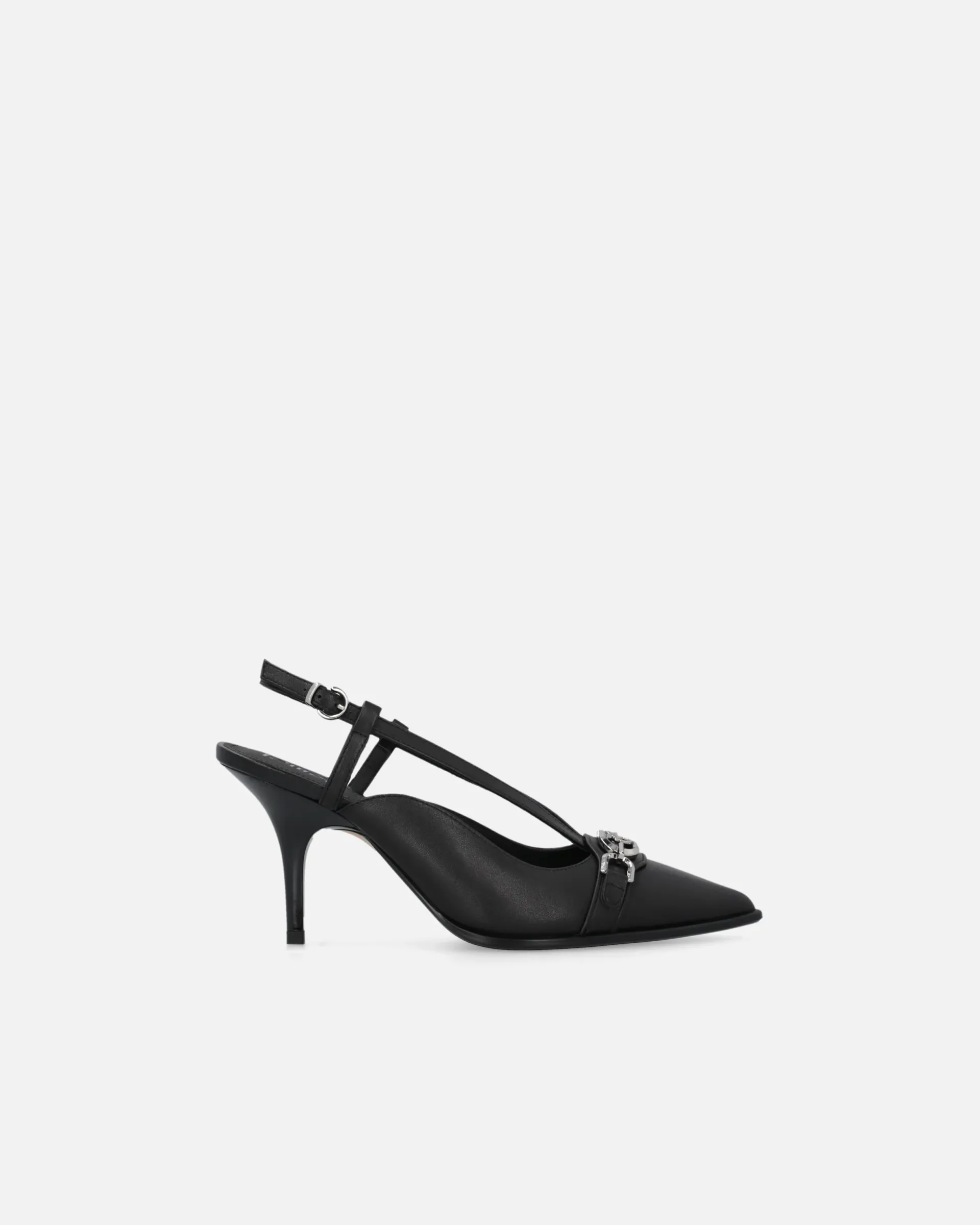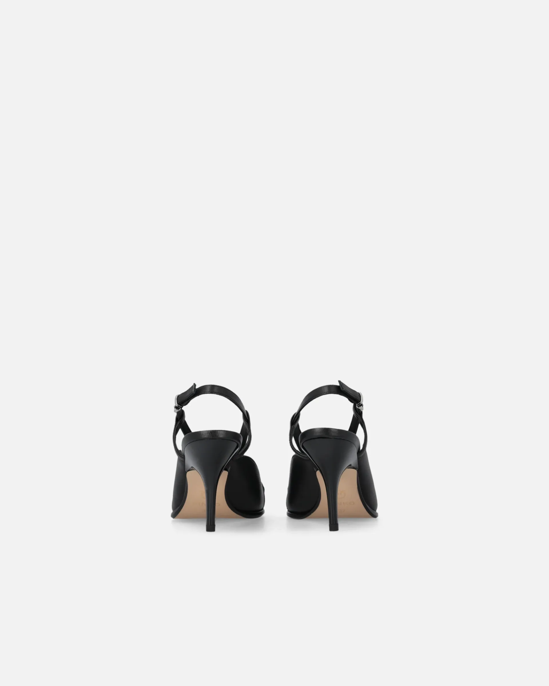 Tapered soft nappa leather pumps, featuring a slim toe and feminine silhouette. The sling-back design with an adjustable heel strap ensures a secure fit and enhances the profile of the foot, while the thin straps on the collar add a contemporary graphic detail. The stiletto heel slims the figure with elegance, making the model perfect to complete office looks, evening outfits or bolder combinations with an urban taste. A sophisticated balance between sensuality and character, designed for a modern and decisive femininity.