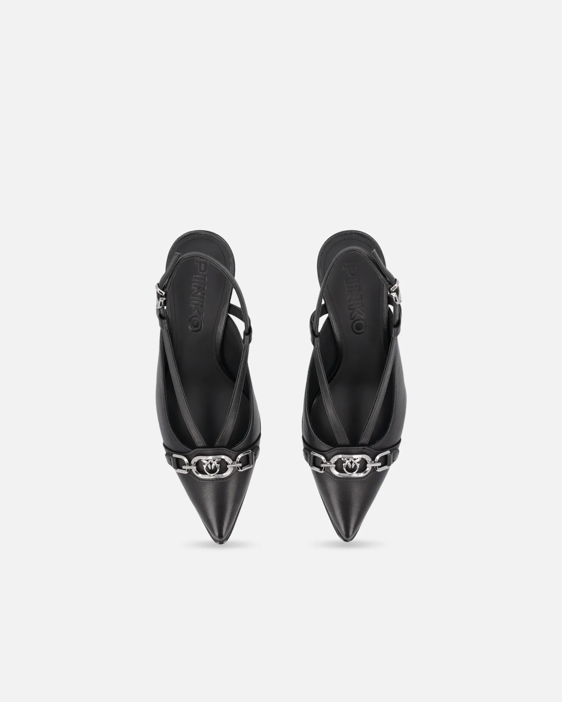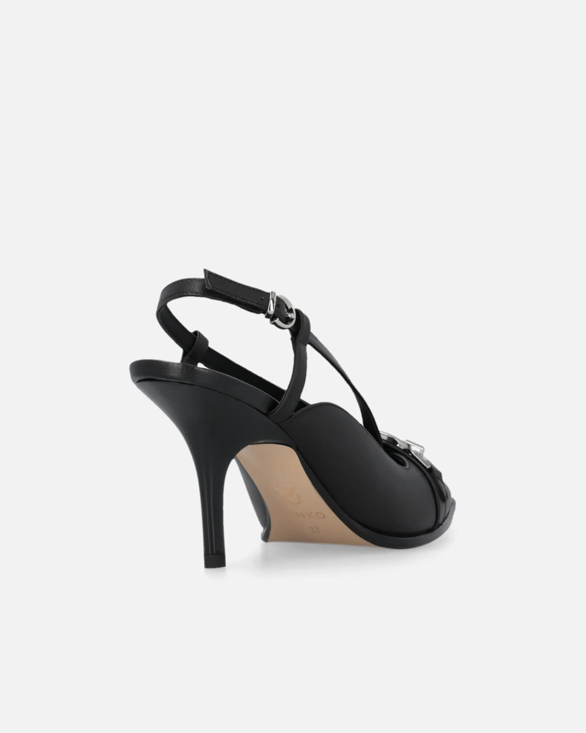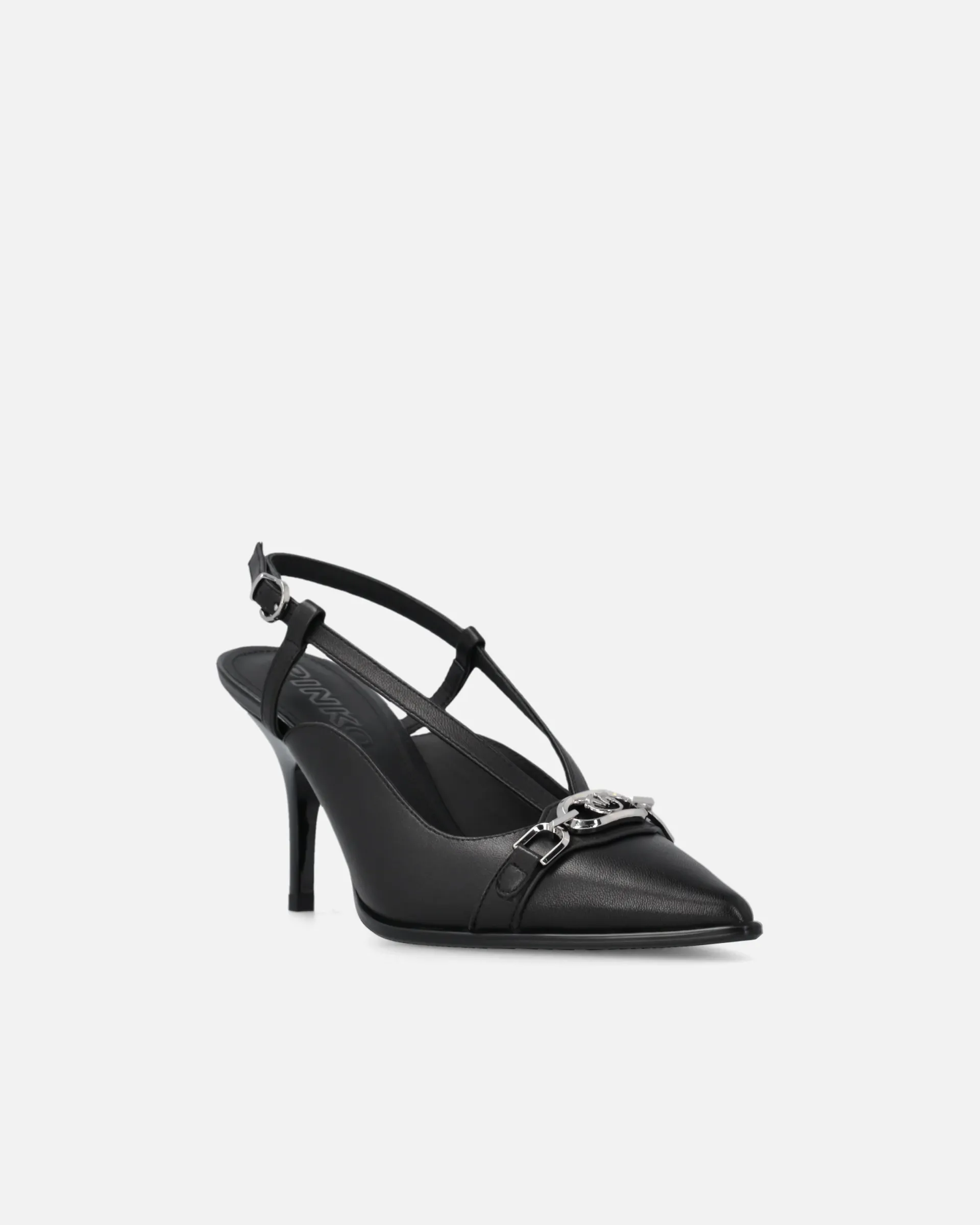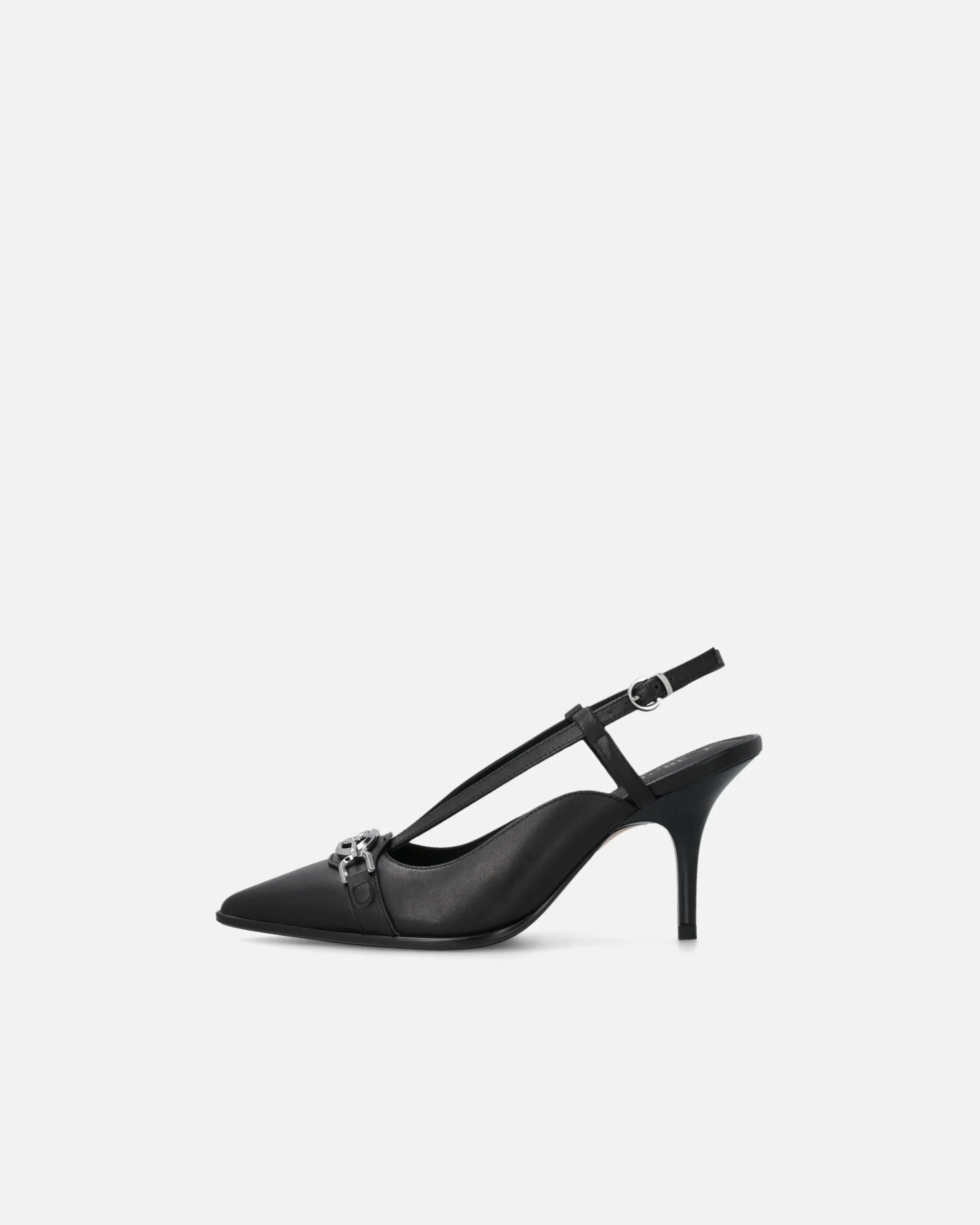 Tapered soft nappa leather pumps, featuring a slim toe and feminine silhouette. The sling-back design with an adjustable heel strap ensures a secure fit and enhances the profile of the foot, while the thin straps on the collar add a contemporary graphic detail. The stiletto heel slims the figure with elegance, making the model perfect to complete office looks, evening outfits or bolder combinations with an urban taste. A sophisticated balance between sensuality and character, designed for a modern and decisive femininity.