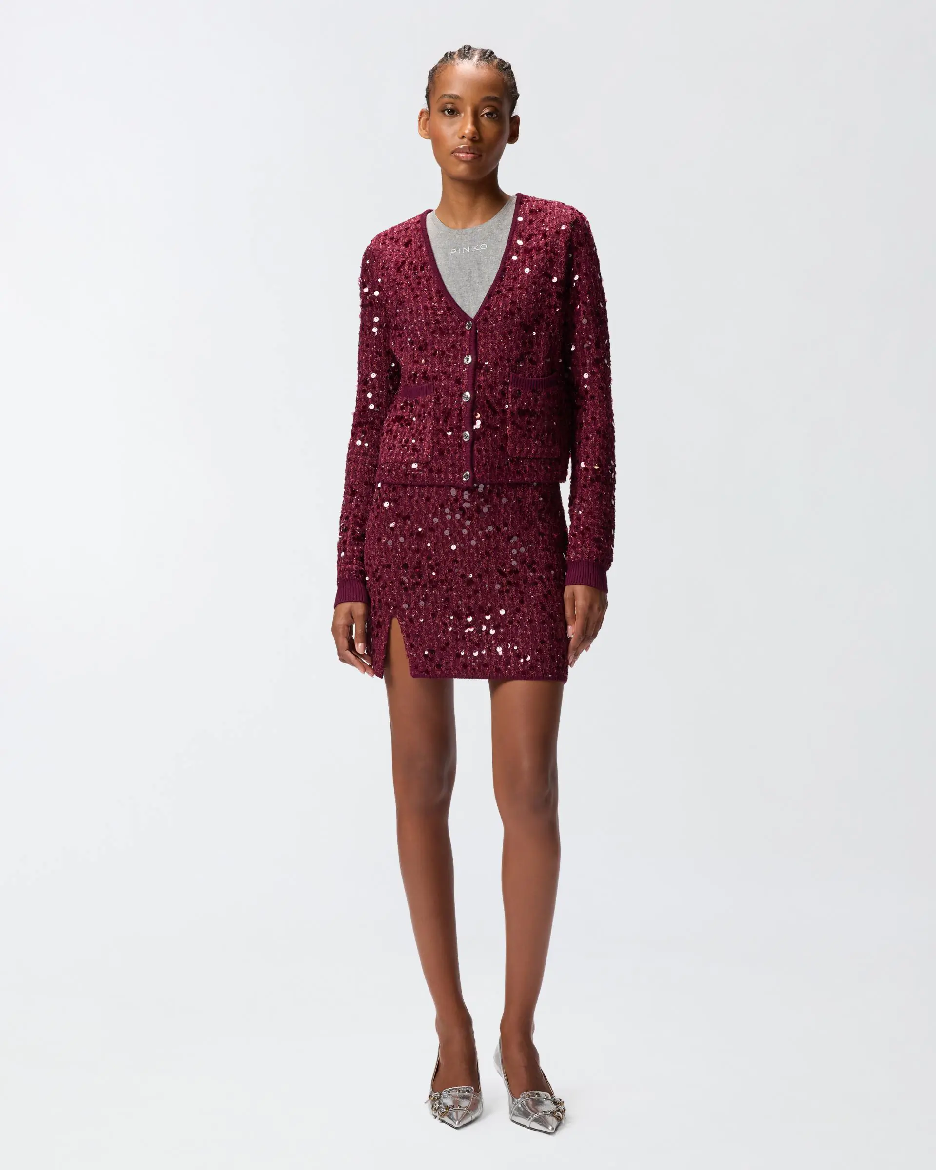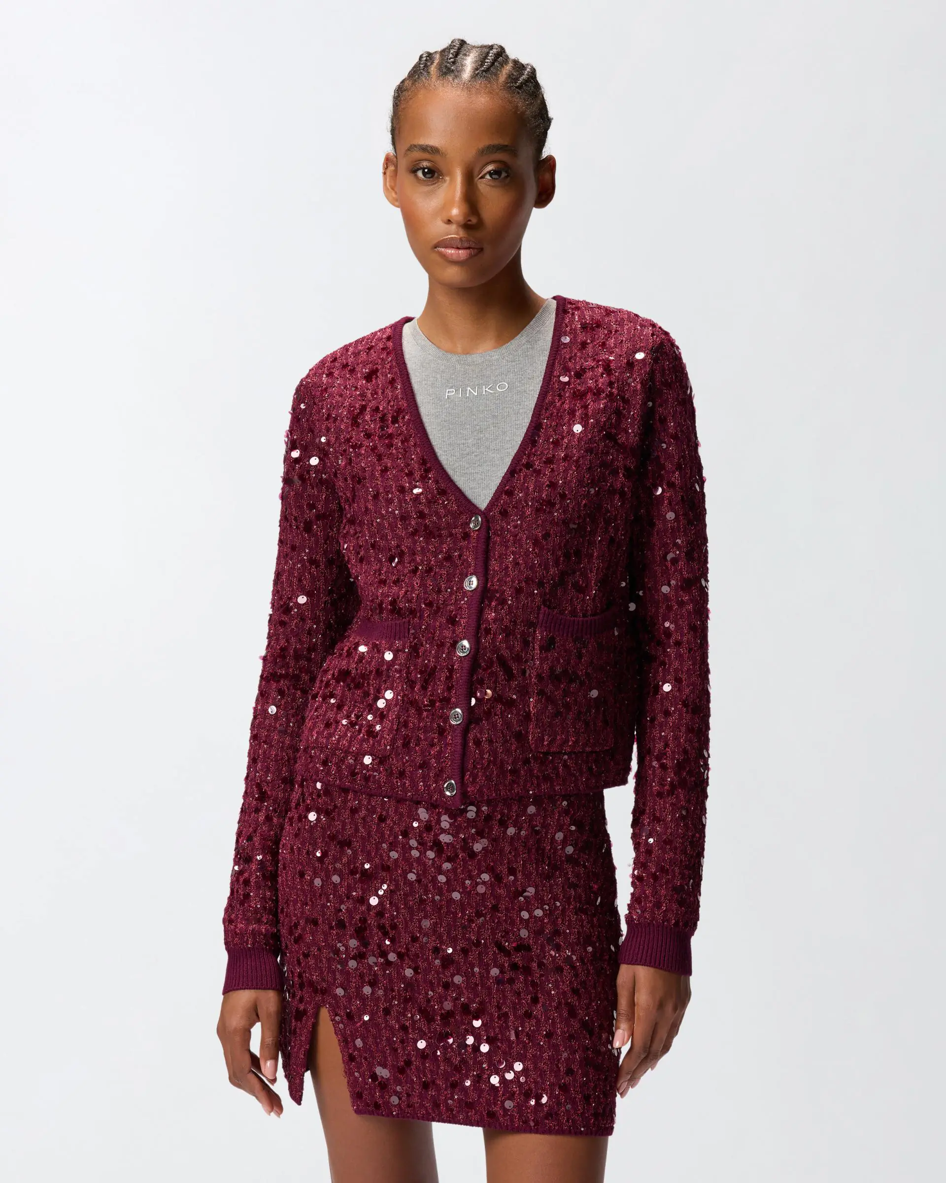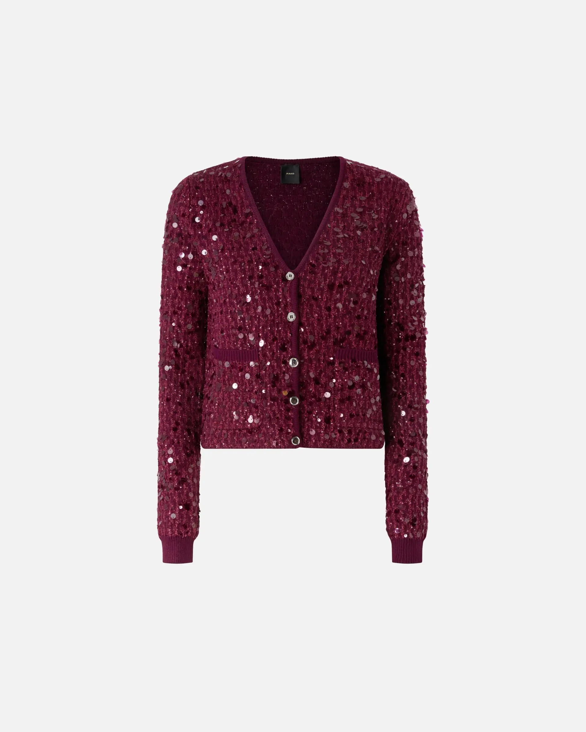 V-neck cardigan with front button placket, made from viscose yarn that provides a compact yet soft effect. The countless sequins all over are the real star of the piece: the end result is sparkling, feminine and functional garment. The piece has undergone finishing tests to minimise the possible formation of pilling, ensuring greater fabric softness and durability.