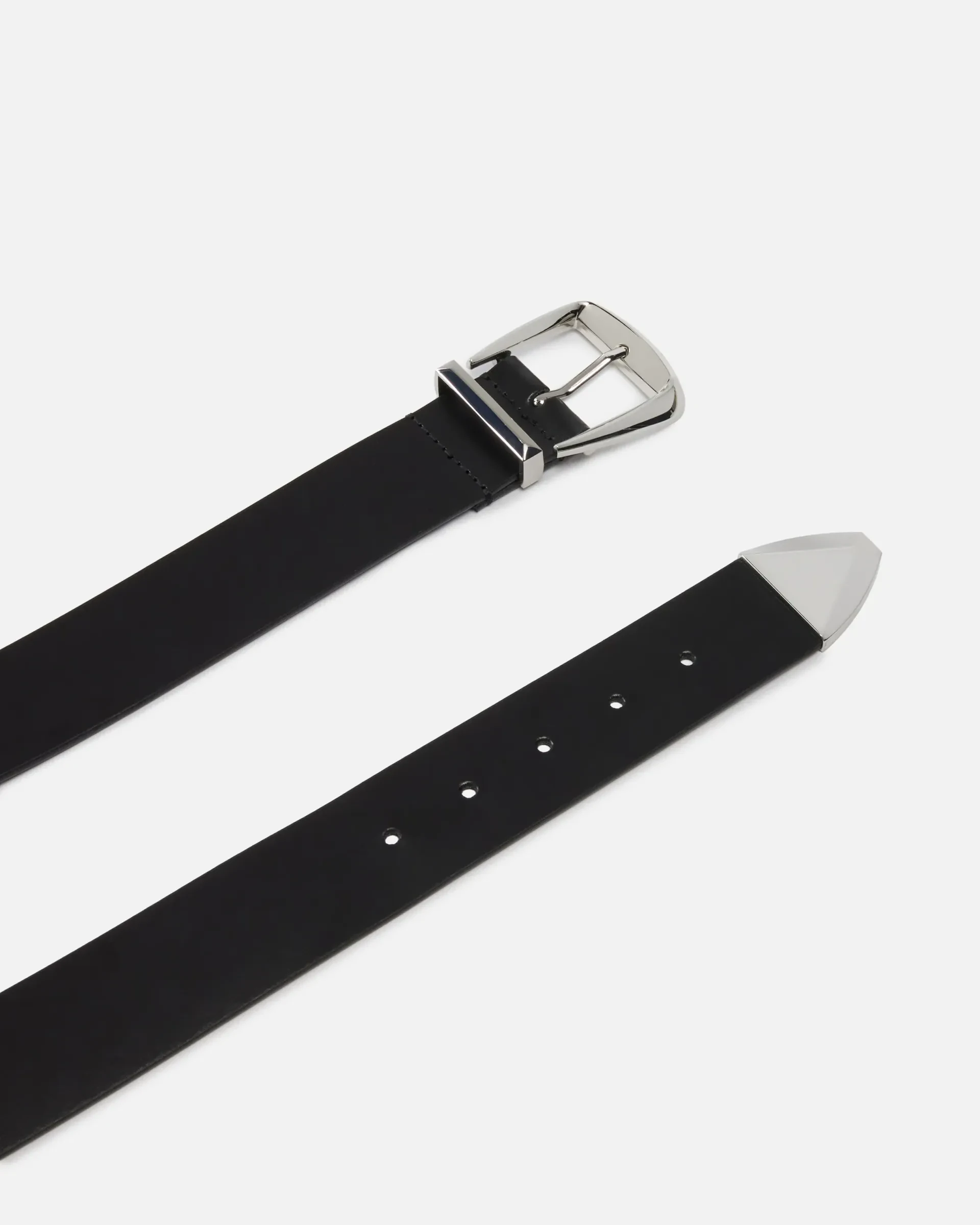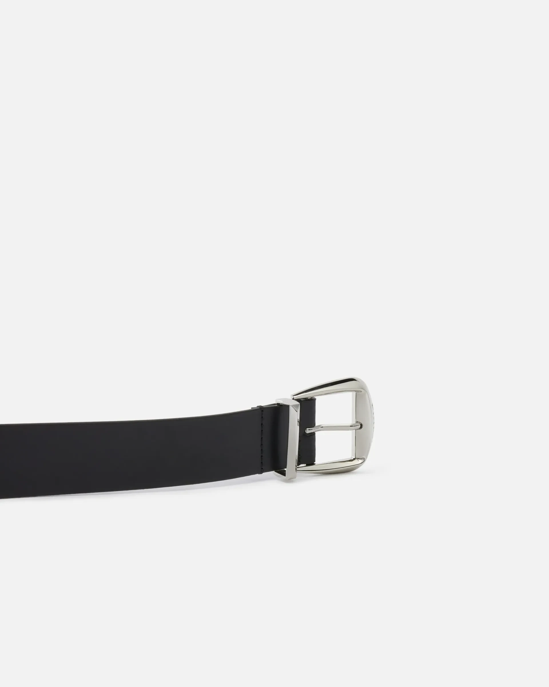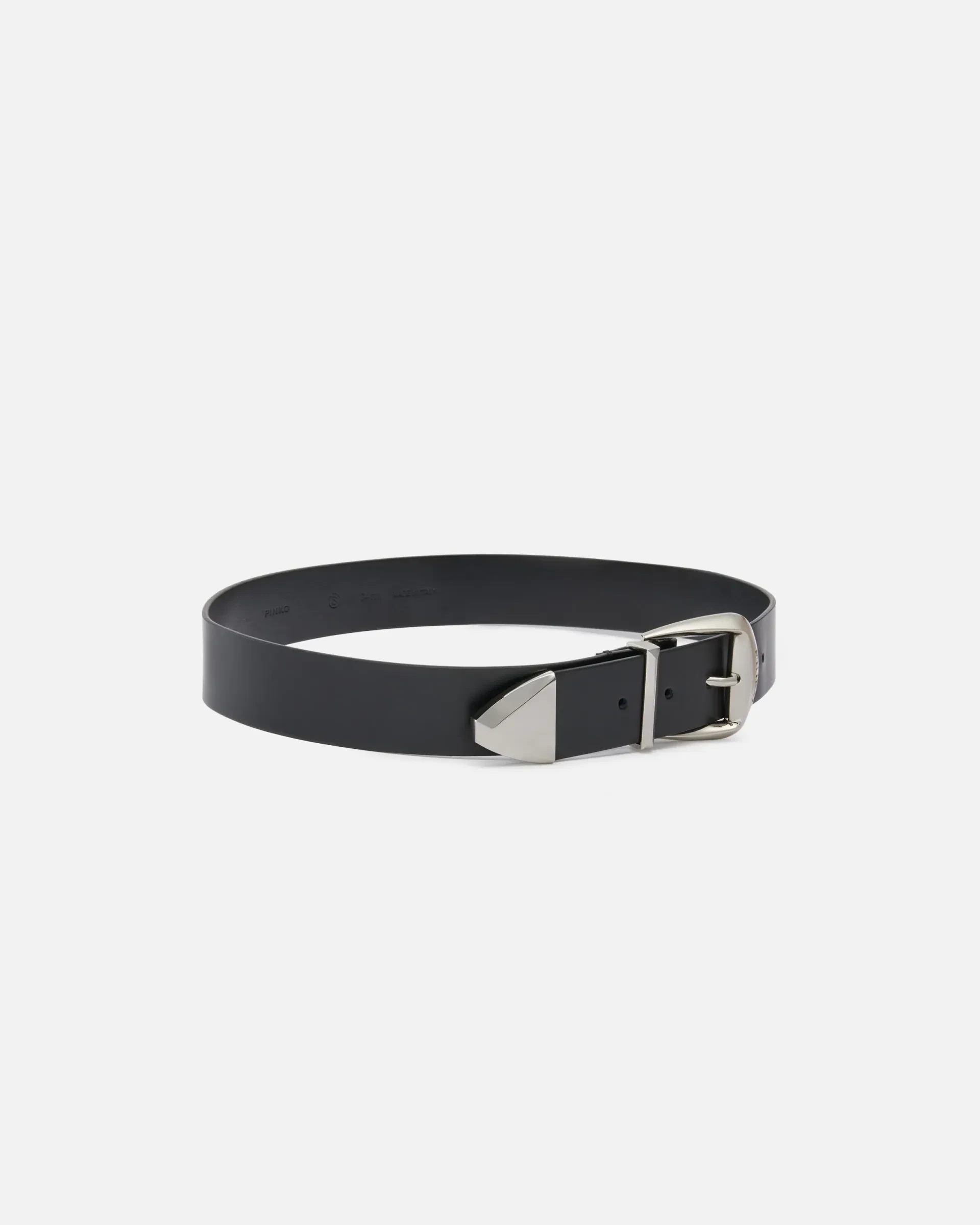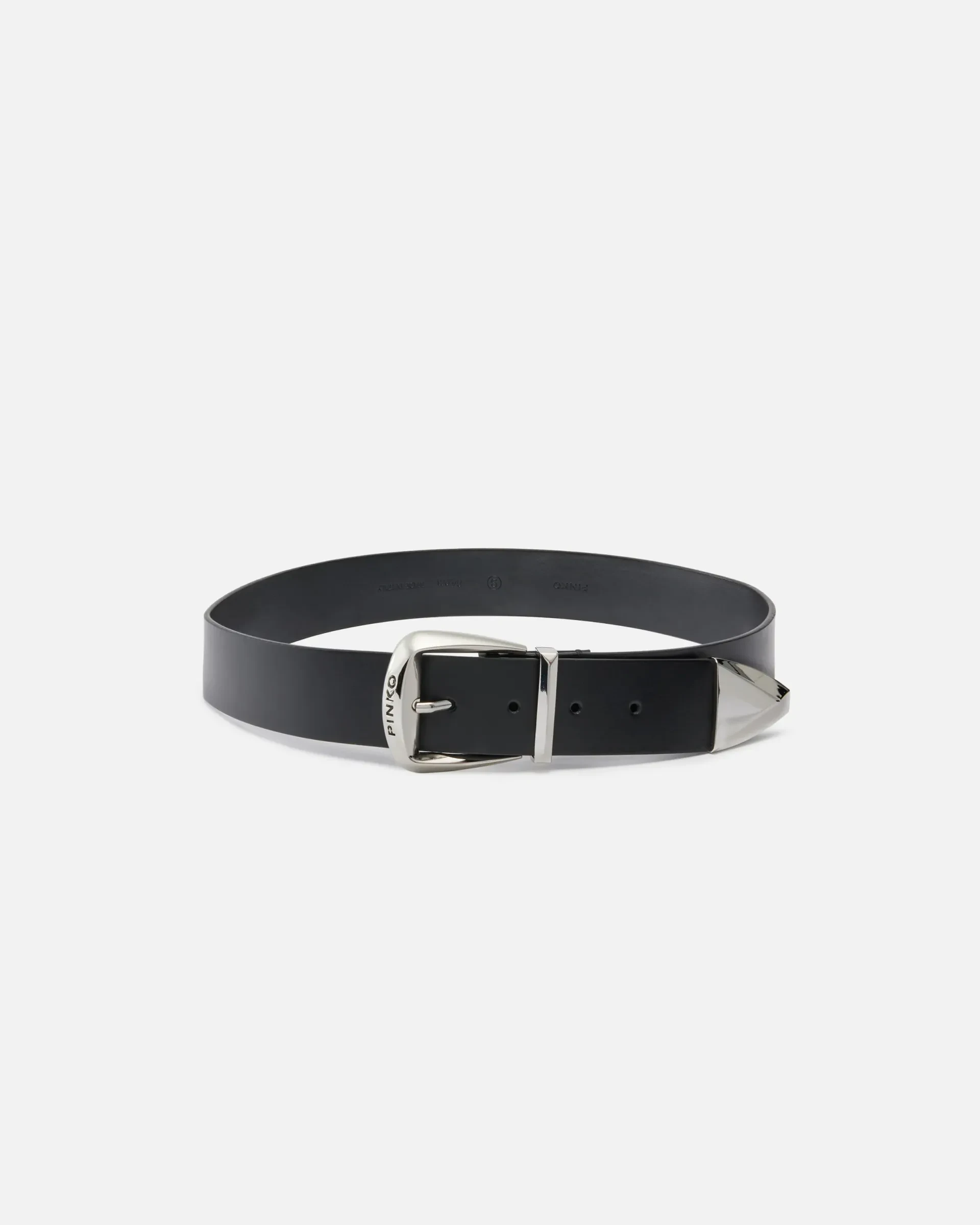 4-cm belt in smooth leather with loop. This model stands out for the buckle bearing the iconic PINKO logo lettering and the pointed tip at the end, both of which are made from silver-electroplated metal. Understated yet striking, this accessory is perfect for a bold but classy vibe.
