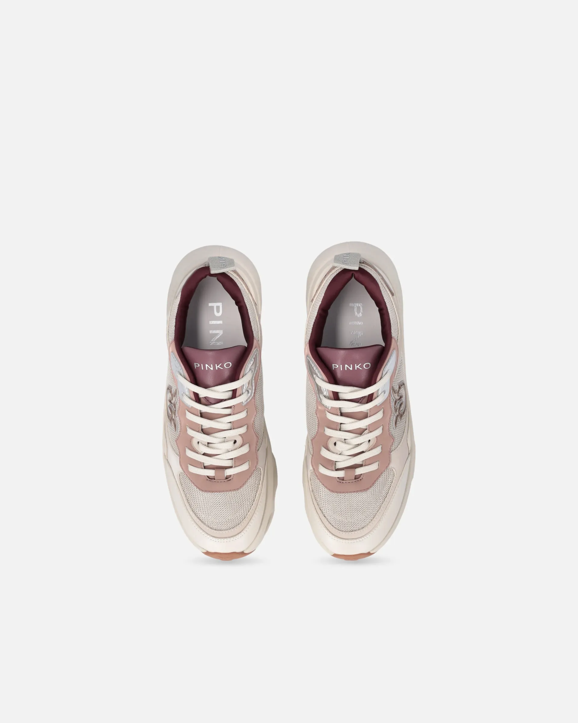 Lace-up sneakers with pull tab on the heel for ease of wear. The upper features a refined effect of tactile and visual contrasts created by the combination of mesh, smooth leather inserts and laminated leather details, for a touch of elegance that has always set the brand apart. The PINKO logo lettering adorns the tongue and insole, while a raised Love Birds logo appears on the sides of the sneakers. The perforated platform sole features an additional rubber appliqué on the bottom, dotted with an all-over Love Birds logo motif. A contemporary take on a sports wardrobe classic, these sneakers bring a glamorous touch of pure PINKO style to your everyday outfits.