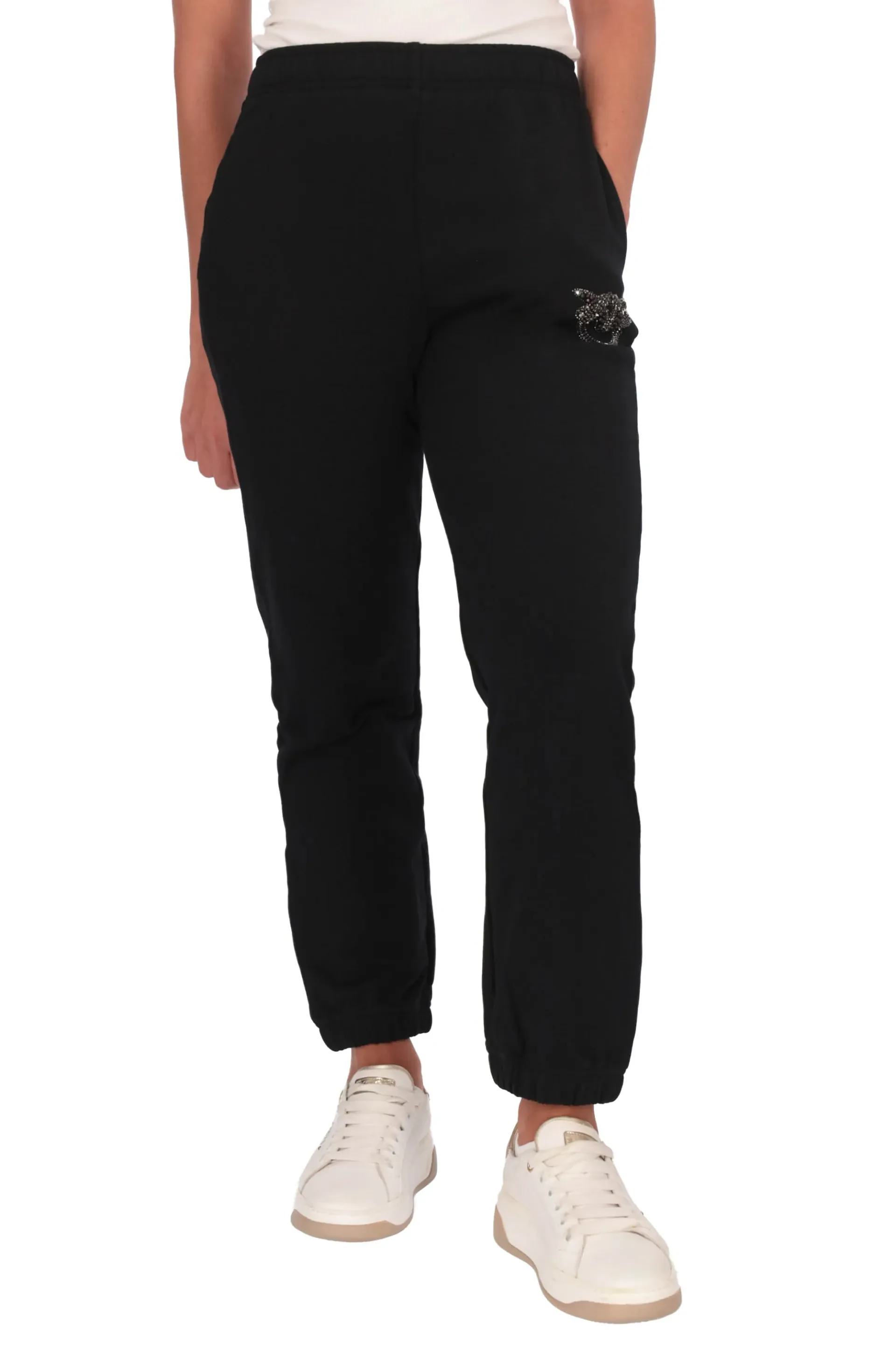 The trousers are made of cotton, with a rhinestone logo on the side.