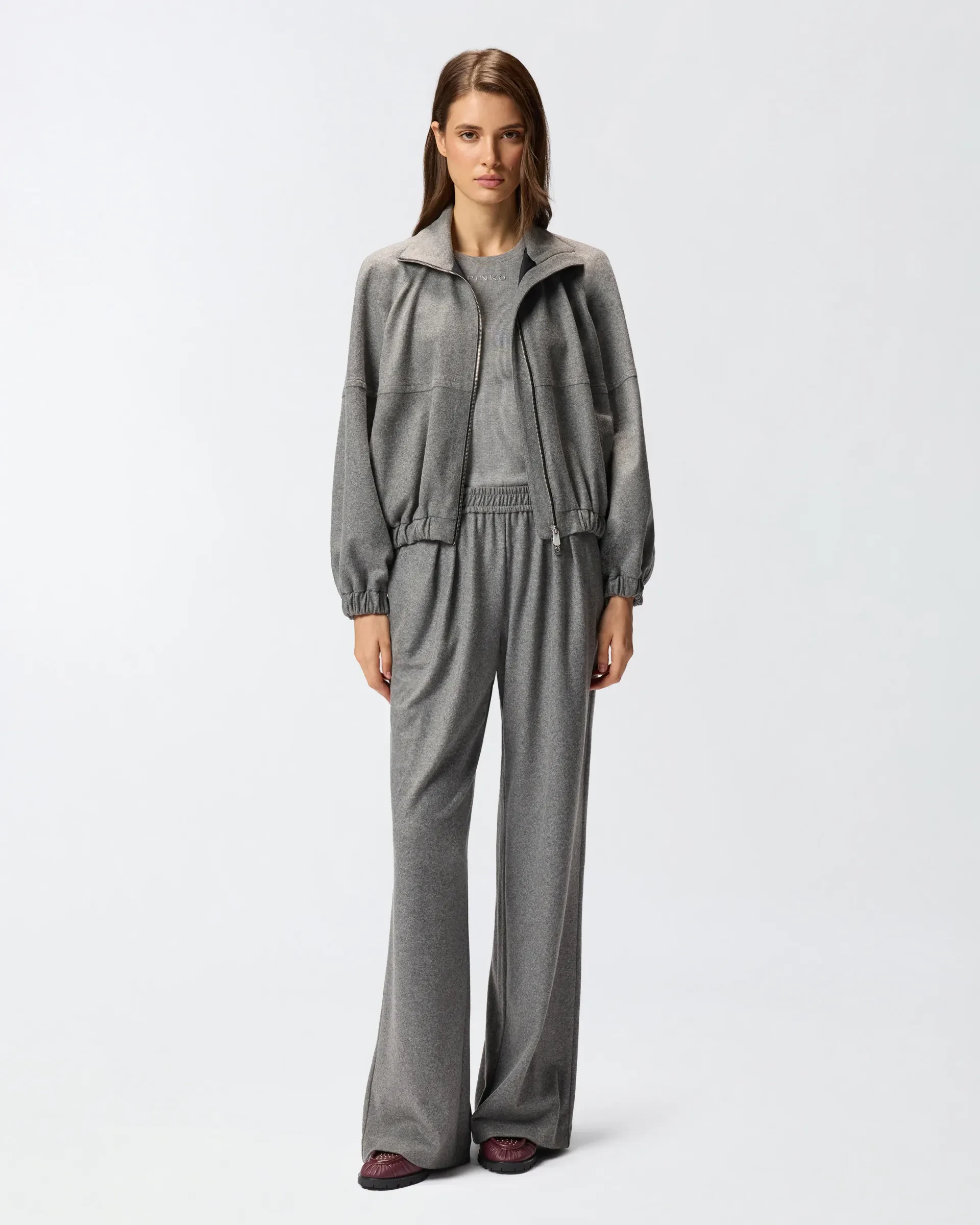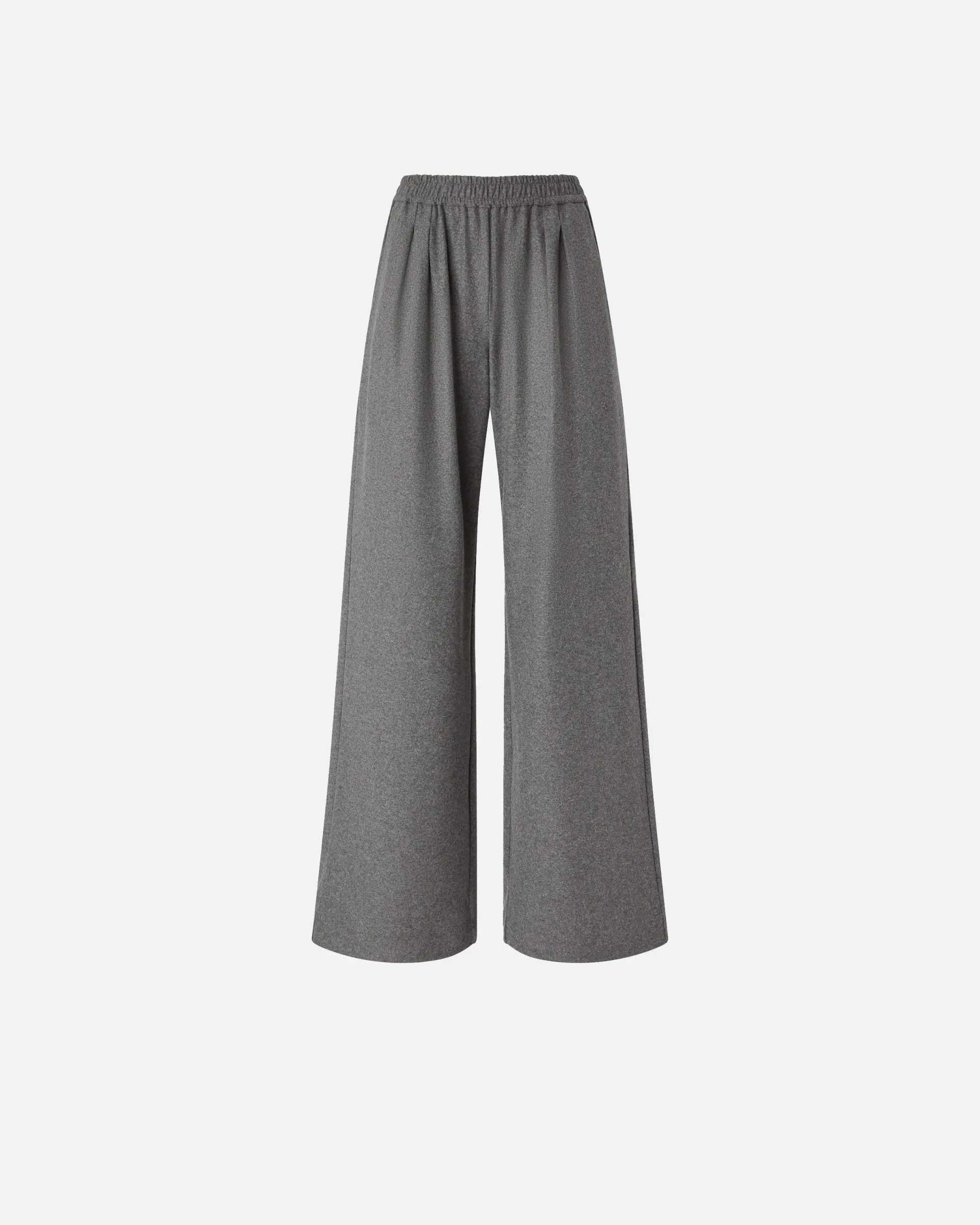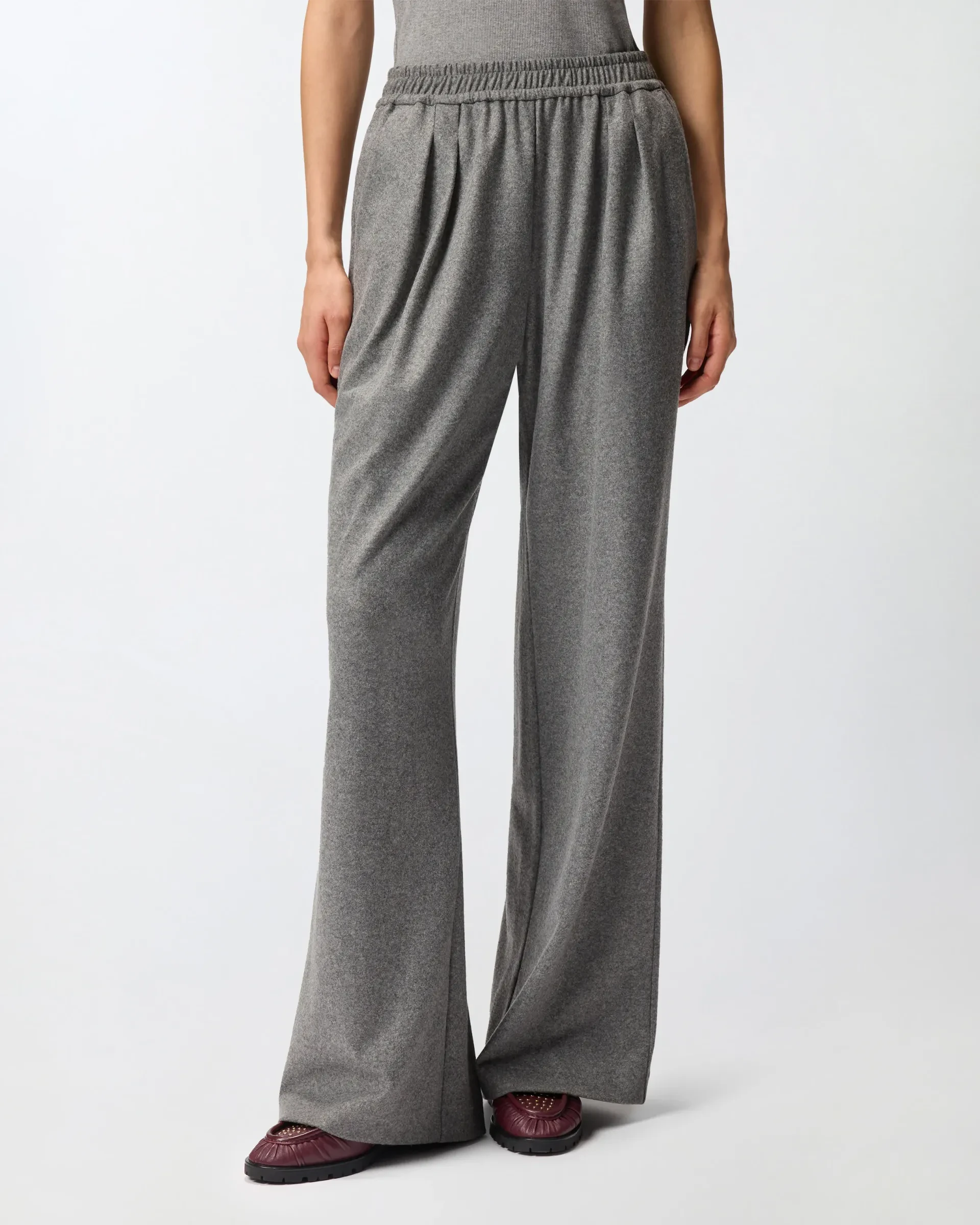 Long trousers made of yarn-dyed wool-blend jersey flannel, a fabric perfect for combining tailoring and comfort, and featuring a wide-leg silhouette with flared leg at the hem. The style combines sartorial style in the details of the rear welt pockets and the typical French pocket, with the sporty comfort of the gathered waist with elastic. Wide-leg trousers are the new must-haves of formal and elegant looks, whether for broken looks or for a new suit concept.