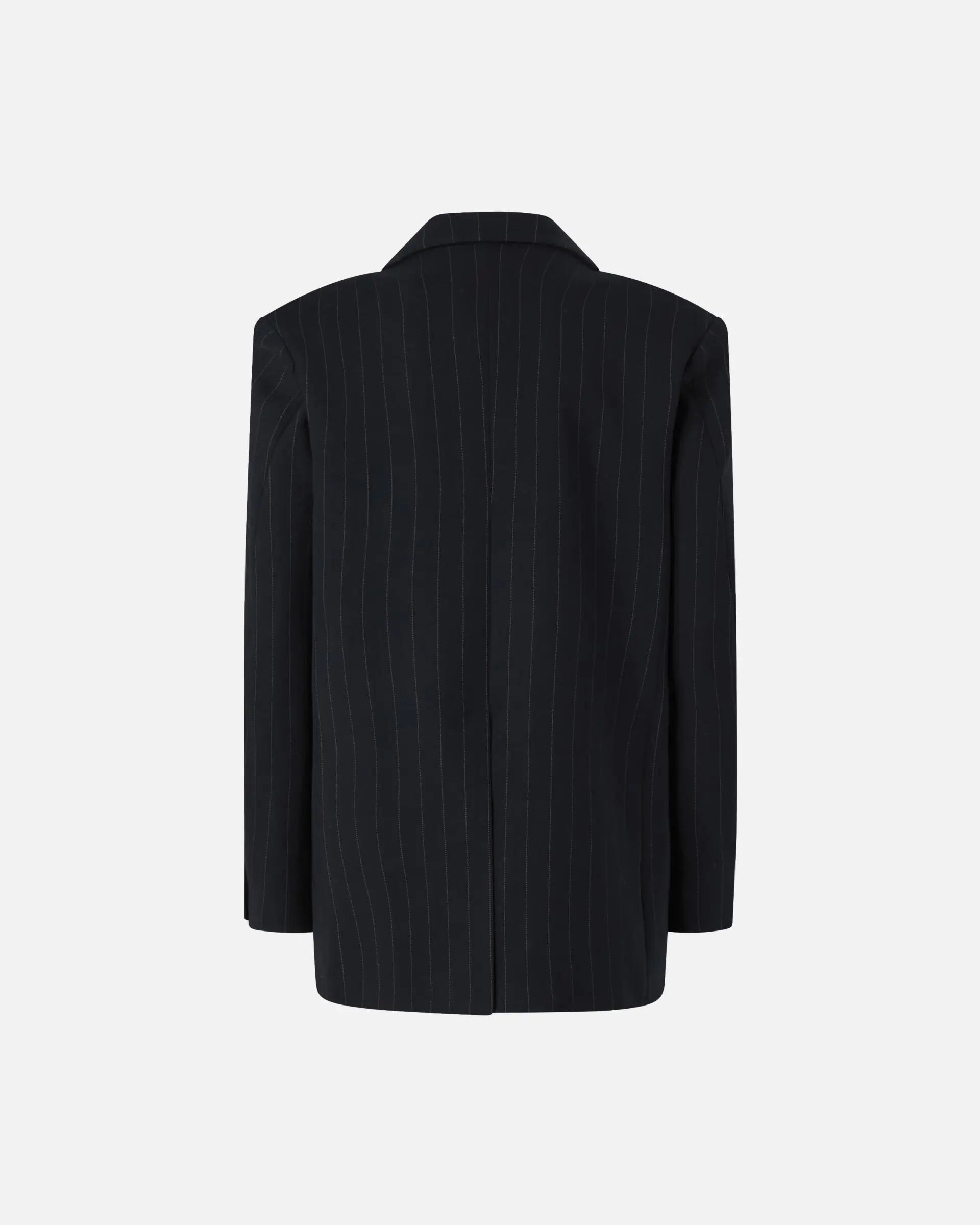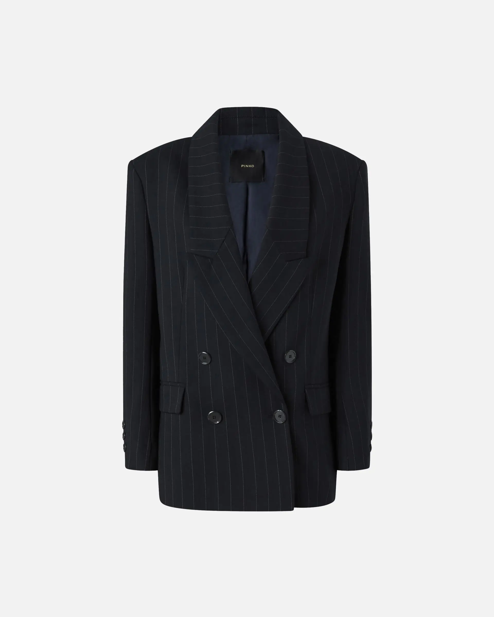 Double-breasted blazer with a masculine look, featuring a straight cut with a central vent on the back, flap pockets and cutaway peak lapels. The fabric used is a classic pinstripe in a poly-wool blend distinguished by a change of weave and shimmer to underline the design of the material. Pair the blazer with the trousers in the same fabric to create an elegant yet contemporary outfit.