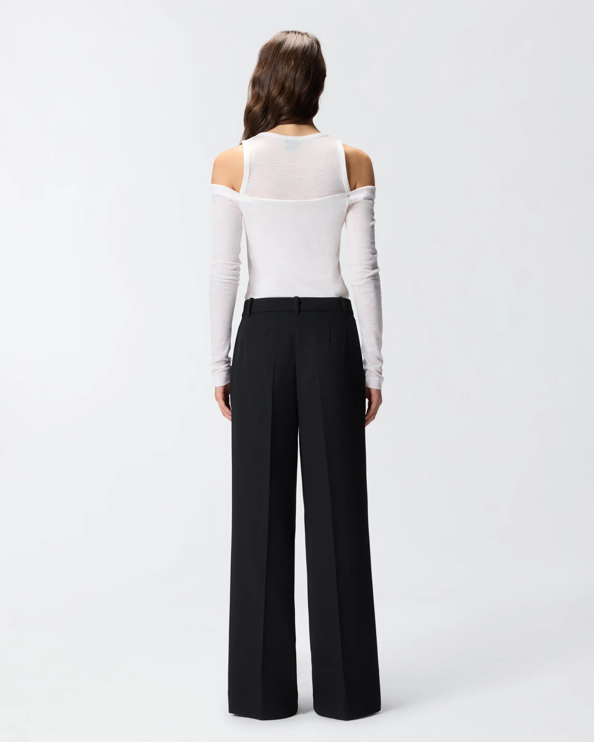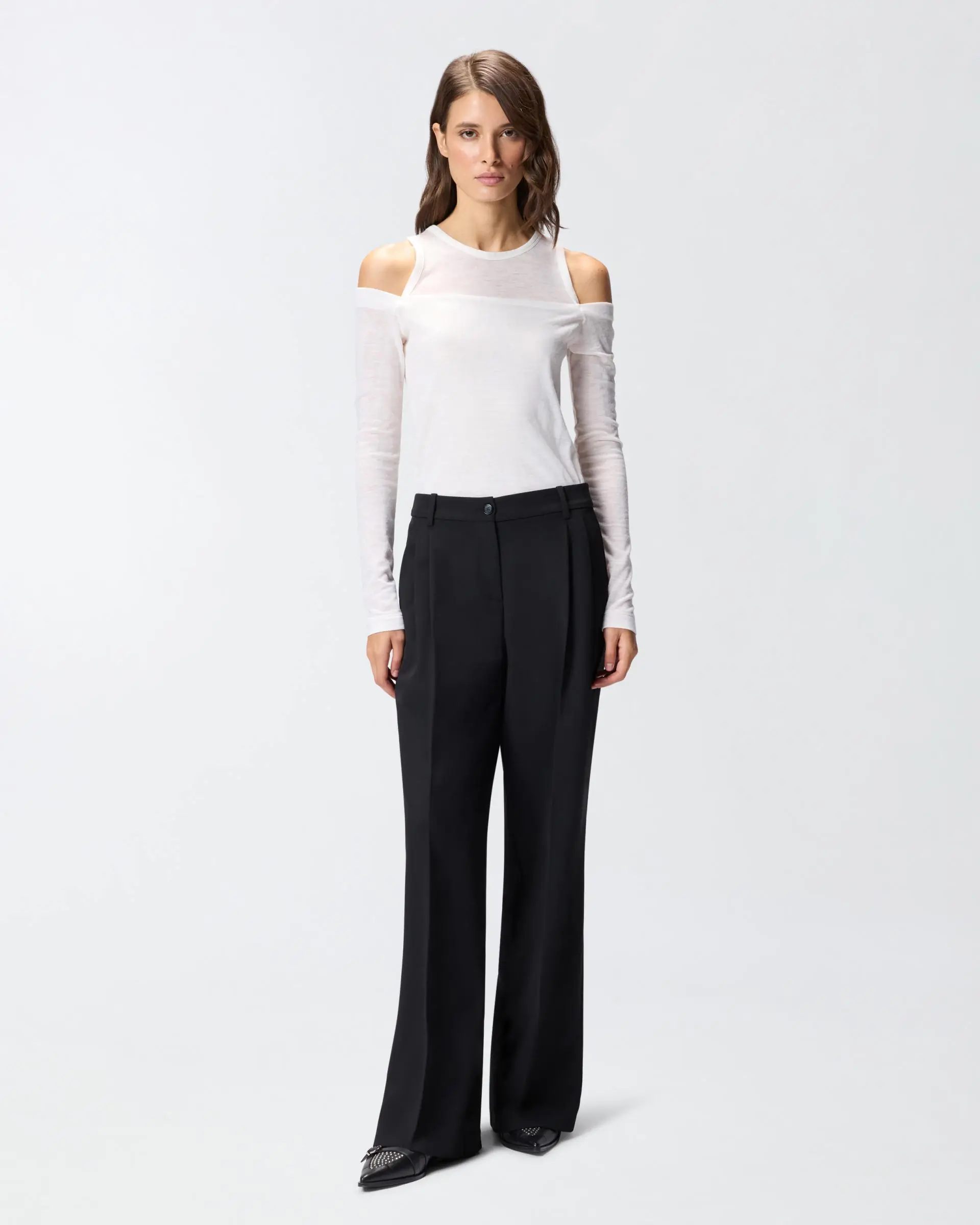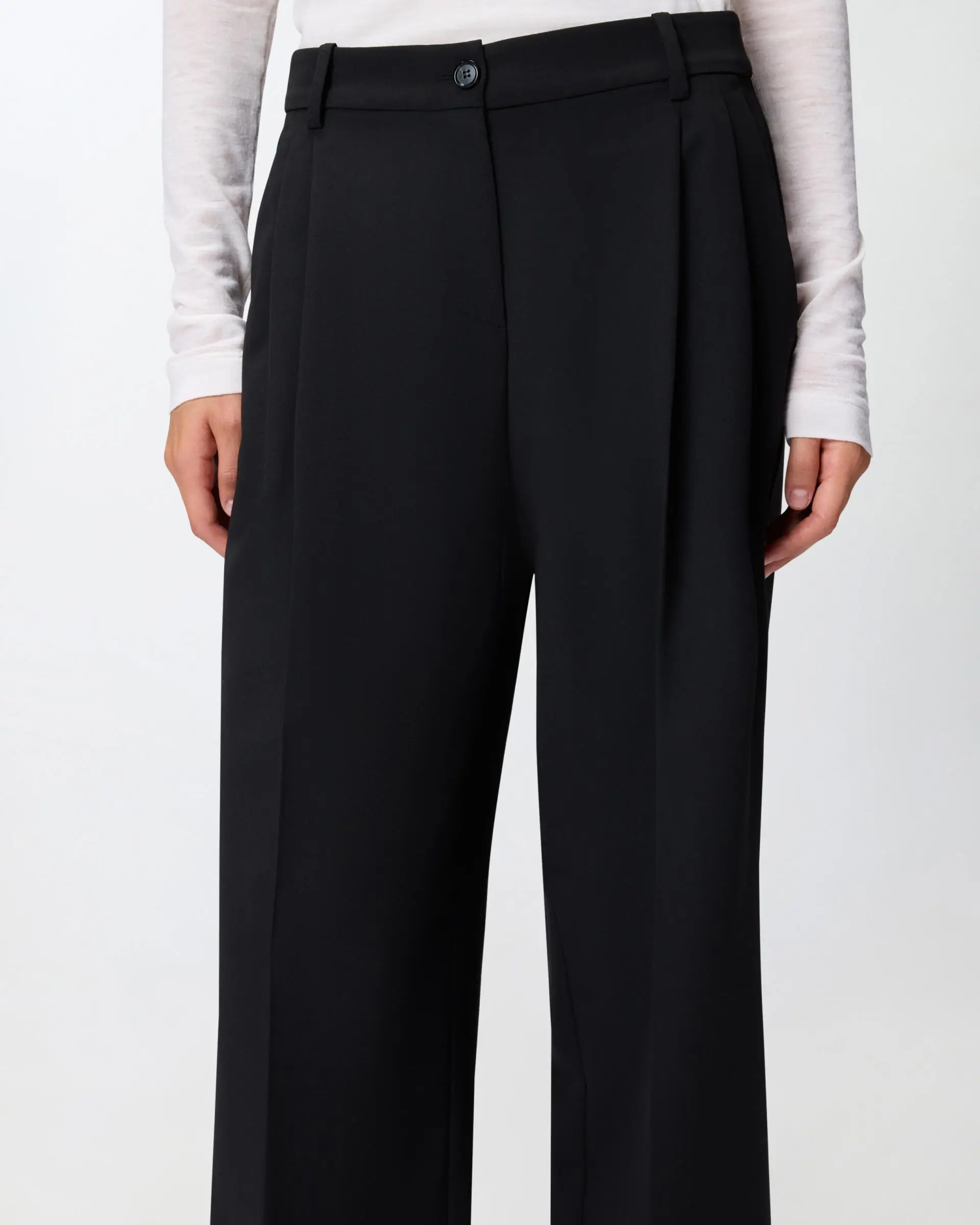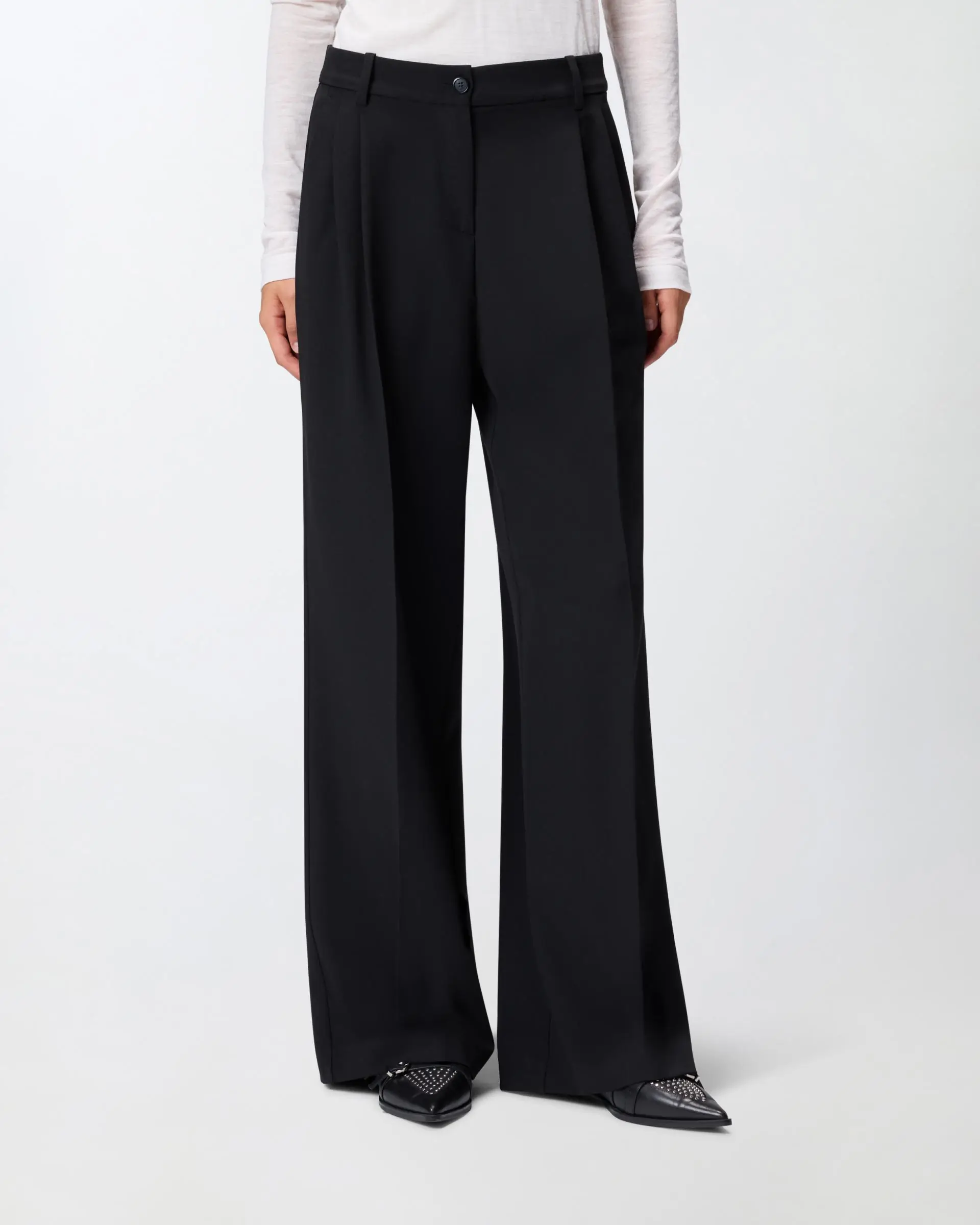 Women's trousers with a wide and fluid silhouette with an elegant palazzo leg that gives movement to every step. Featuring a figure-hugging high waist and a front button closure for a perfect fit. Made of soft fabric that falls naturally creating a sophisticated draped effect. Perfect to combine with fitted tops or tucked-in shirts to balance proportions and create elegant outfits for both day and evening.