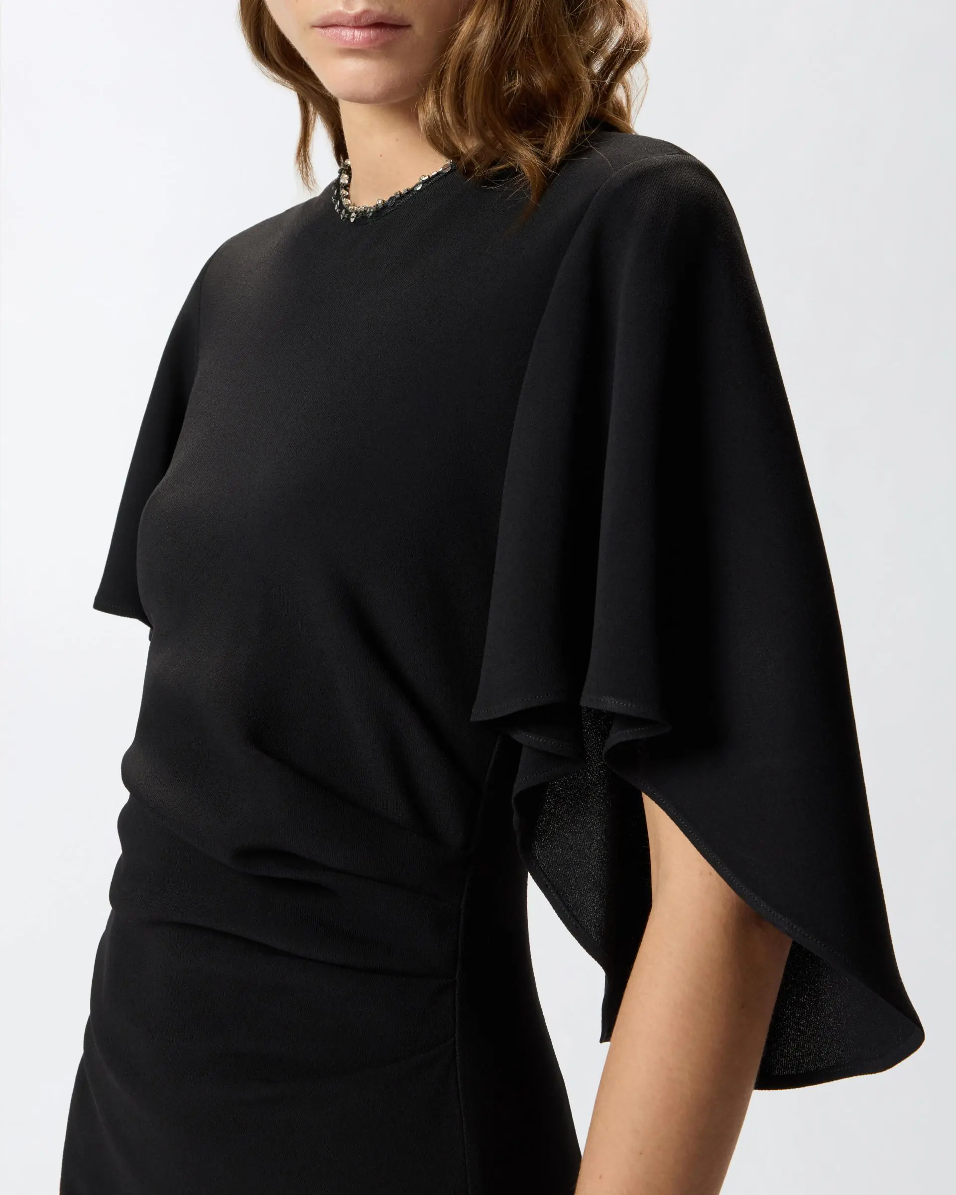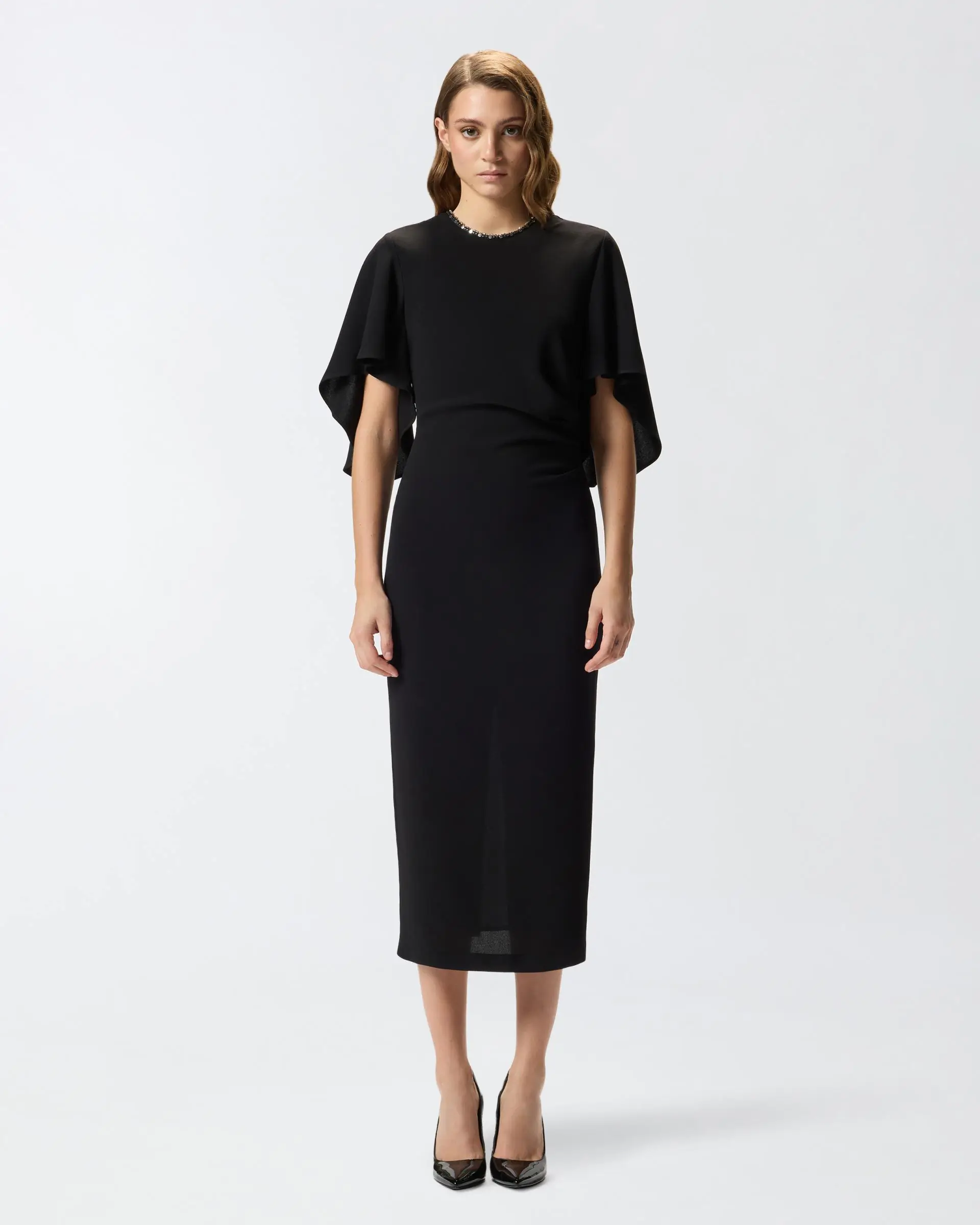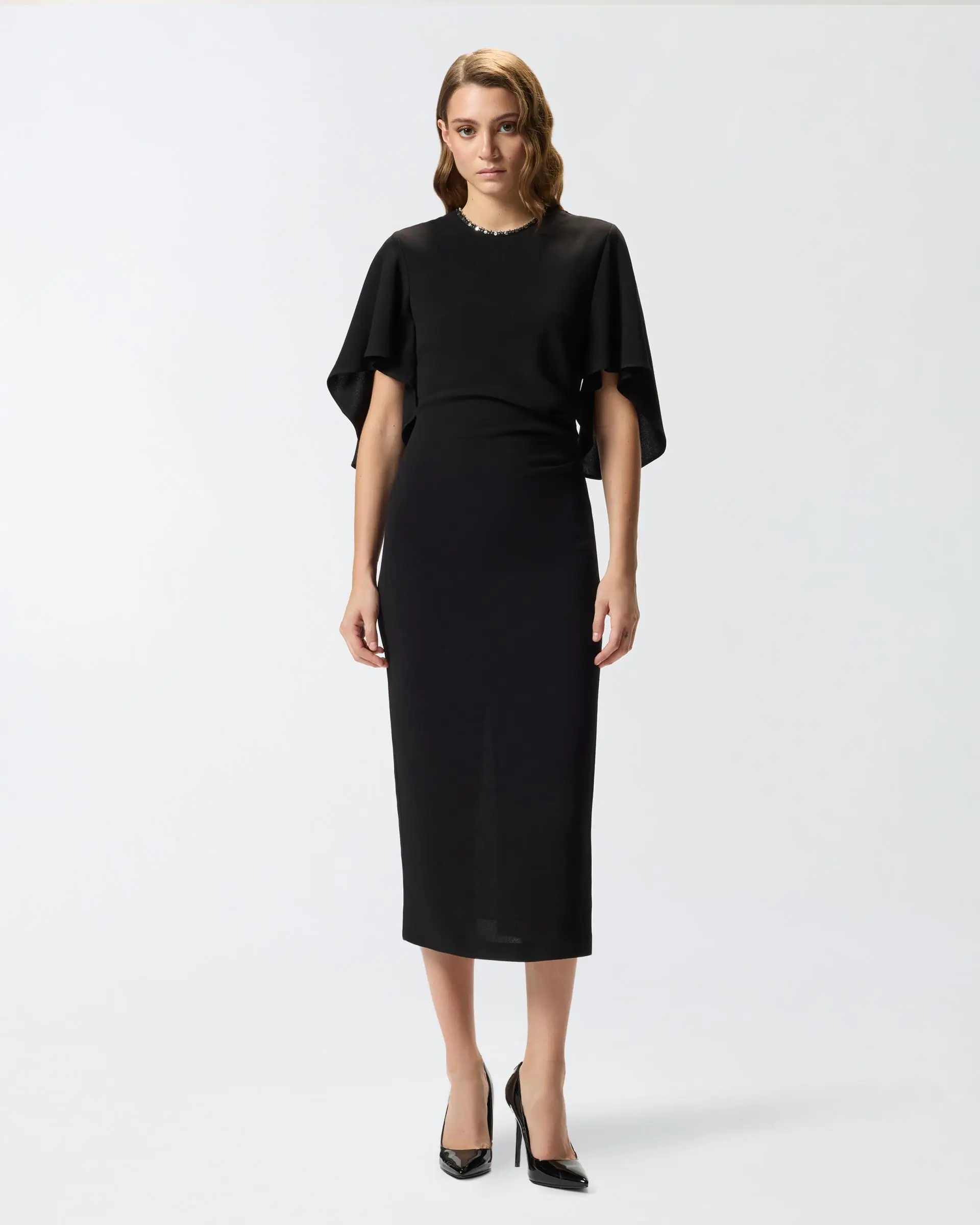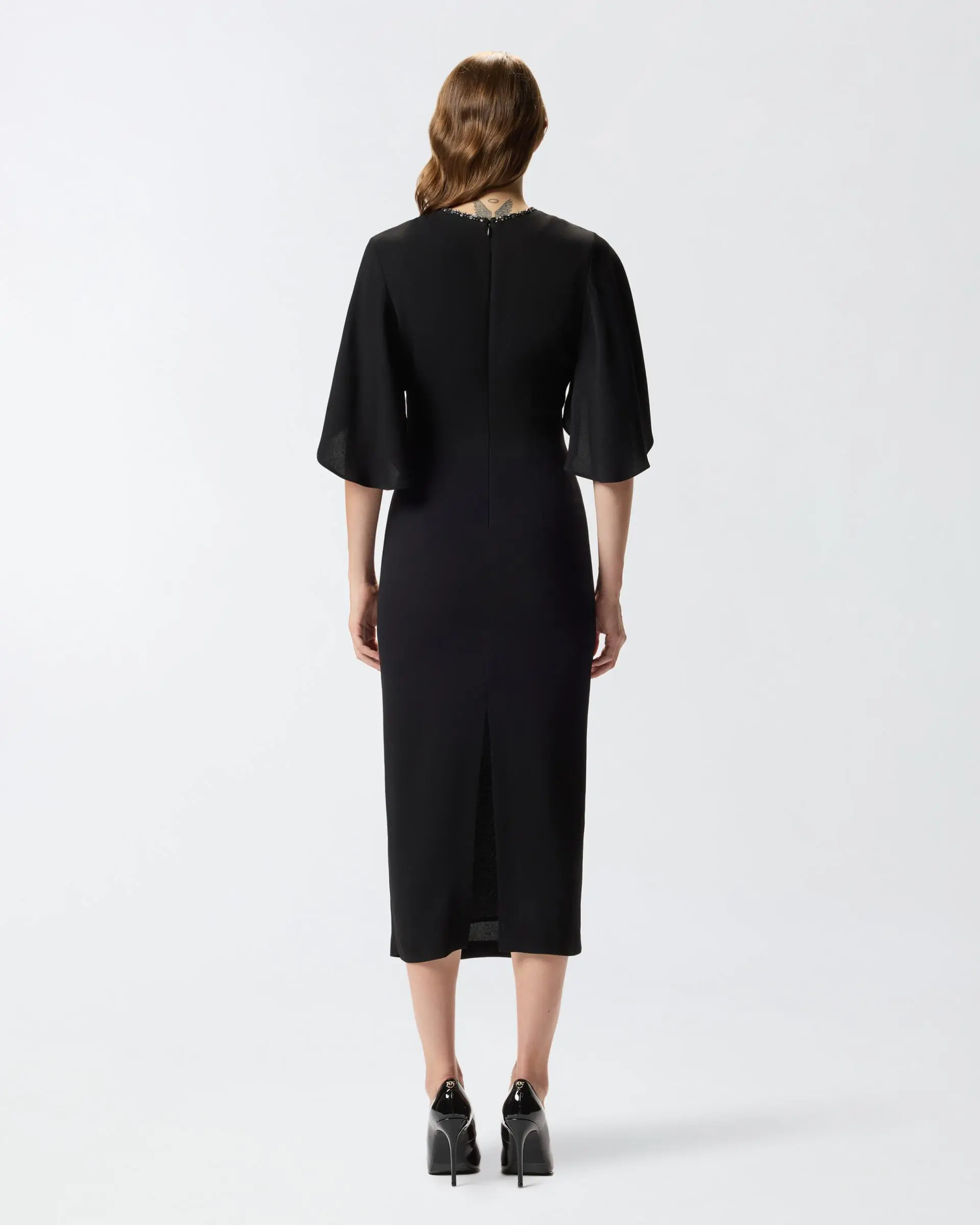 Long lined dress with a fitted sheath silhouette, half-sleeves that are longer at the back and a round neck, embellished with hand-embroidered sequins and chatons. The shape of the skirt caresses and brings out the wearer's body figure, and there is a split in the middle at the bottom on the back. The technical viscose fabric manages to combine softness and fluidity to create a sophisticated texture that offers optimal comfort and fit, without losing the structured appearance of the design. The material has been designed to perfectly adhere to the lines of the body, enhancing the silhouette in a natural and defined way. The micro-crystal embroidery creates a contrast of shimmer that enhances the texture of the fabric and adds movement to the look, without losing a structured and feminine final effect.