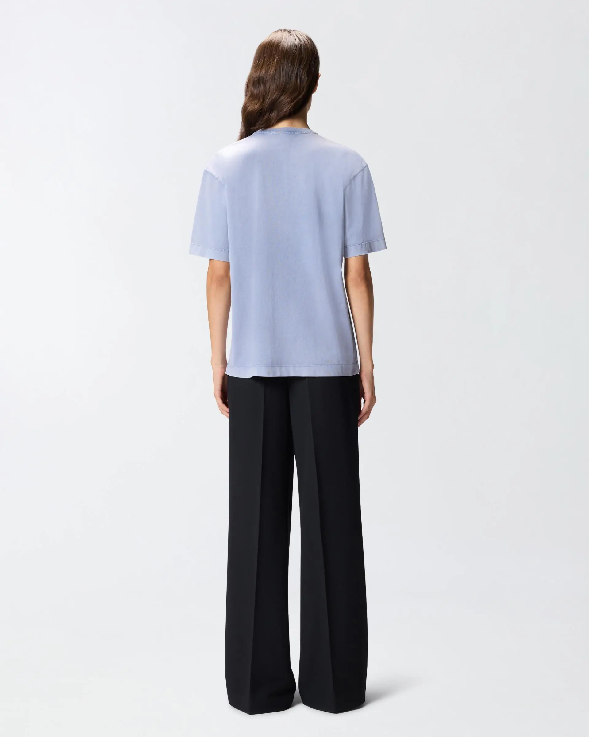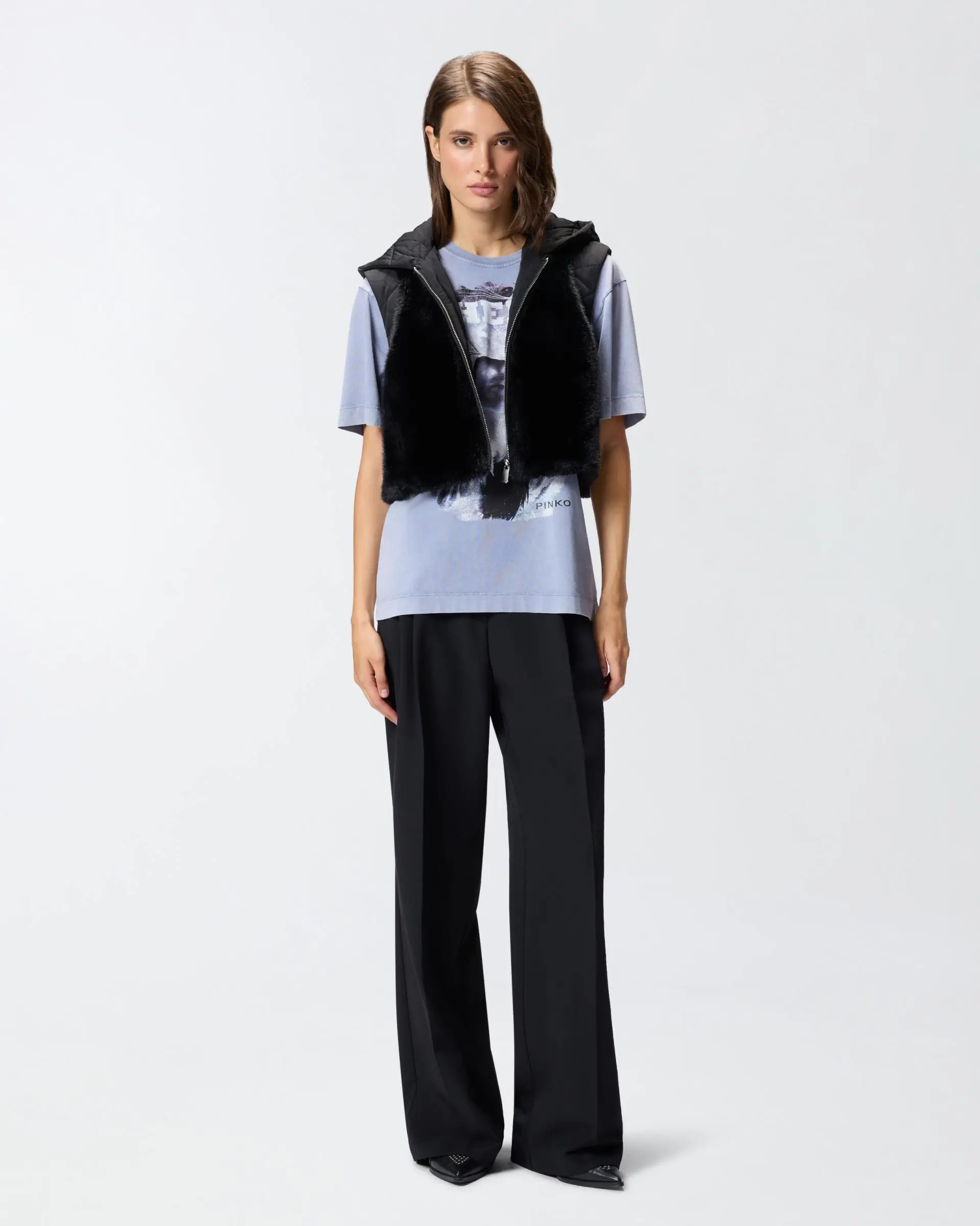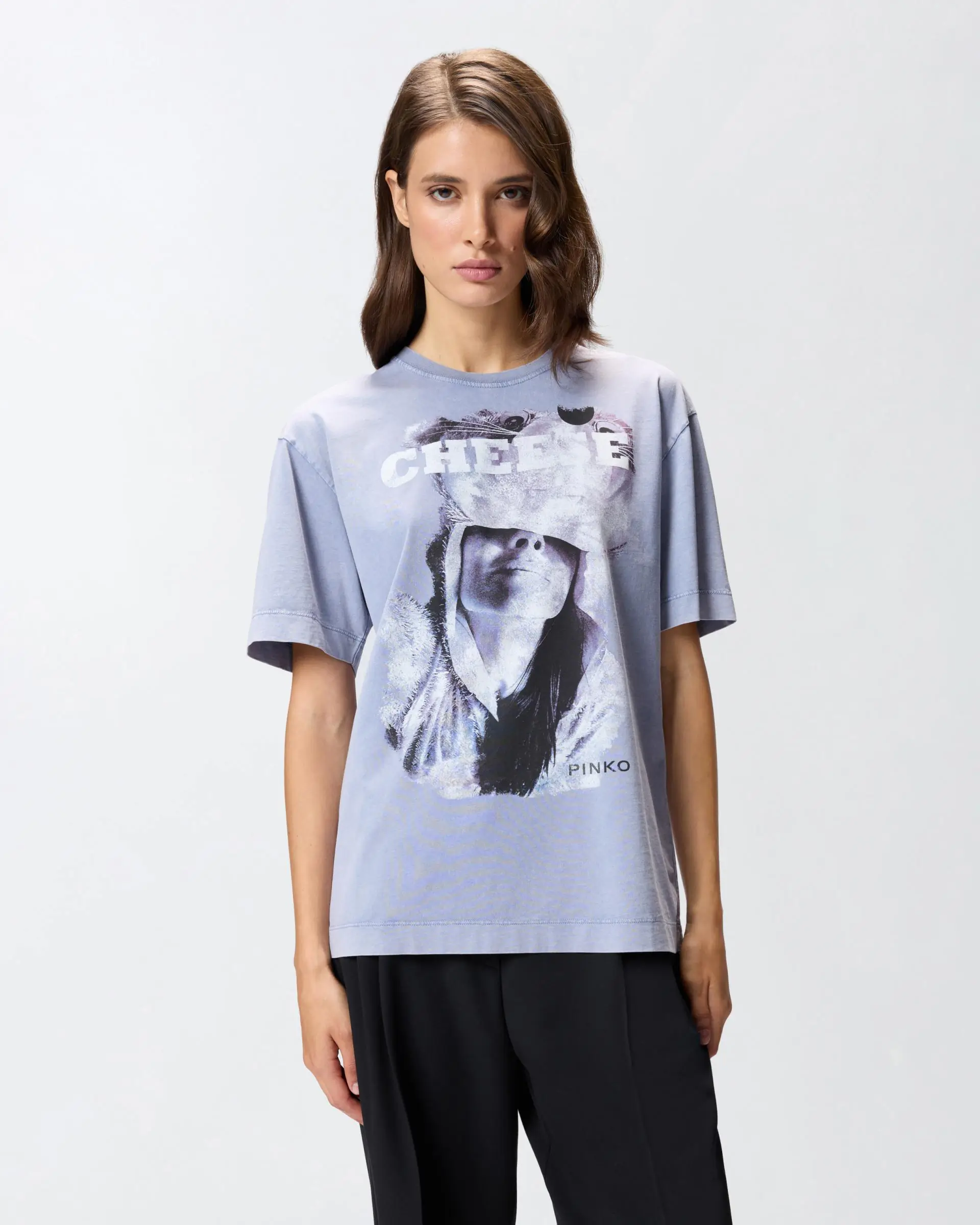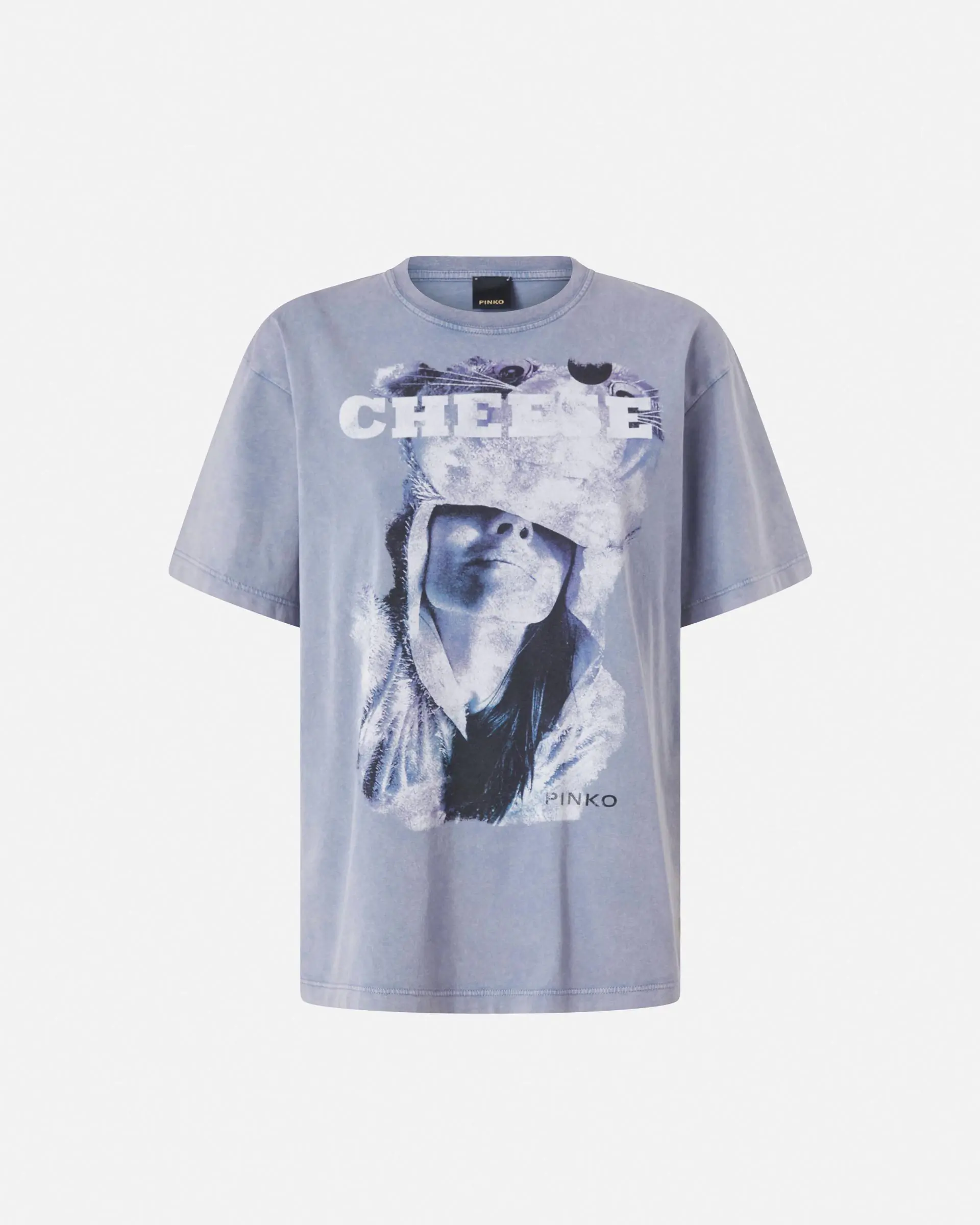 Short-sleeved crew-neck T-shirt in pure cotton jersey with a special marble-effect dye. The piece stands out with its fun front print with a feminine face accompanied by CHEESE lettering and the signature PINKO lettering logo. This T-shirt will work seamlessly with your favourite trousers, elevating your look in a simple, elegant and original way.