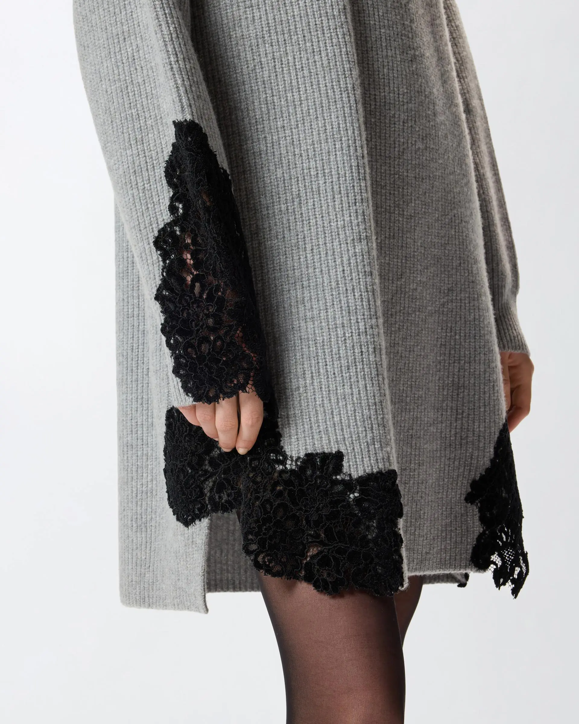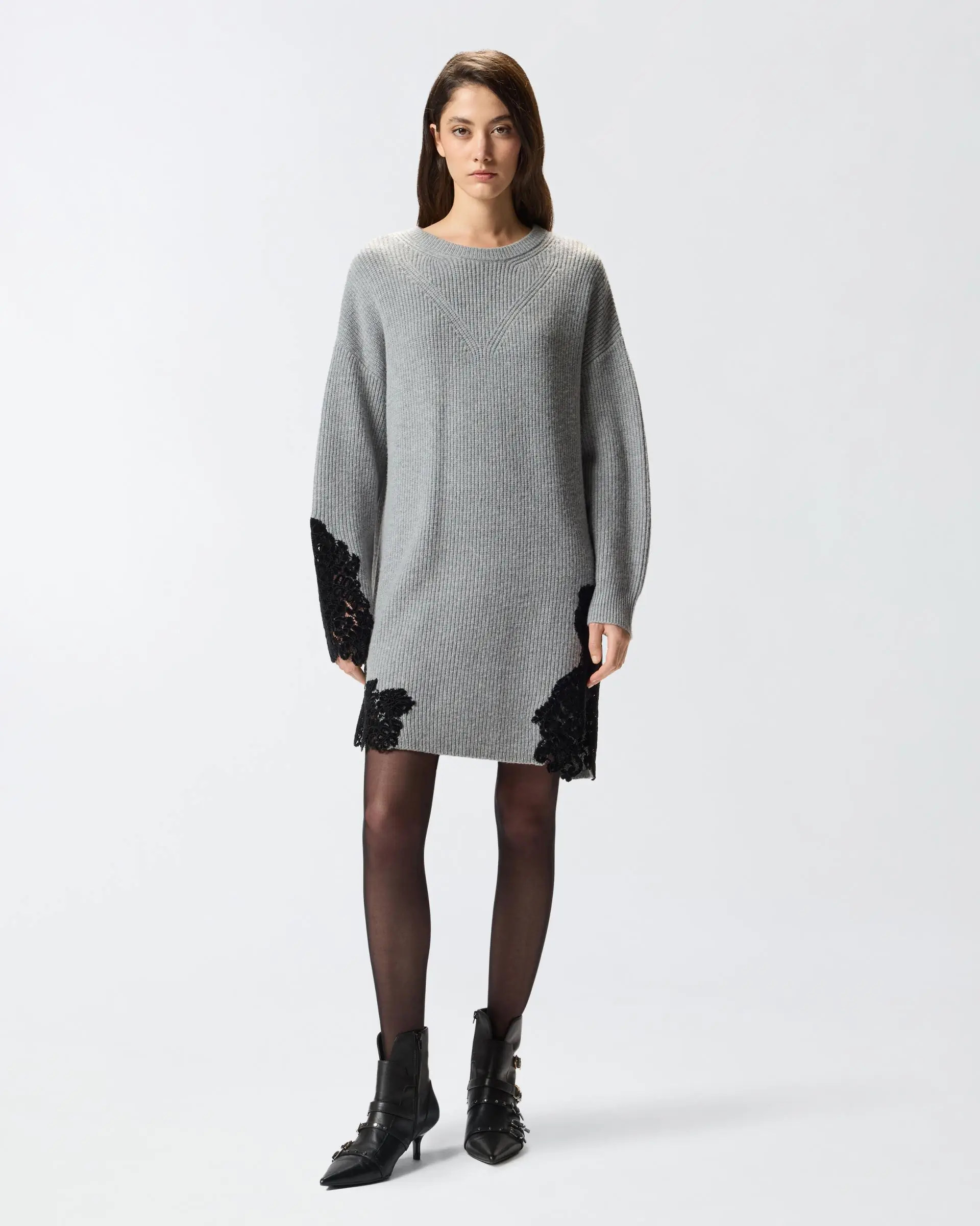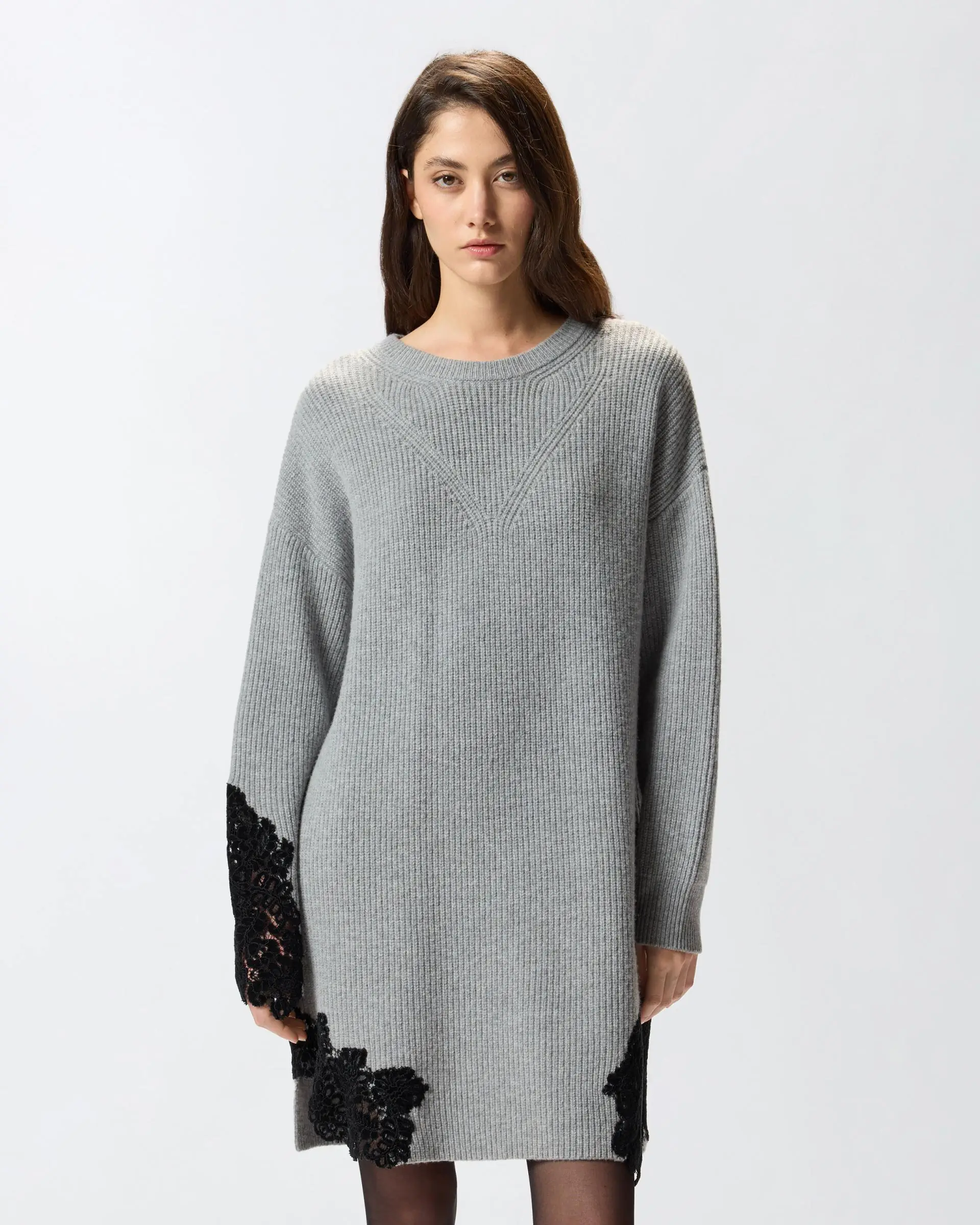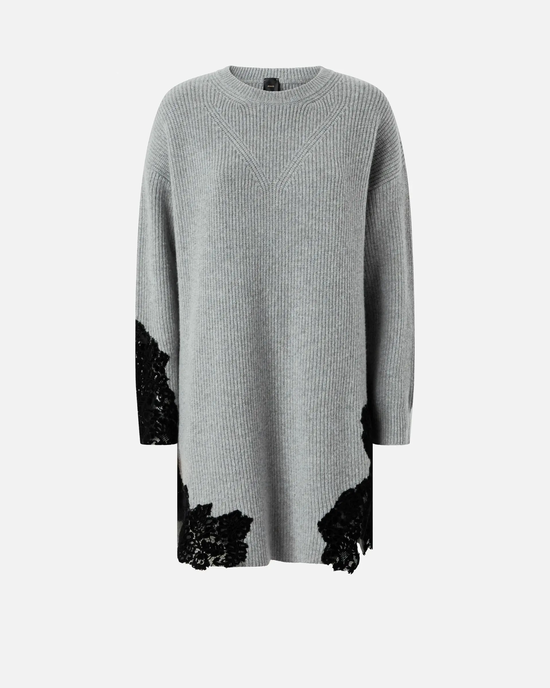 Short dress in rib-knit wool-blend fabric: a yarn that offers a perfect balance between comfort and softness. The detail that embellishes the design is the hand-worked flocked lace inlay on one sleeve and on the hem. The piece has undergone finishing tests to minimise the possible formation of pilling, ensuring greater fabric softness and durability. The final touch is given by the tone-on-tone label with PINKO lettering logo behind the neck. Add this design to your wardrobe to give your winter outfits a twist.