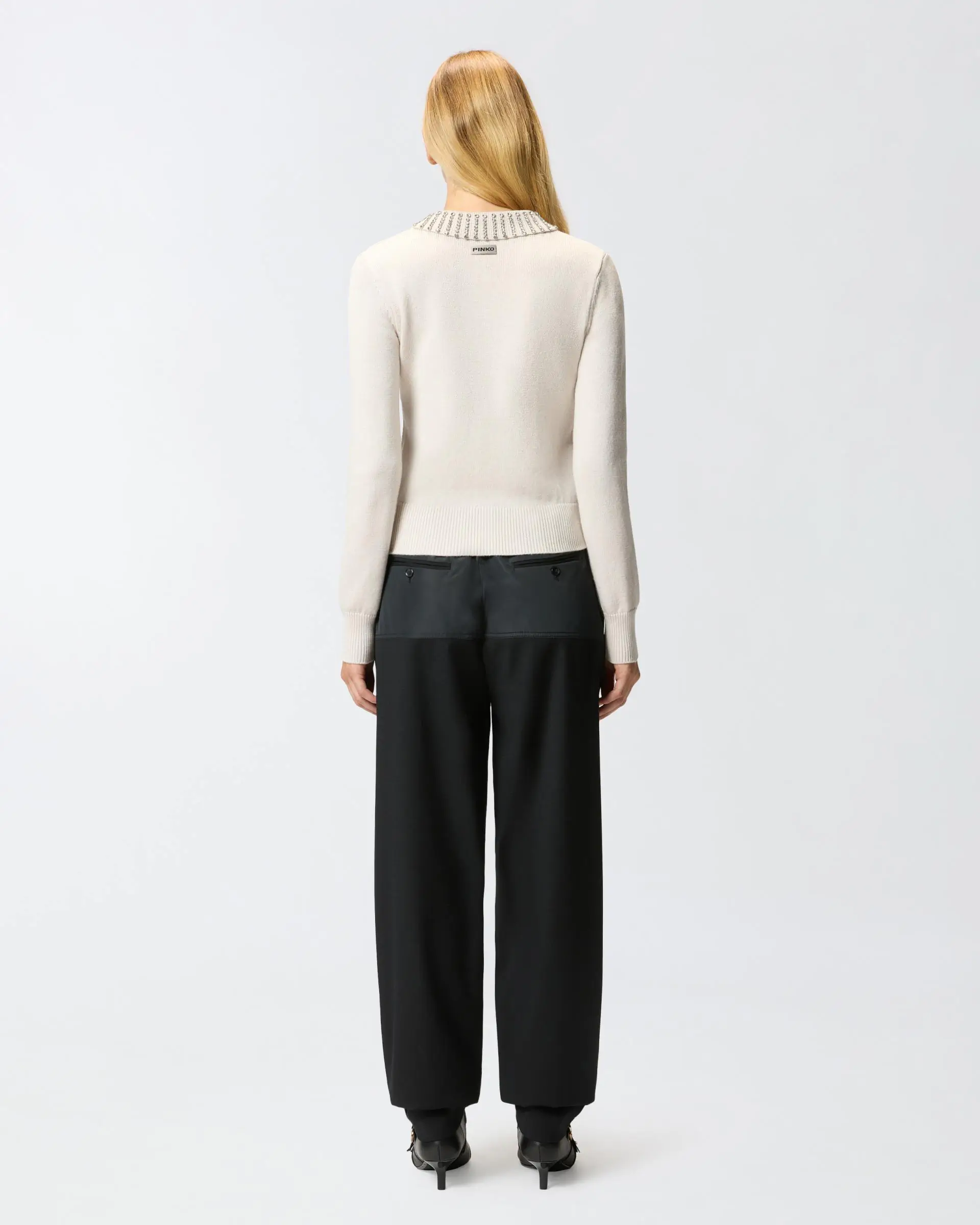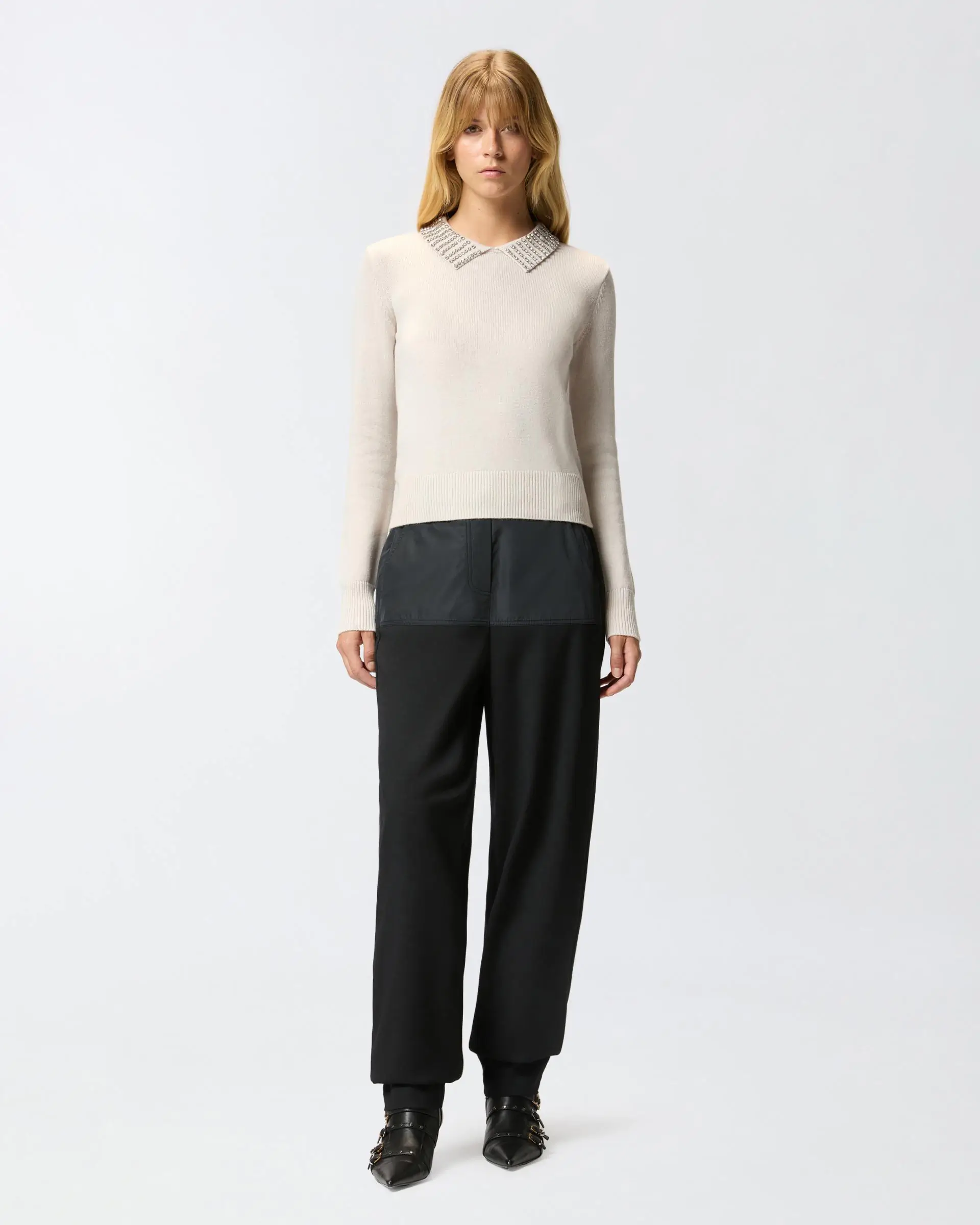 Slim-fitting, long-sleeved sweater with polo-style collar. The collar immediately catches the eye thanks to the rhinestone appliqués that embellish the design. The hem and cuffs are ribbed, while the tone-on-tone label with the PINKO lettering logo stands out on the lower front. The piece has undergone finishing tests to minimise the possible formation of pilling, ensuring greater fabric softness and durability.