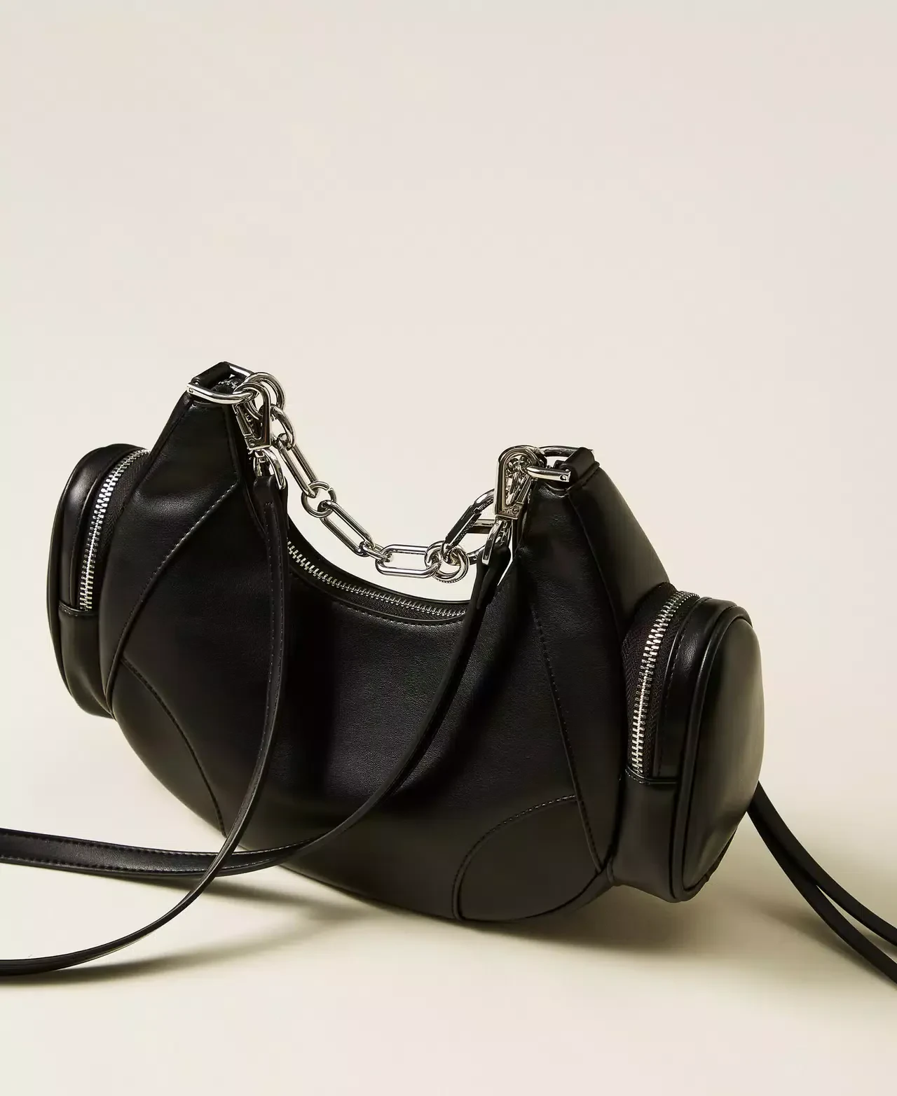 Croissant hobo bag made from smooth faux natural calf nappa leather. Biker-inspired design with side pockets, zip closure, front pocket with zip, decorative studs. Metal chain handle with Oval T and removable and adjustable shoulder strap for cross-body wear.