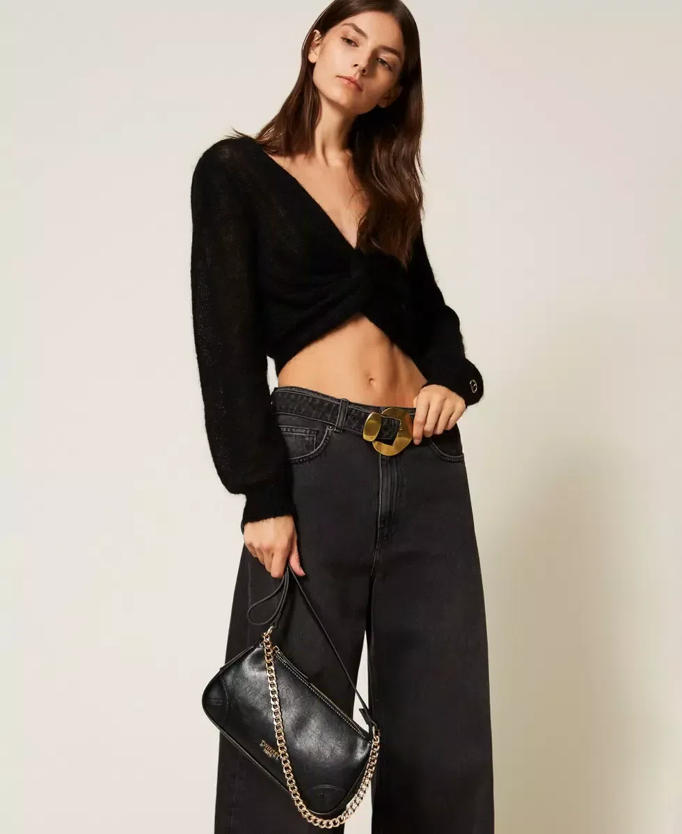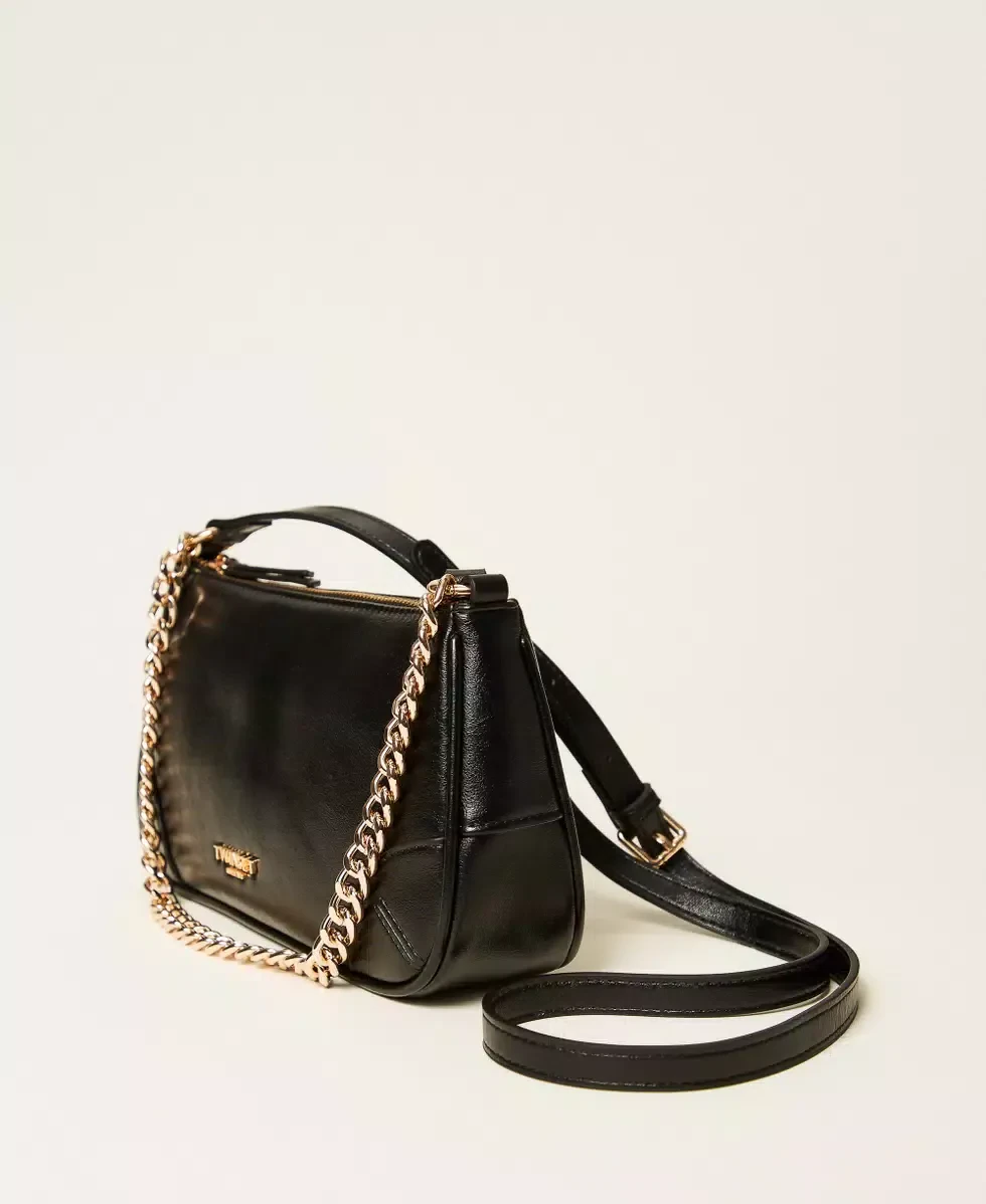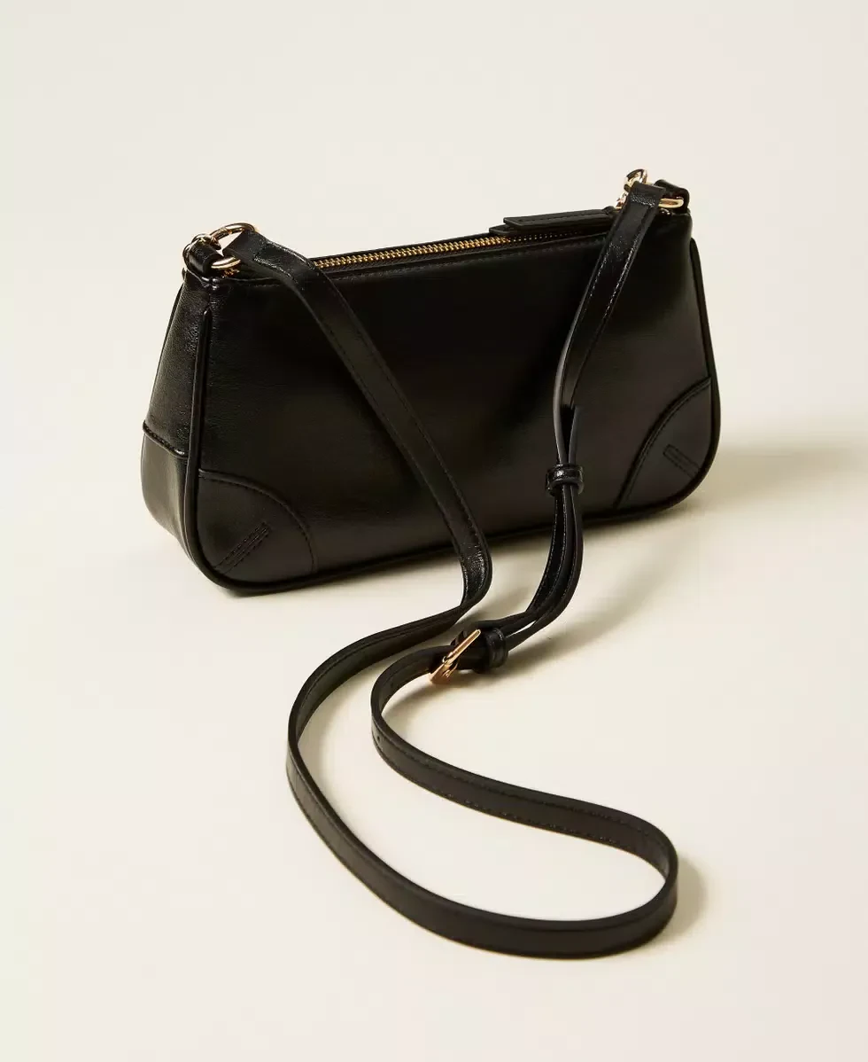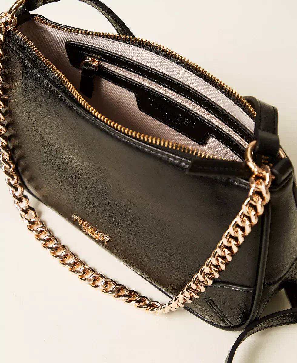 Semi-polished faux calfskin leather shoulder bag with a slightly textured surface. Offers the double option of short chain handle, which can be worn over the shoulder, and long adjustable faux leather shoulder strap, for cross-body wear. Zip closure and gold-tone lettering logo on the front panel. Lining and internal pockets.