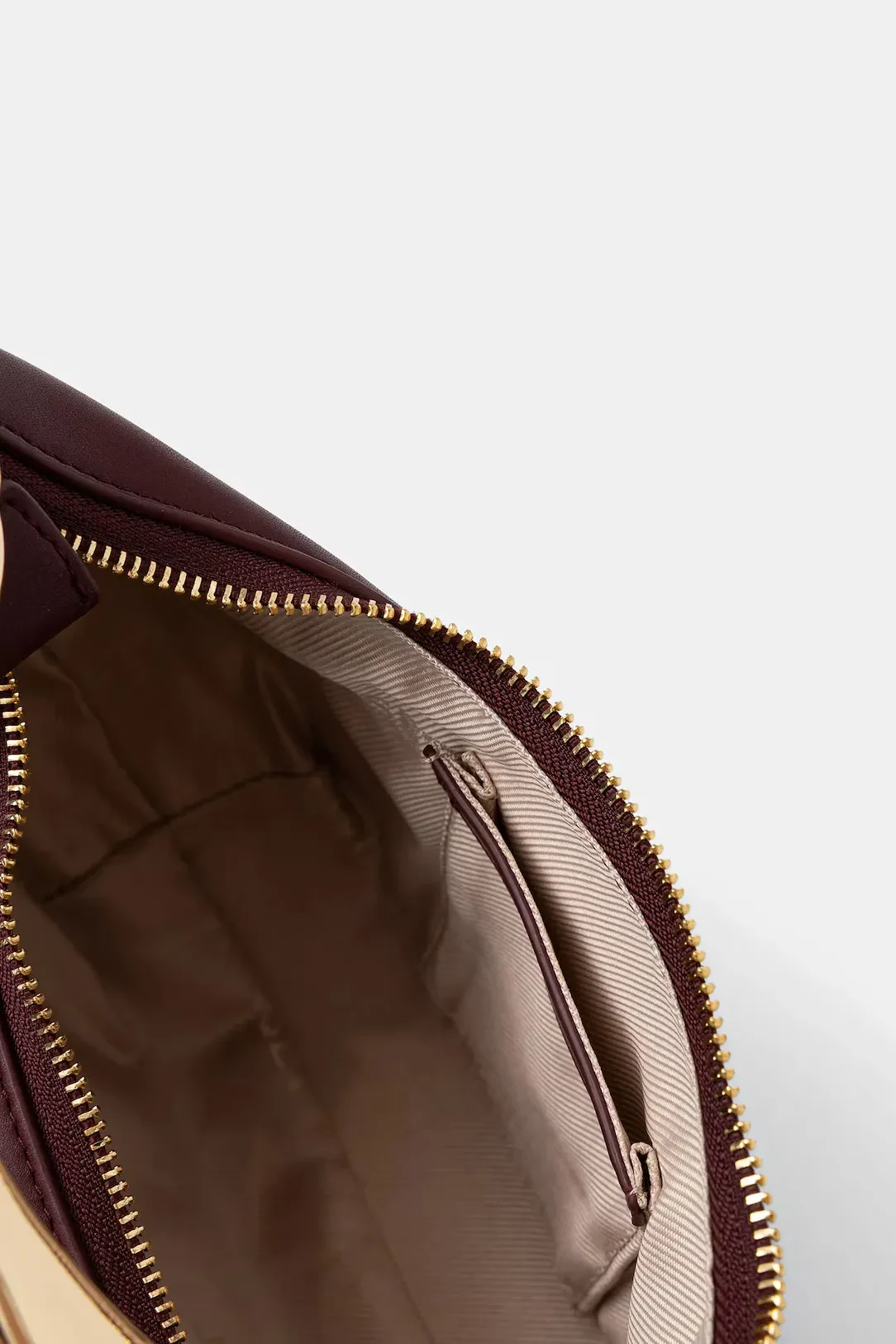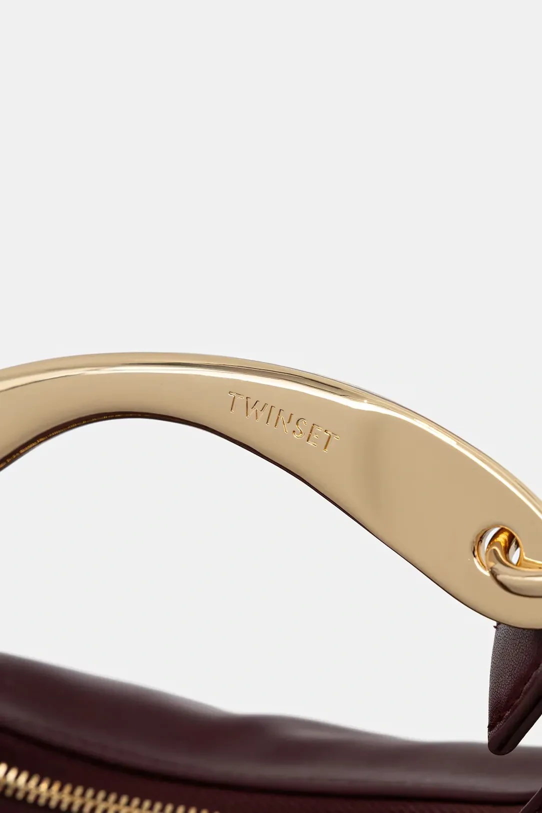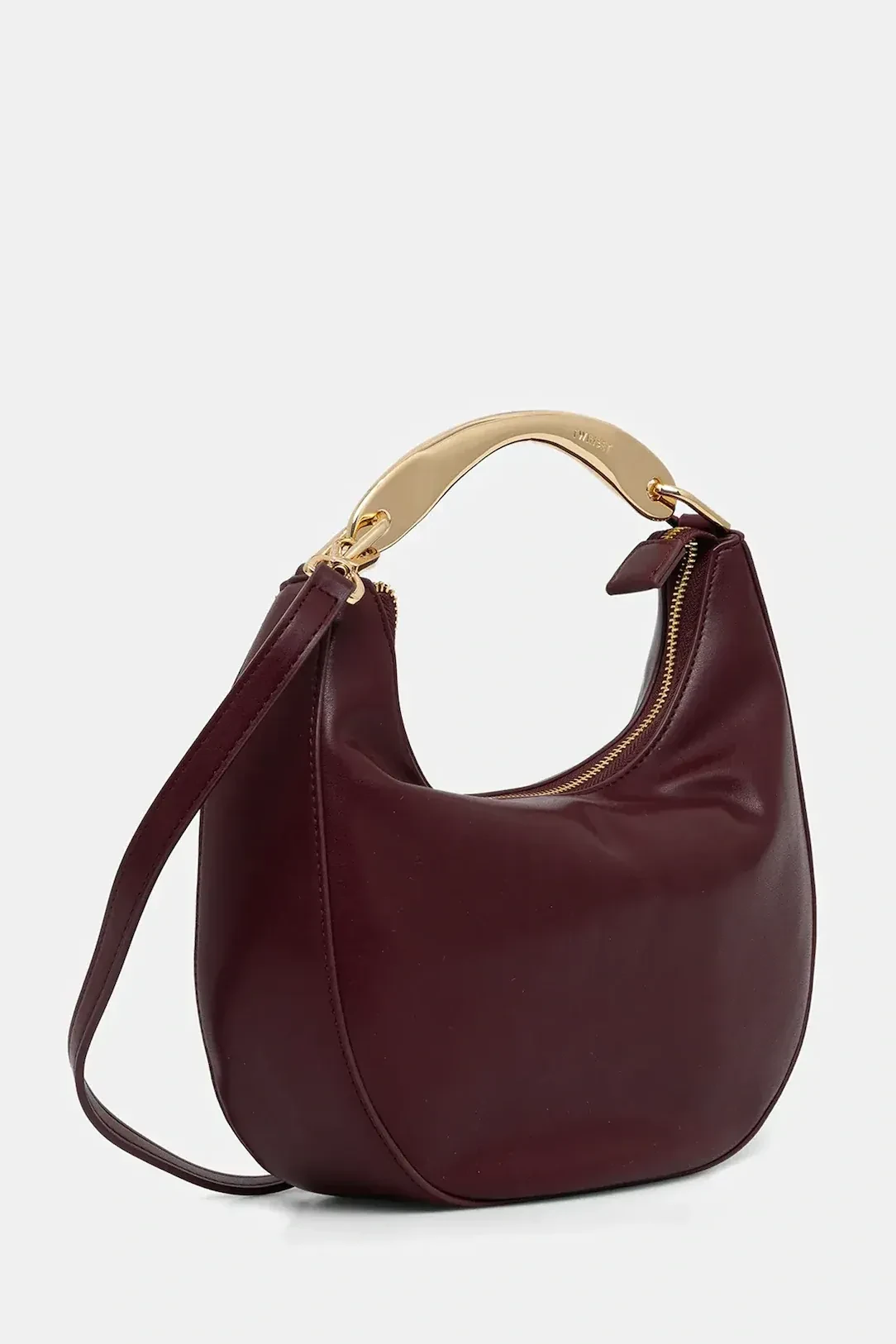 Croissant hobo bag made from smooth faux natural calf nappa leather. Metal handle with engraved logo and organic silhouette. Zip closure and removable and adjustable shoulder strap for cross-body wear.