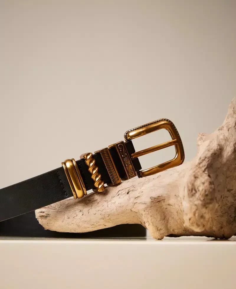 Low waist belt with square buckle and metal loops with different details, light brass.