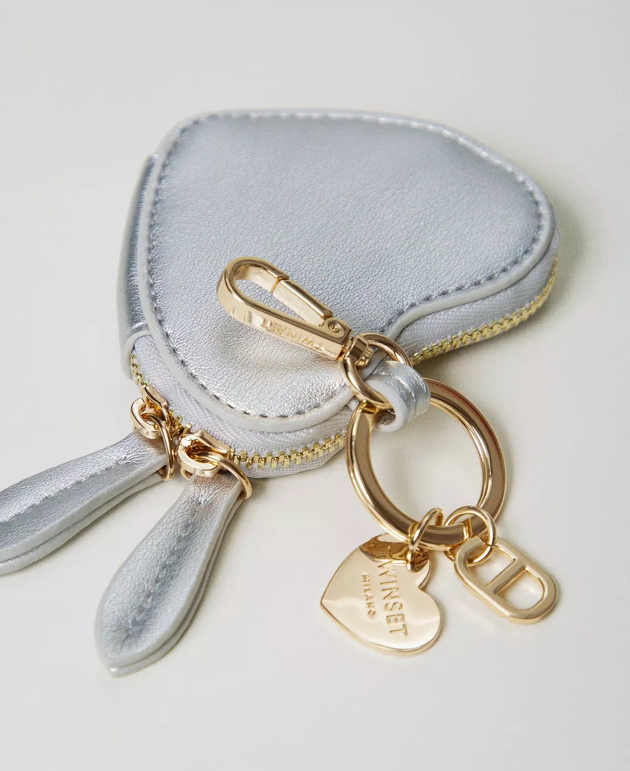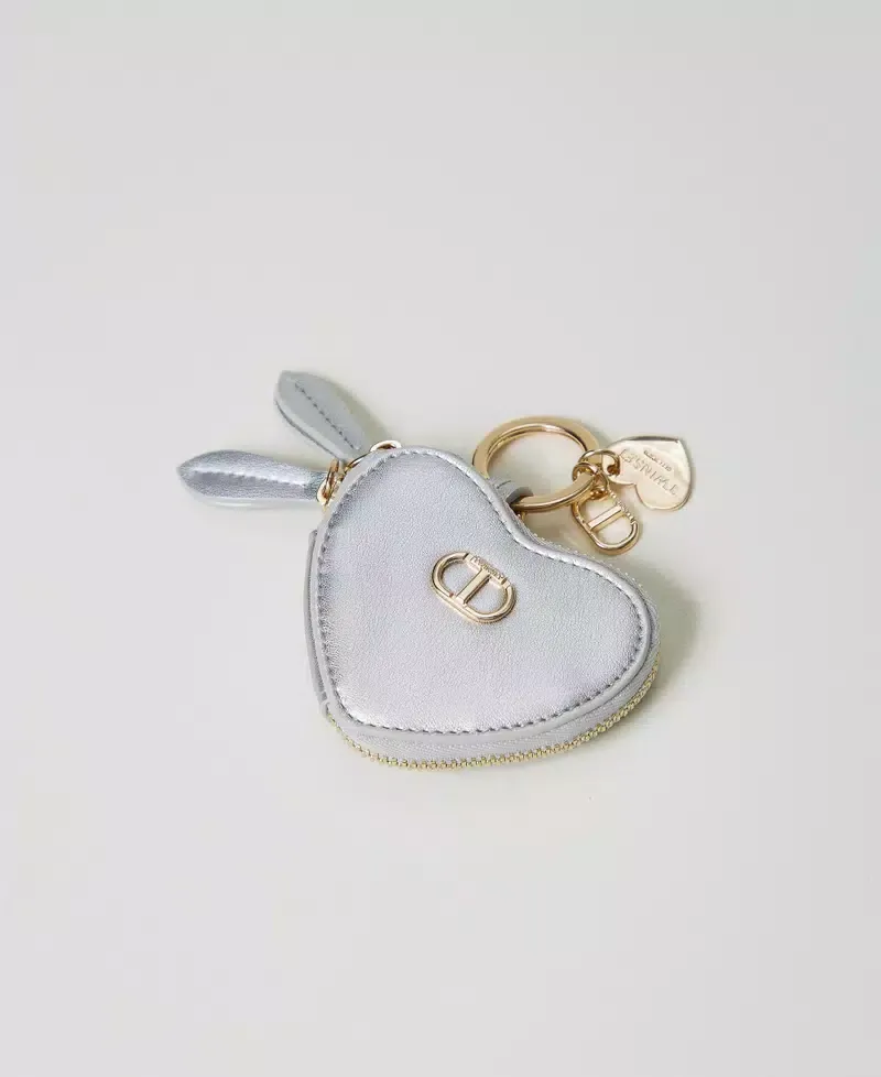 Heart-shaped faux nappa leather coin purse with Oval T on the front. Gold-tone metal zip closure, karabiner, ring and logo charm.