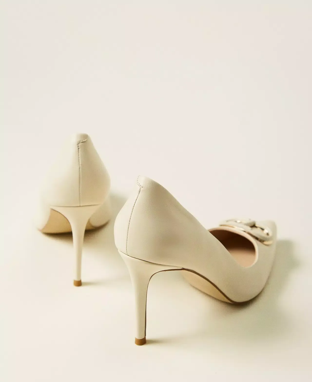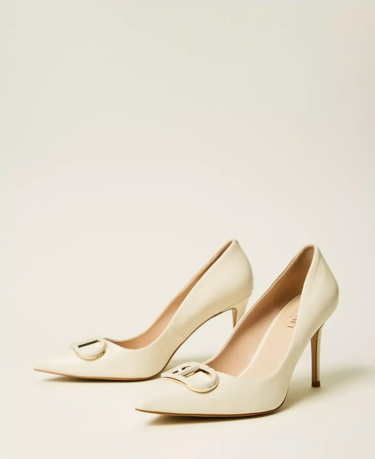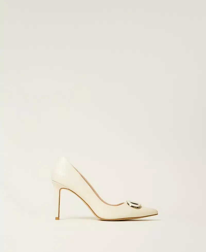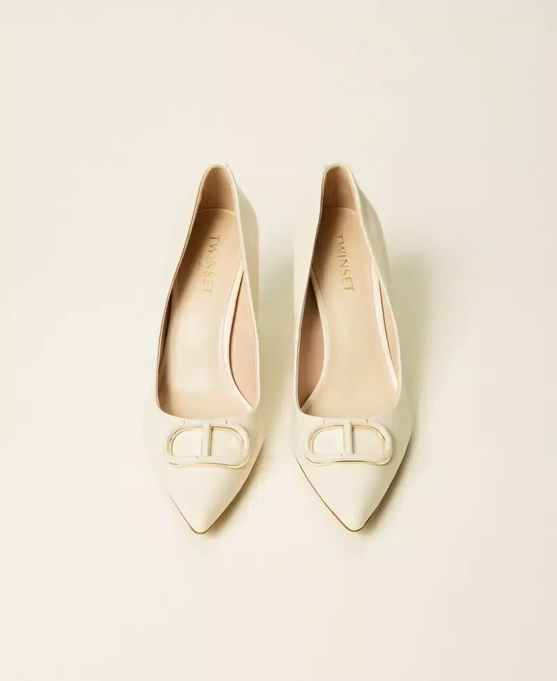 Leather court shoes with matching enamelled Oval T, tapered toe, stiletto heel and tunit sole.