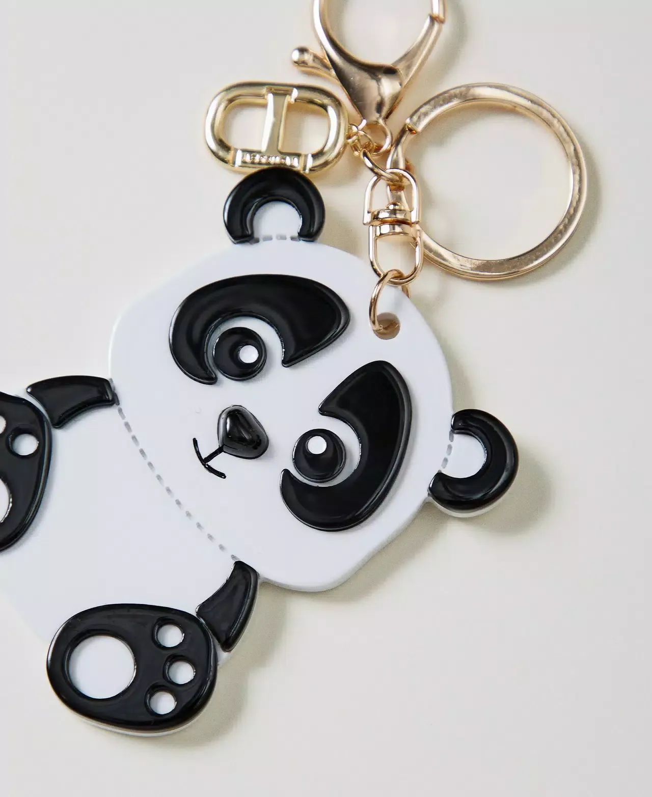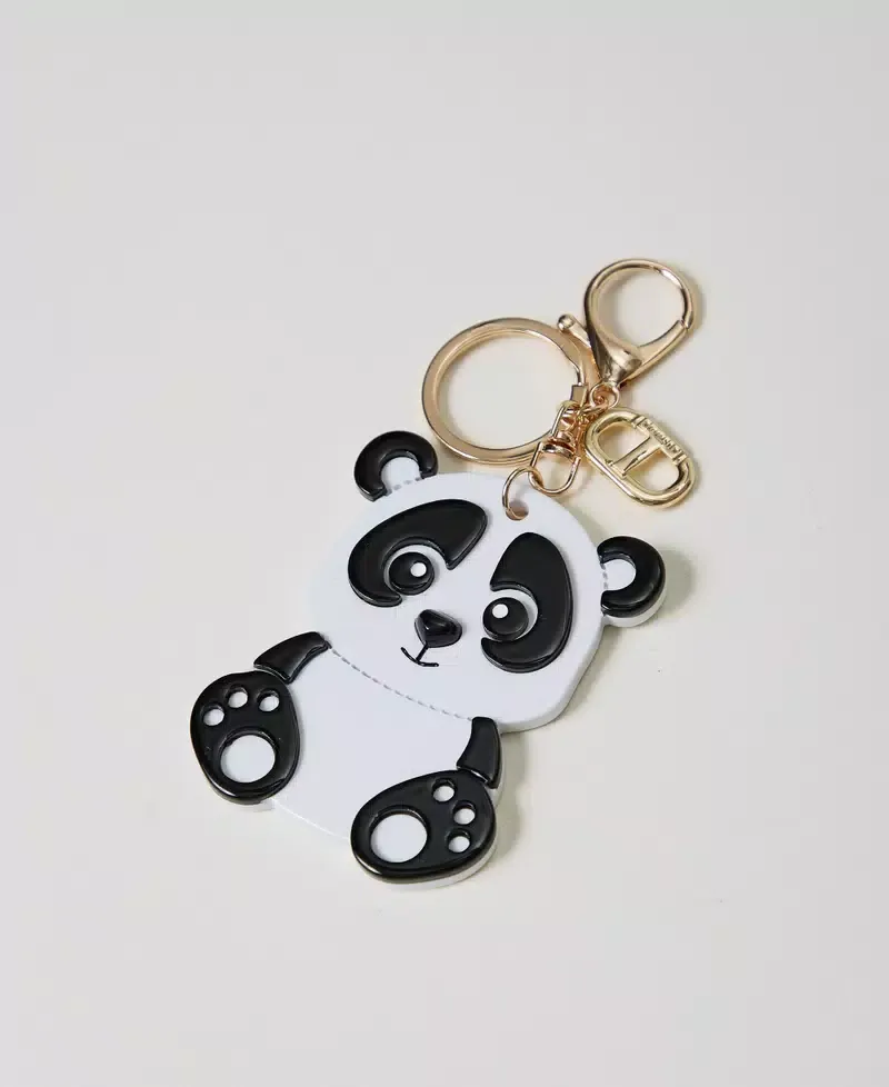 Coloured acetate resin key ring in the shape of a panda. Gold-tone metal carabiner, ring and Oval T charm.
