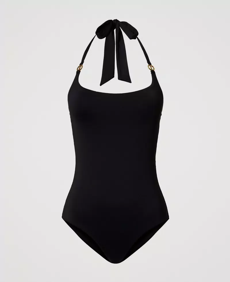One-piece swimsuit with underwire, halter self-tie straps with metal Oval T, wide round neckline, back self-tie. Lined.