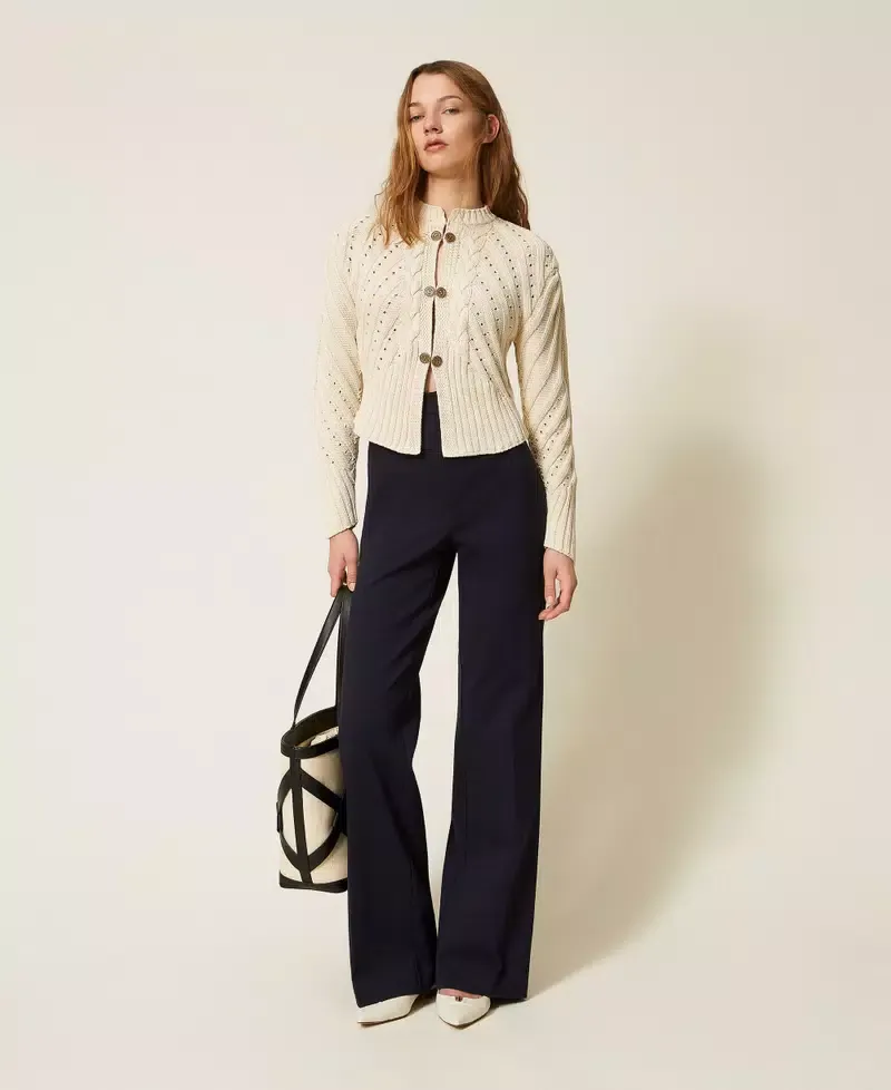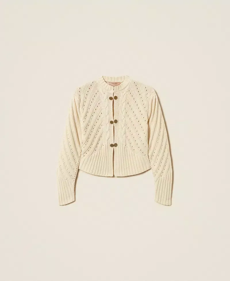 Cotton cardigan with cable knit, openwork and rib knit patterns. Mandarin collar, long sleeves, fitted fastening with concealed hooks and decorative external buttons, loose fit.