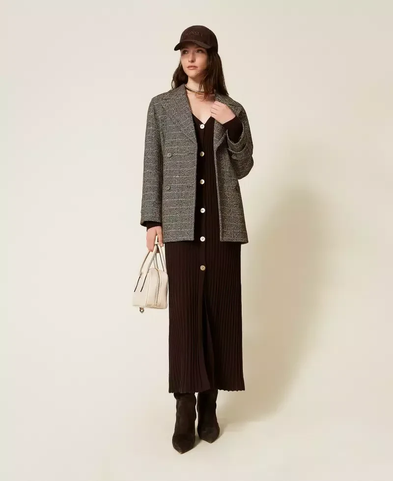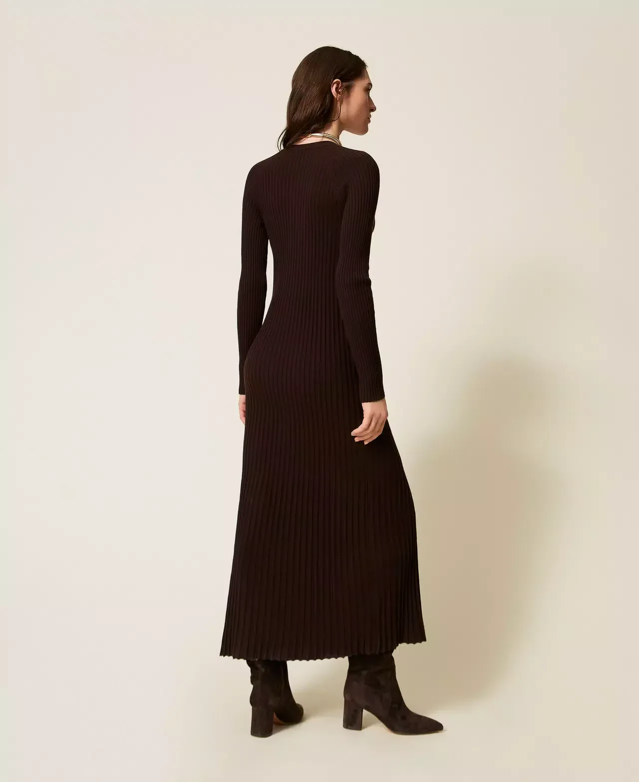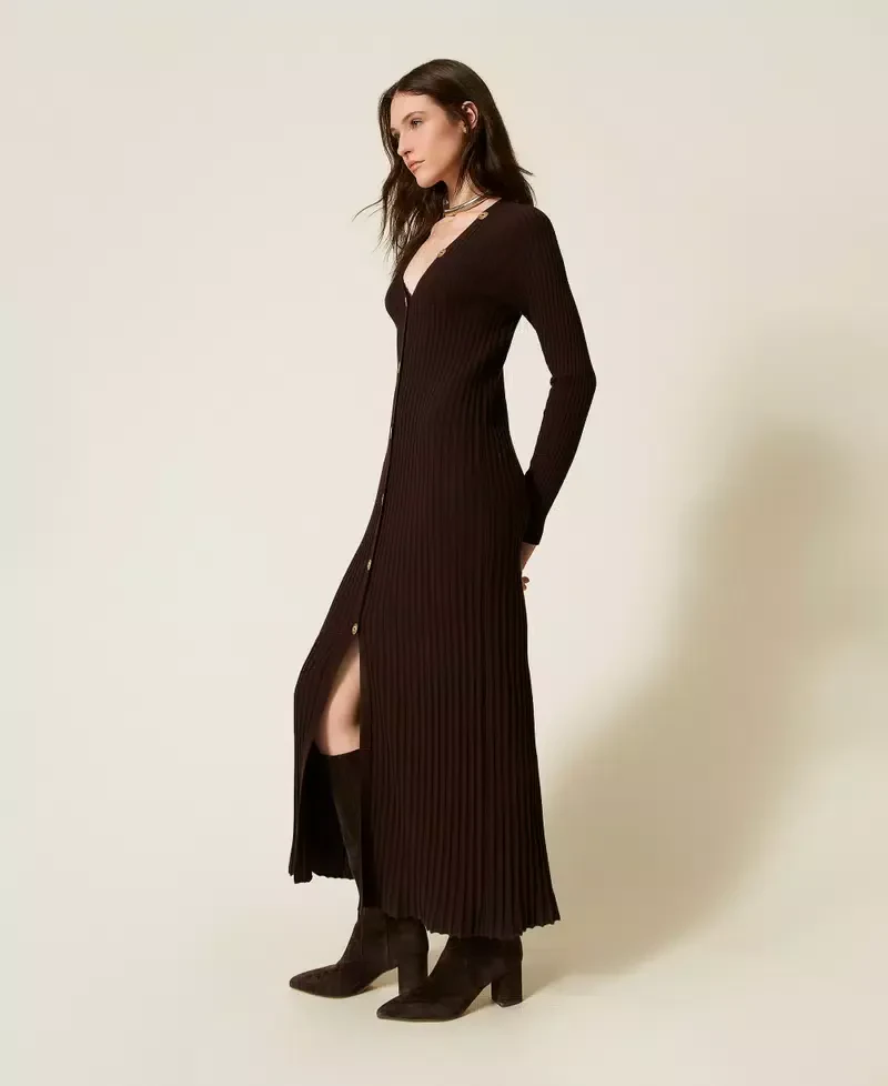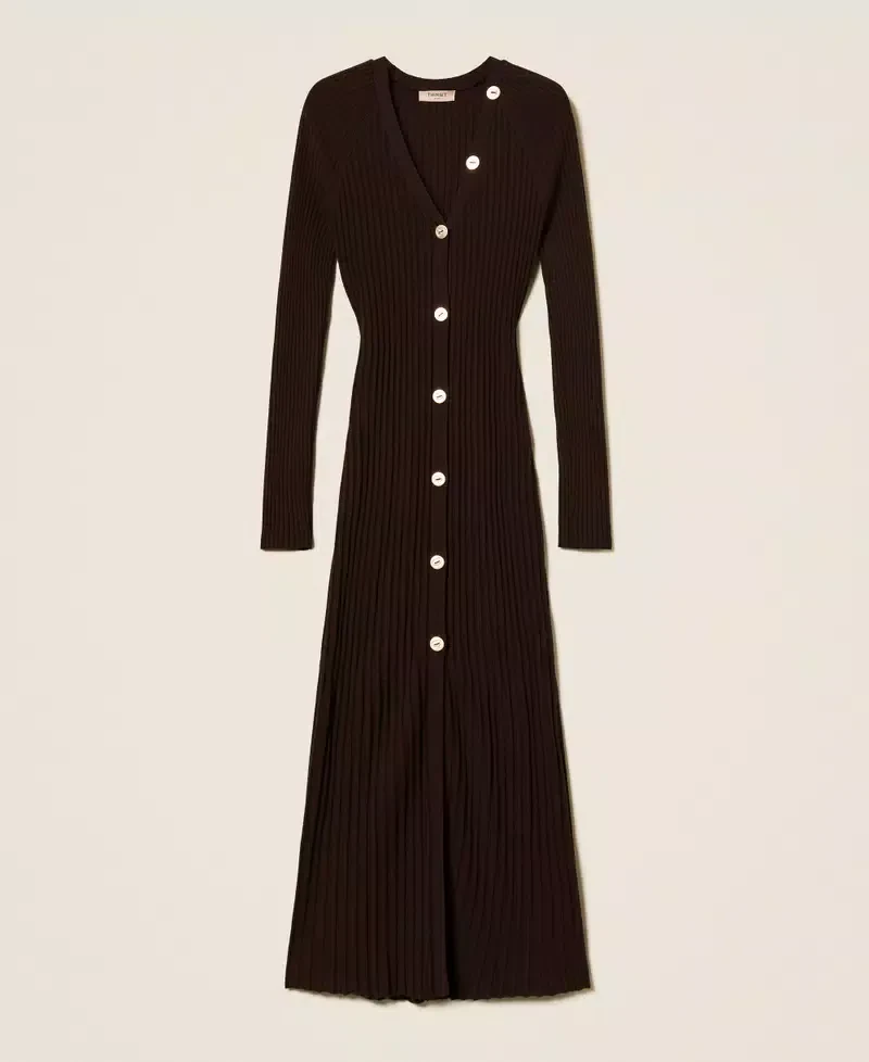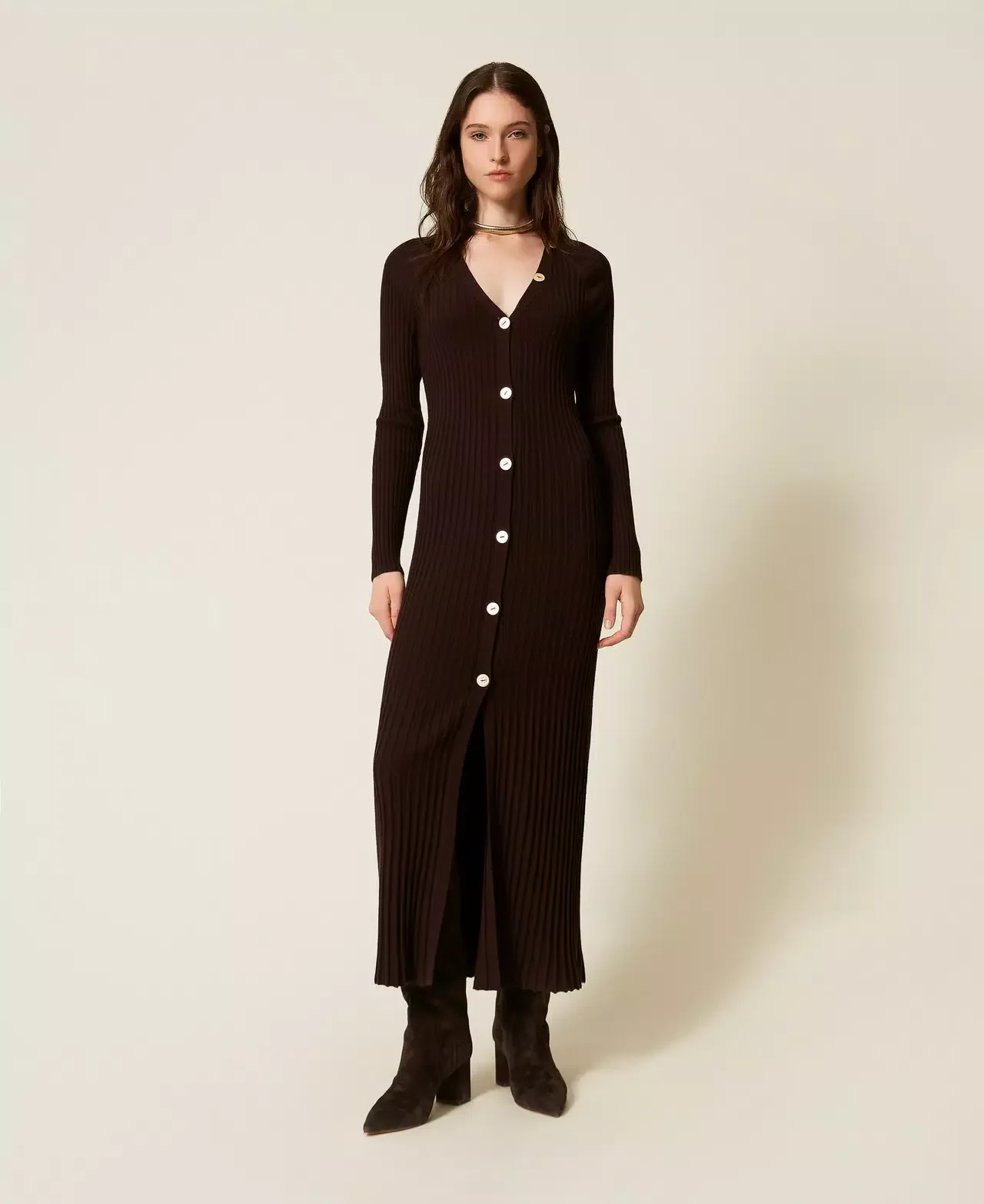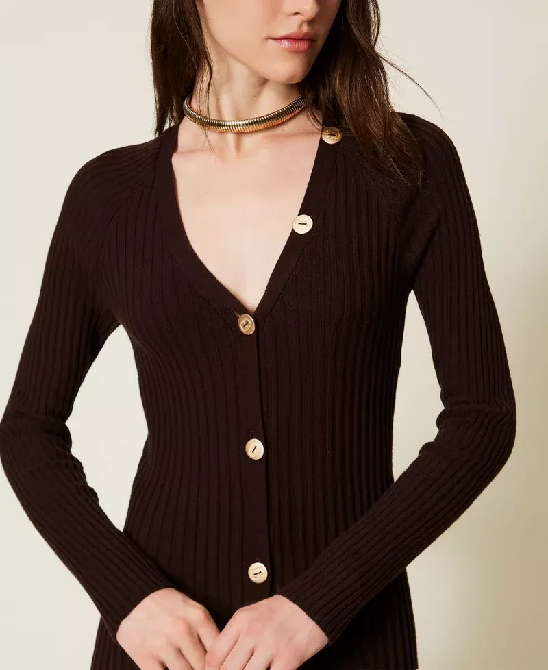 Wool and viscose blend rib knit maxi cardigan that can be worn as a dress. V neck, long sleeves, logo button fastening, Oval T logo plate on the back, fitted.