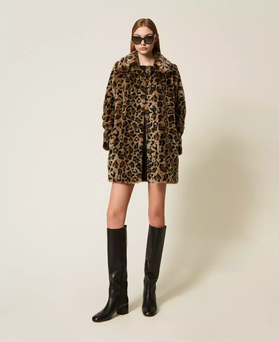 Animal print jacquard faux fur coat. Lapels, fastening with logoed buttons, long sleeves, inlaid side pockets, lining, straight fit.