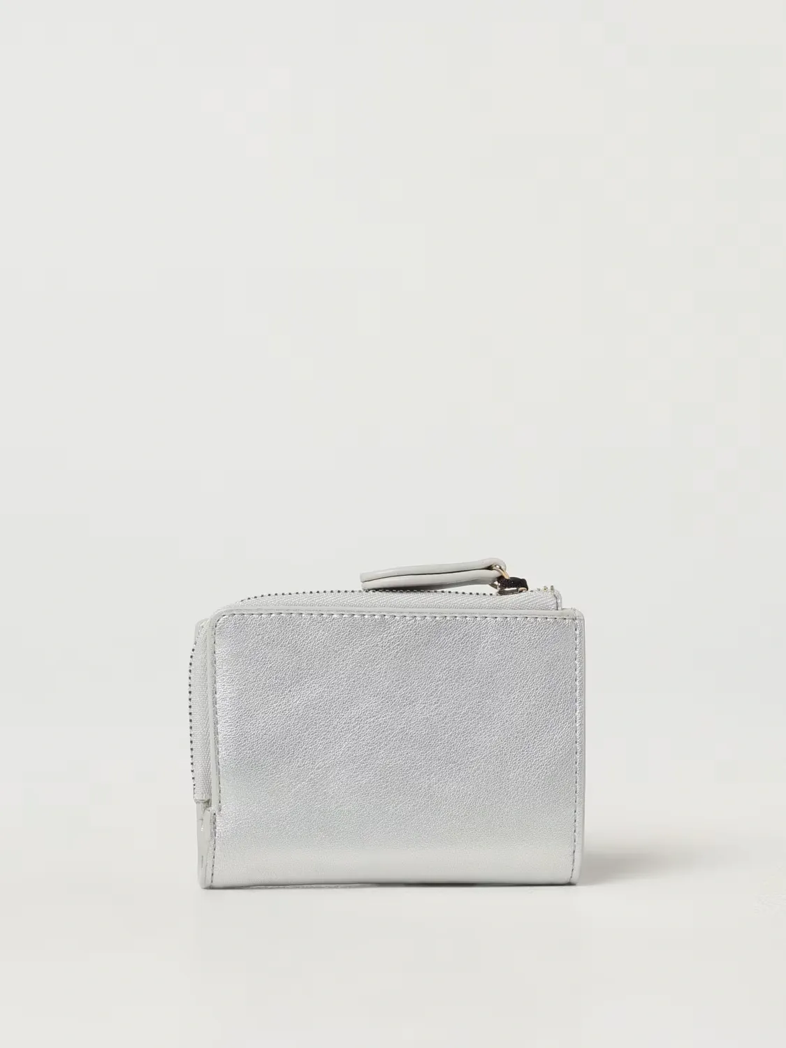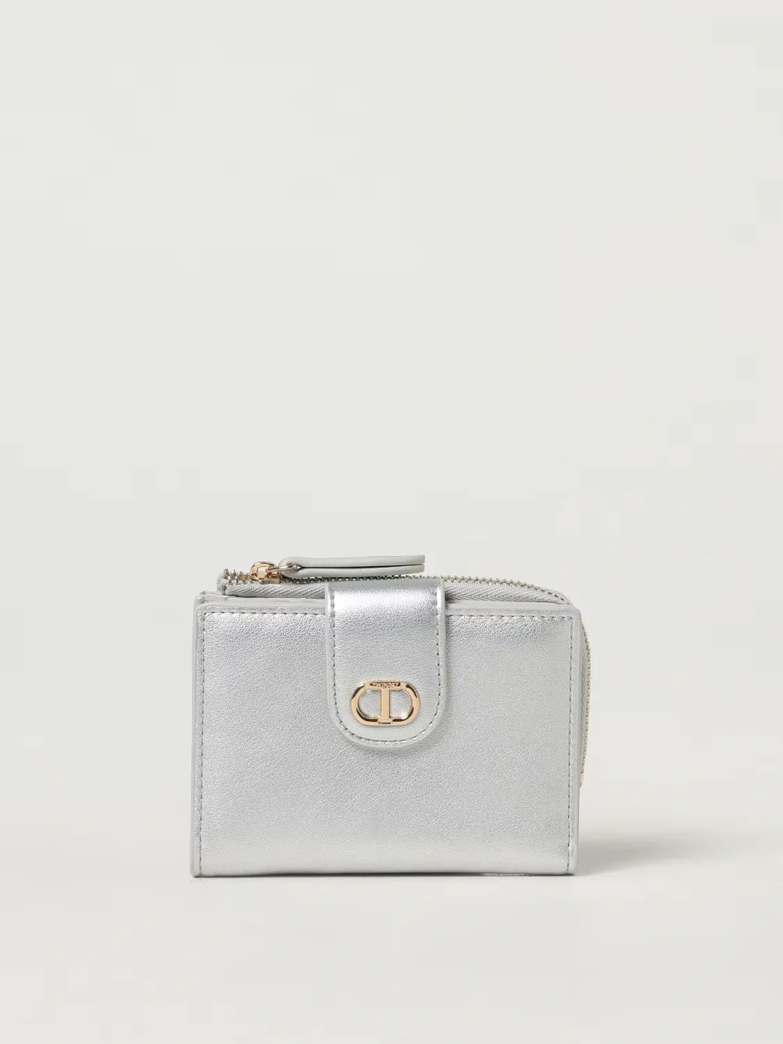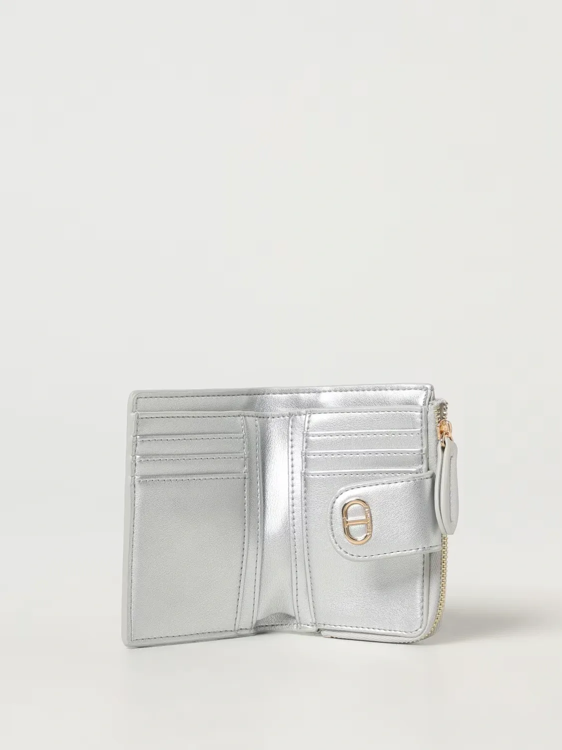Smooth faux calf leather small wallet with matching metal Oval T logo. Double compartment comprising a coin purse with zip closure and a central card and coin holder with tab and snap button closure.