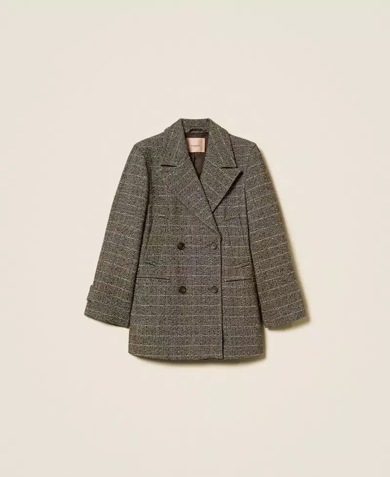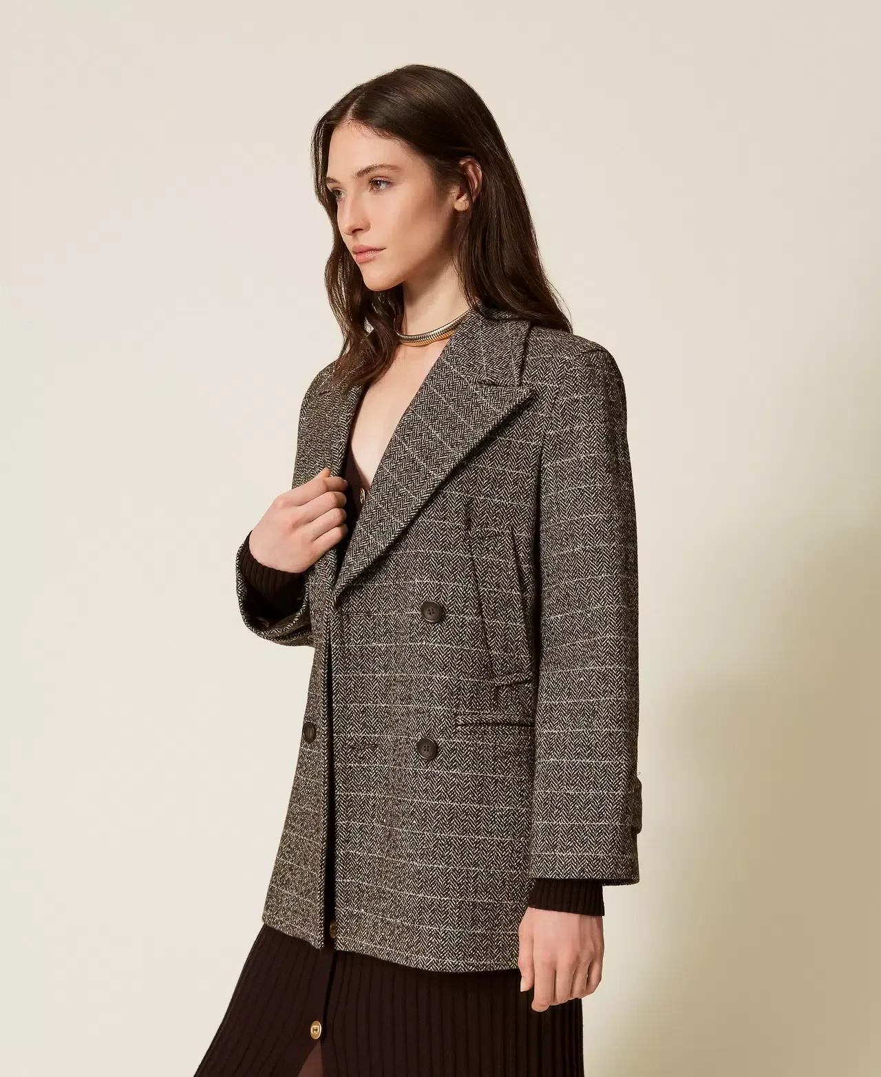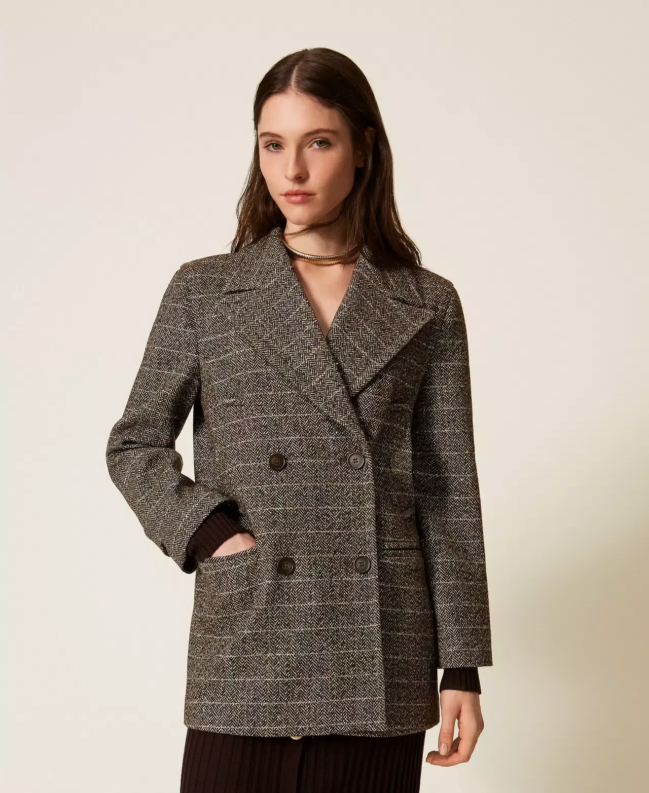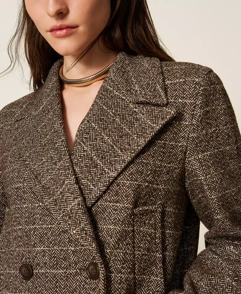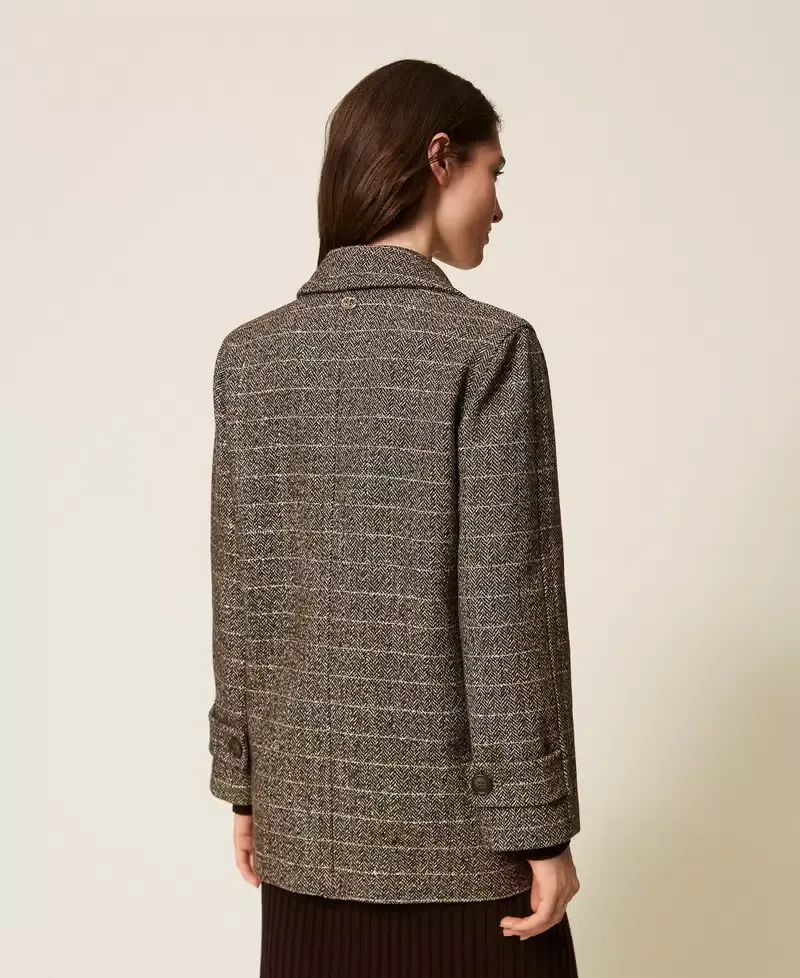 Chevron pattern wool blend pea coat with lurex. Maxi lapels, double-breasted button fastening, long sleeves with wrist bands, slant pockets at the front, lining, Oval T logo plate at the back, straight fit.