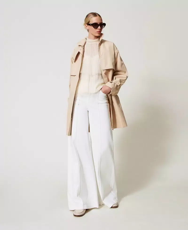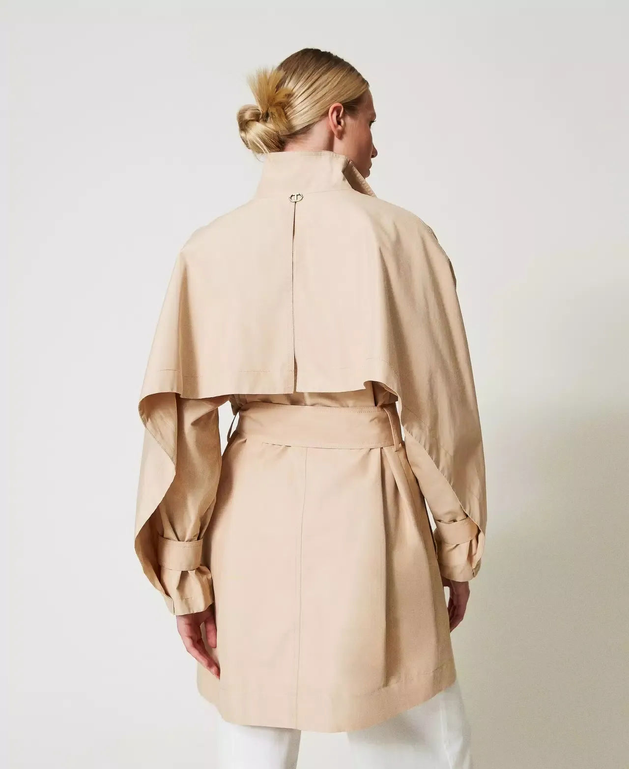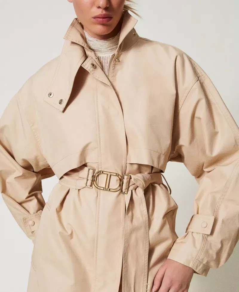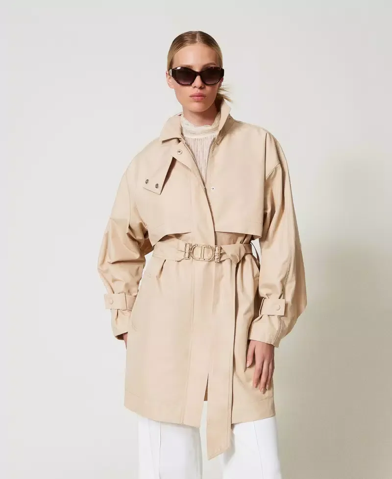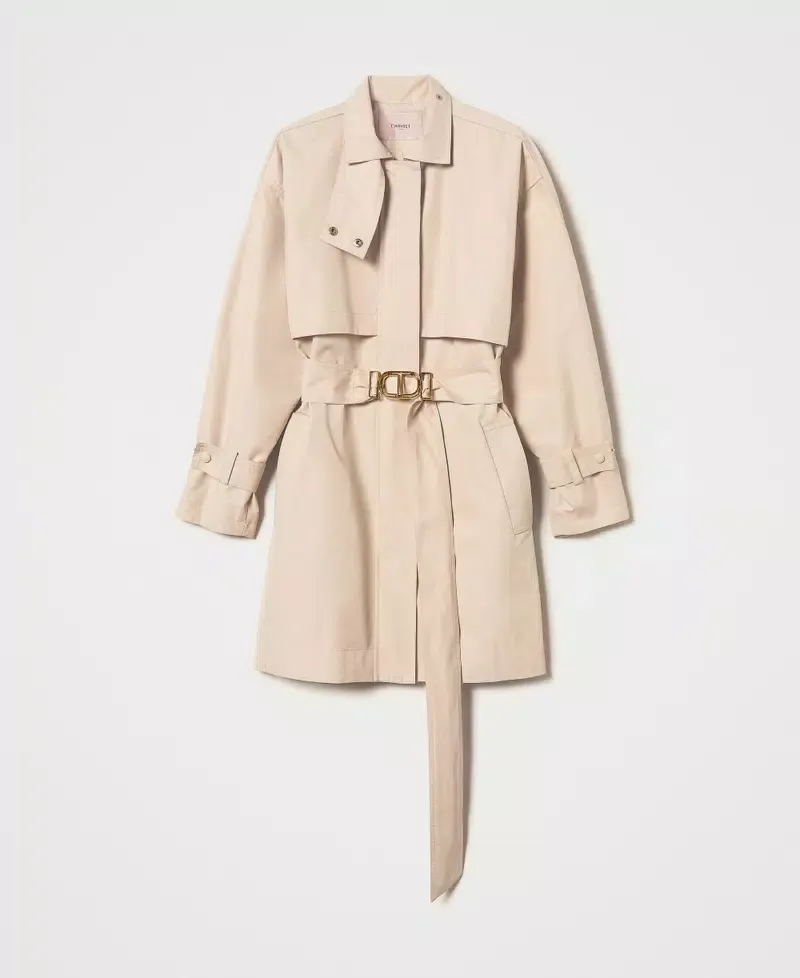 Short cotton blend twill trench coat with Oval T metal buckle belt. Double storm flap sewn at the front and open on the back, long sleeves with adjustable straps, concealed snap button fastening, welt pockets on the sides, belt loops, cotton lining, loose fit.