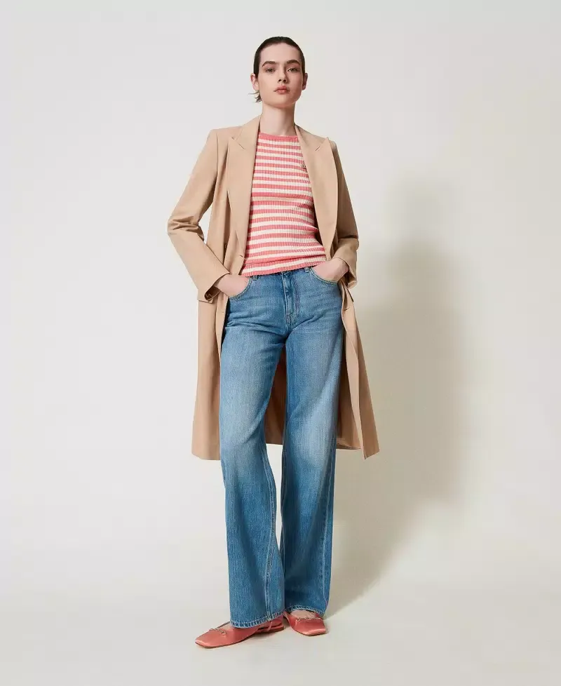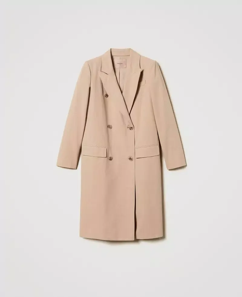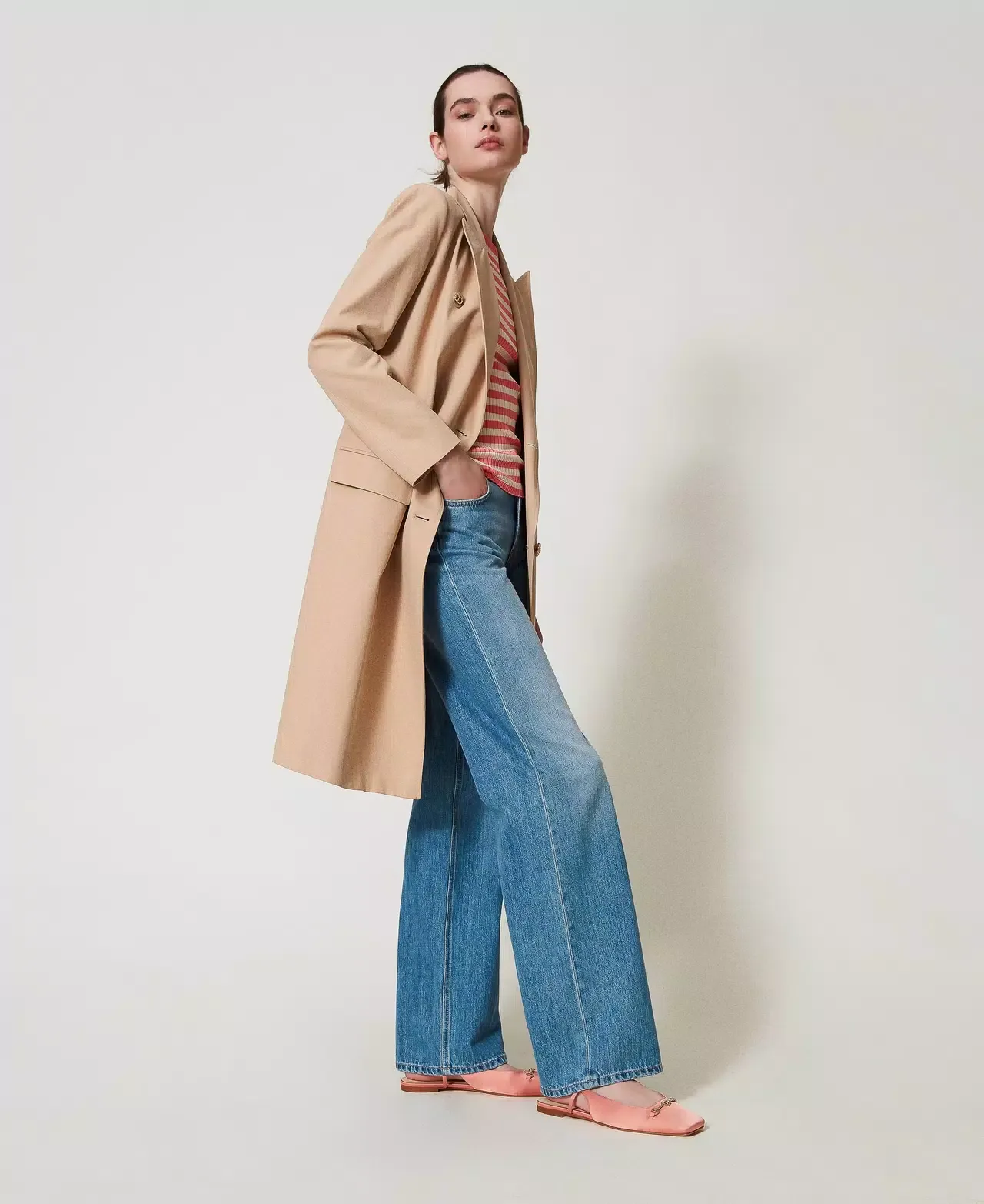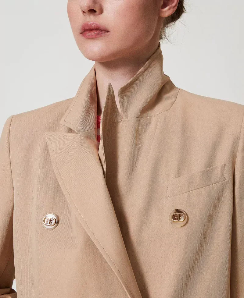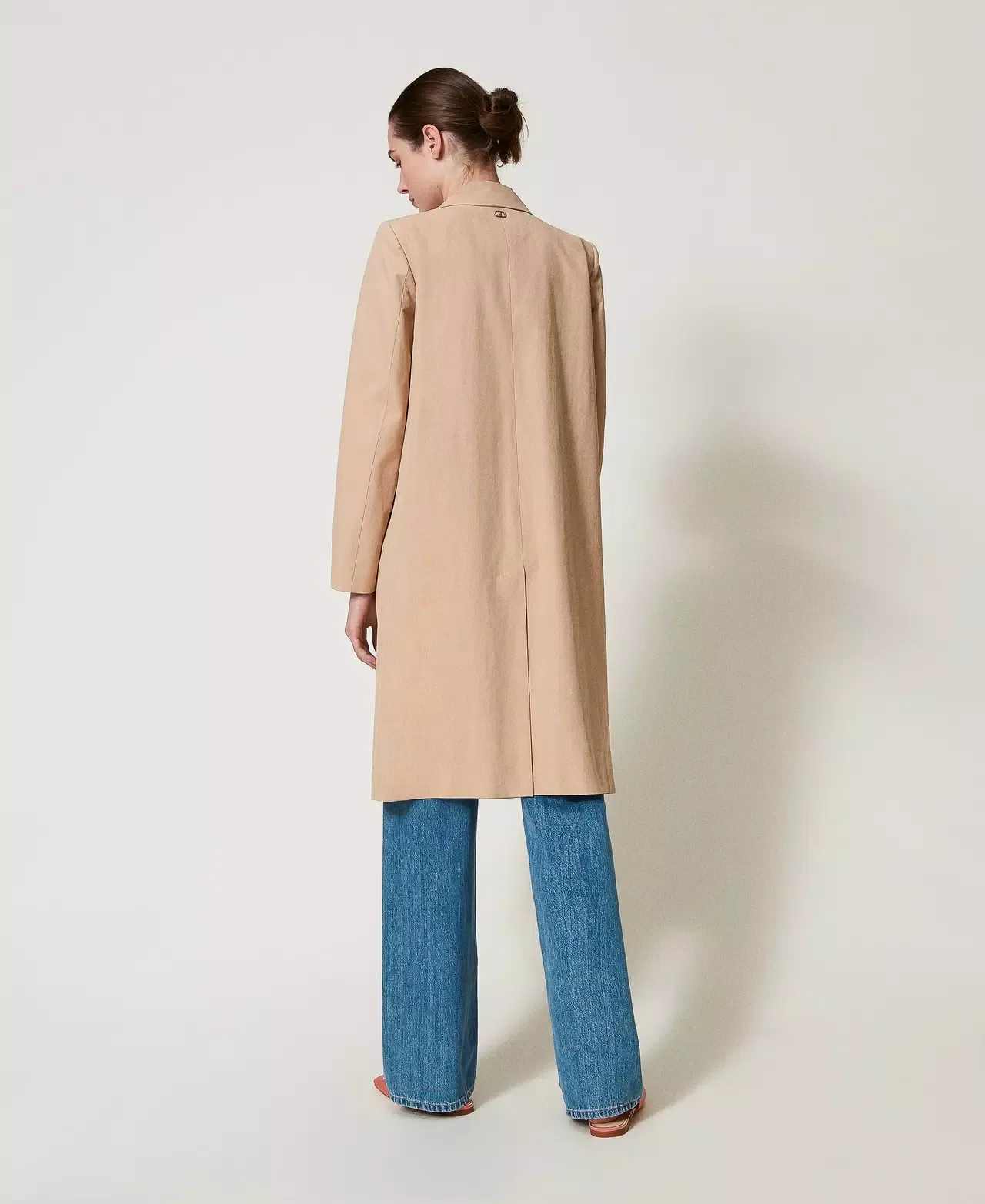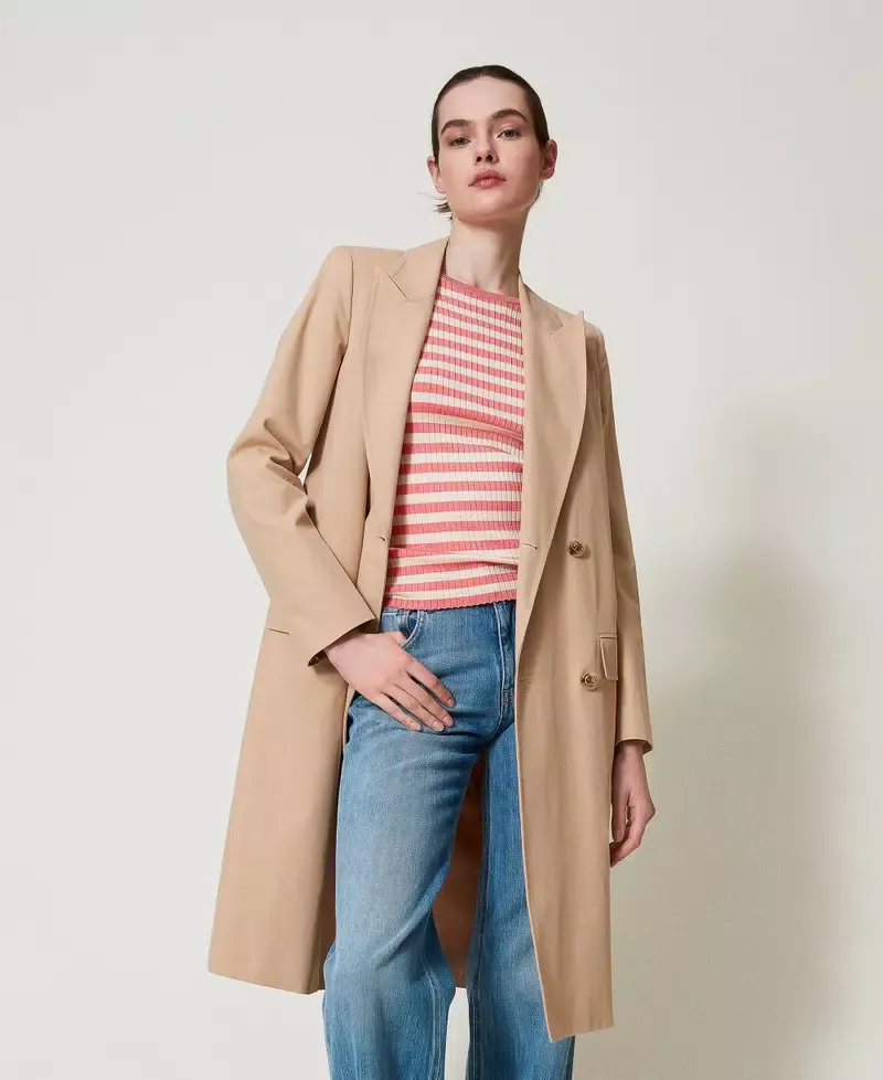 Tailoring-inspired cotton blend trench coat, double-breasted with gold-tone Oval T buttons. Pointy collar lapels, welt pocket on the chest and side flap pockets, central slit at the back, lining and Oval T logo plate at the back, straight fit.