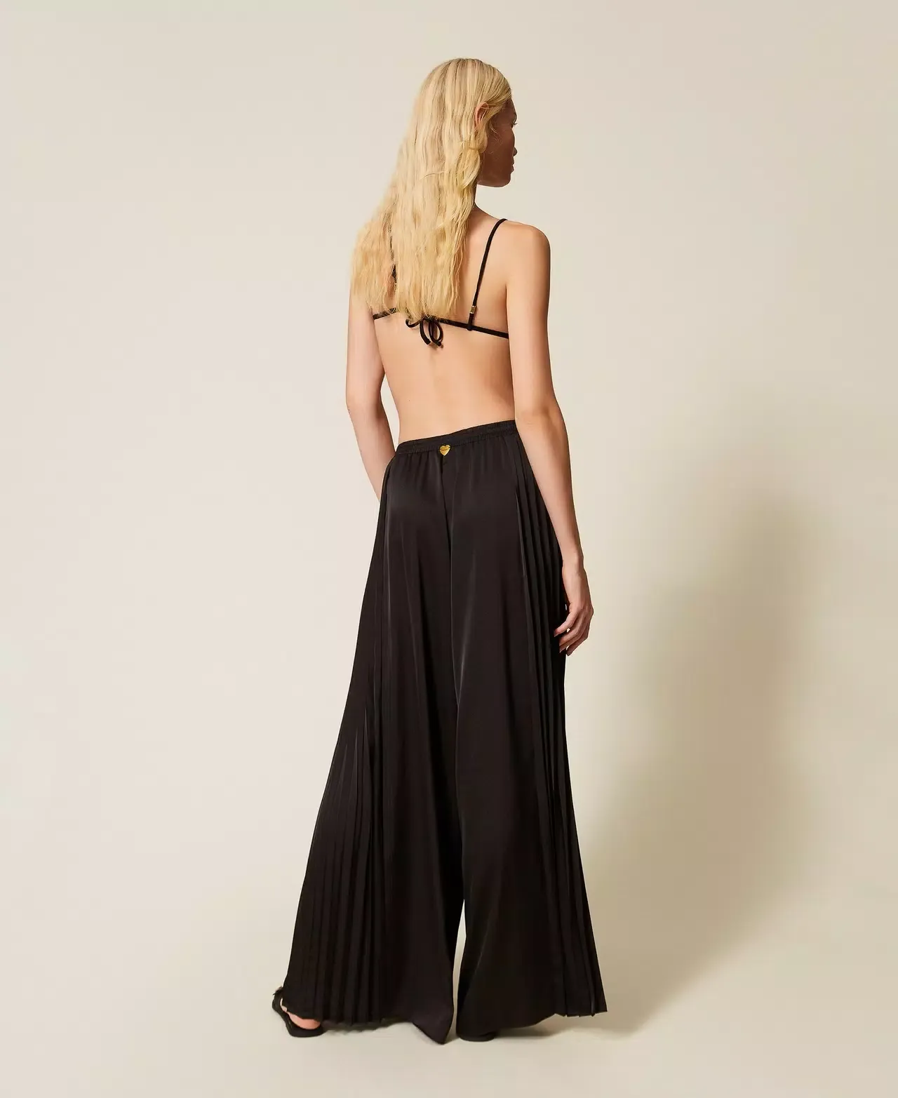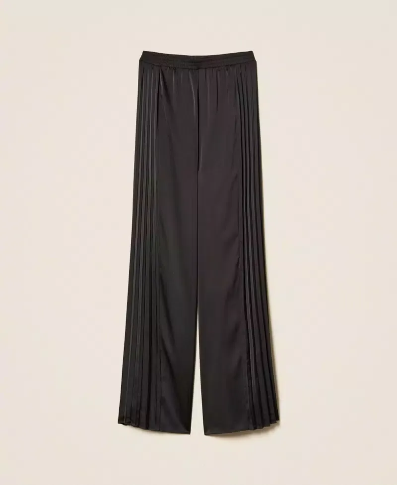 Shiny jersey trousers with pleated inserts at the sides, elasticated waist, heart-shaped metal logo at the back, wide fit.