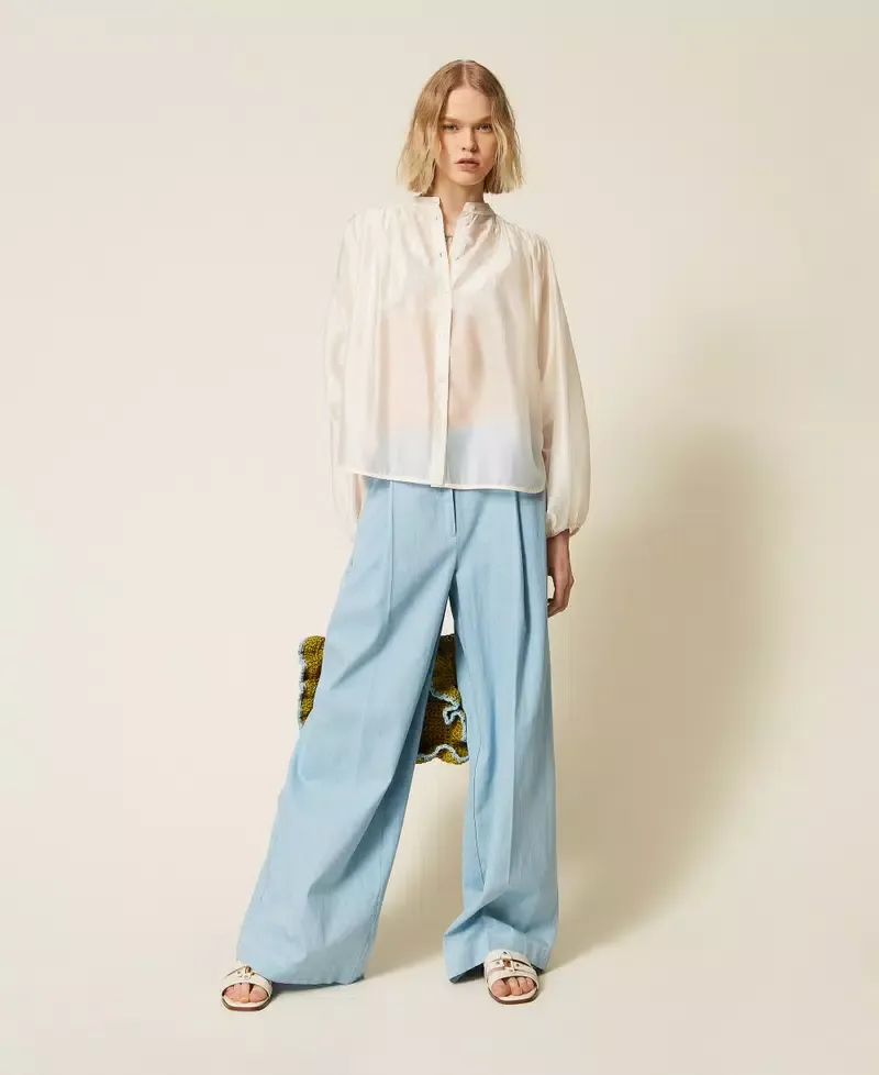 Trousers made in Italy from lightweight cotton canvas with a denim-inspired texture. Front pleats, mannish hook and zip fastening, elasticated waist at the back, side pockets, palazzo fit. This item is part of the “Archive” range, inspired by the most iconic and most loved garments from the Twinset collections.