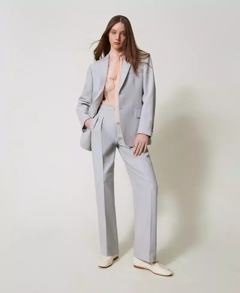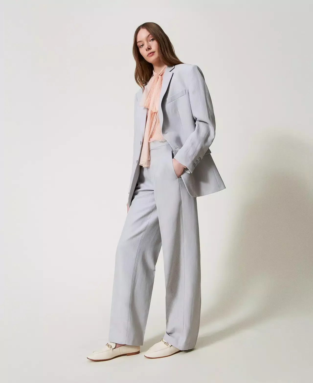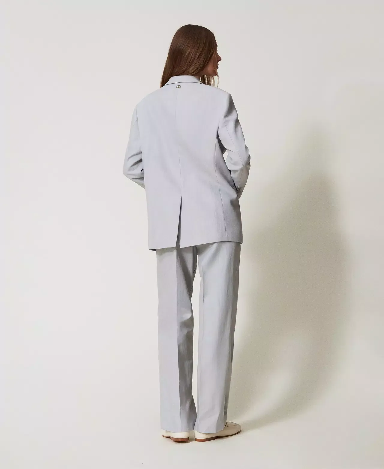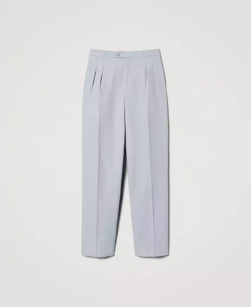 Mannish trousers made from cotton and linen blend twill. Low waist with pre shaped band, double pleats, diagonal zip and button fastening, slant pockets, permanent crease, welt pockets on the back, loose fit.