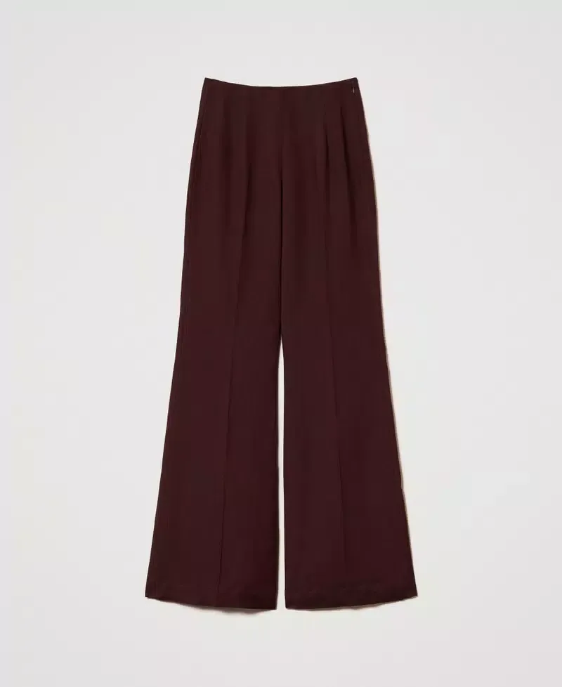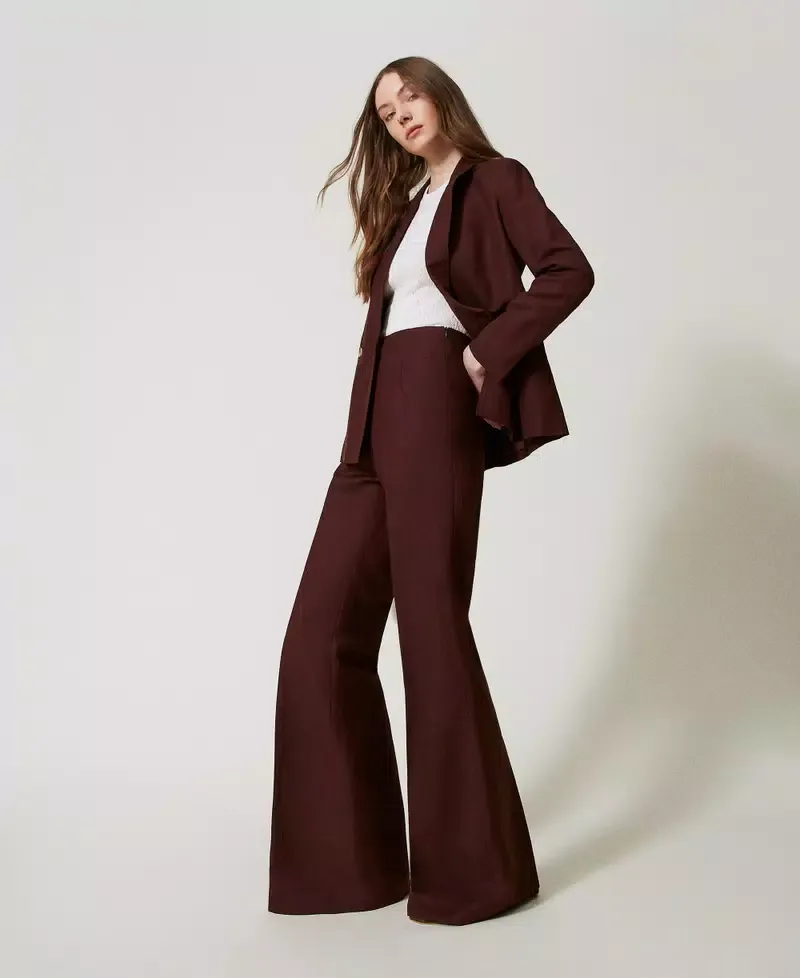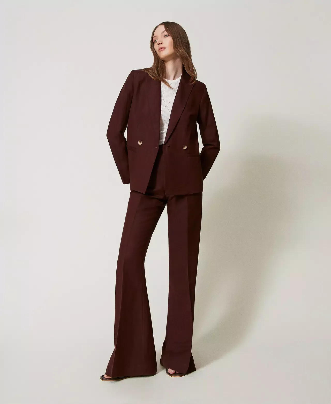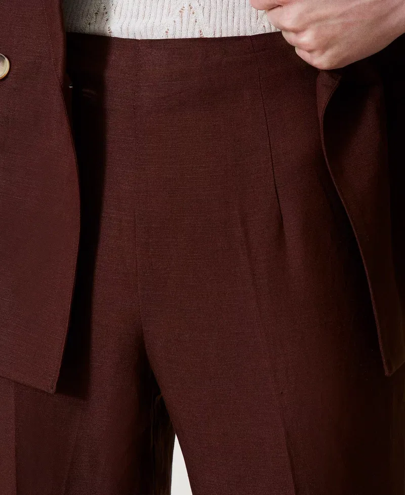 Linen blend flared trousers with fitted waistband, concealed zip and hook fastening. Front and back seams, mannish permanent crease. Logo plate on the back.