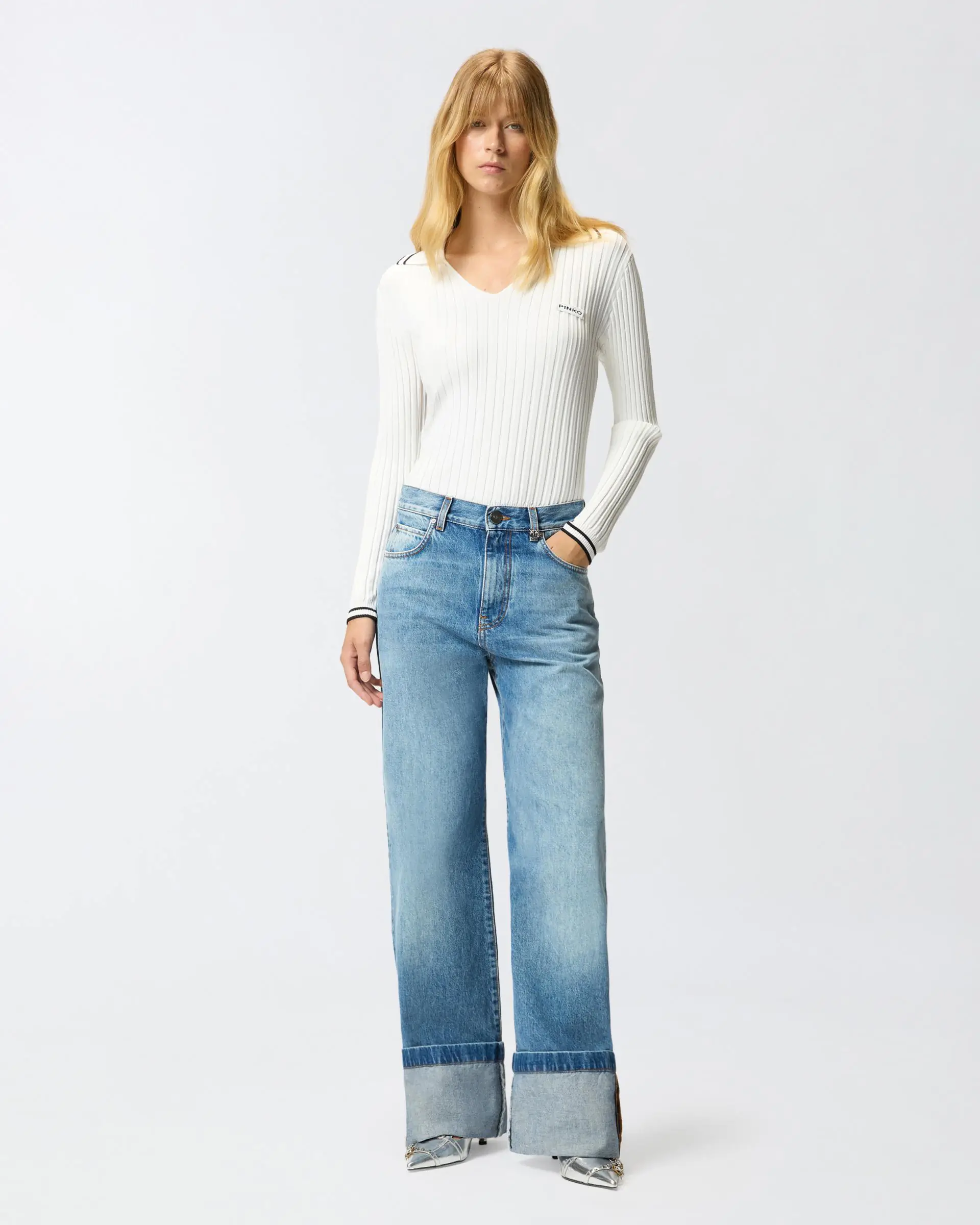 Women's five-pocket jeans with a wide, straight leg and a fixed turn-up hem. The piece is made from blue pure cotton denim treated with different washing techniques to obtain the final vintage-effect shade. The lettering logo embroidered on the back of the waistband and the Love Birds logo, in the form of embroidery on the right back pocket and the detachable rivet, add pure PINKO style to the design. Belt loops and front concealed zip and button fastening. This model is a little wider than the usual size.
