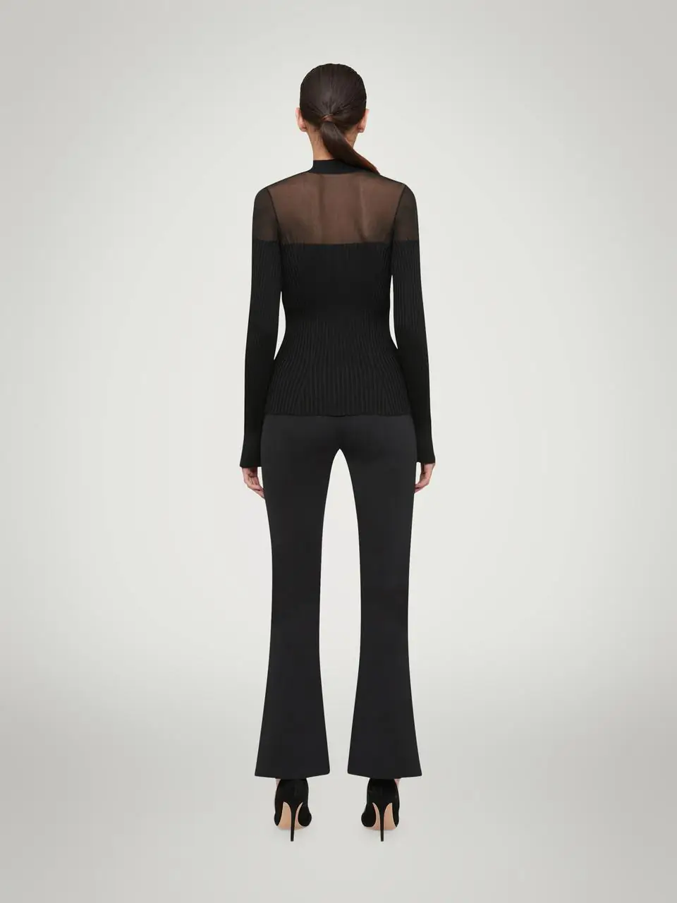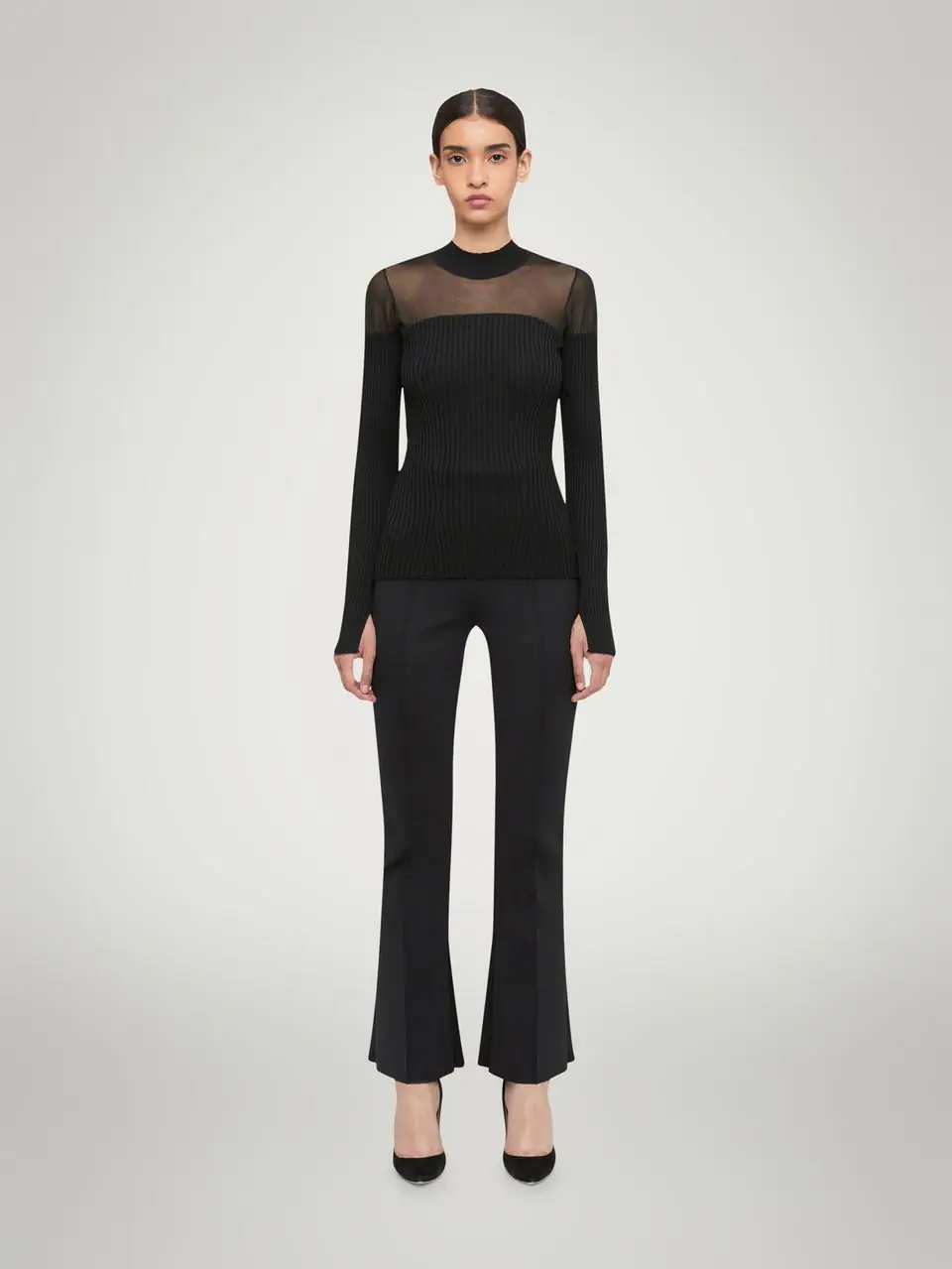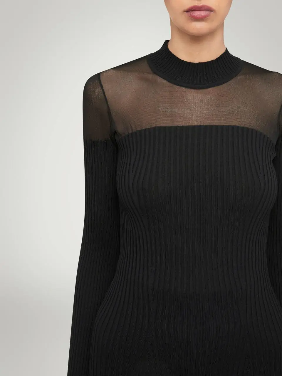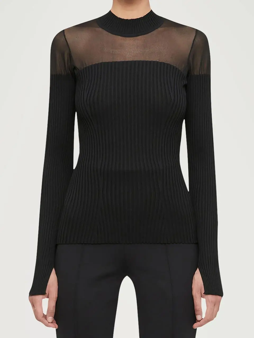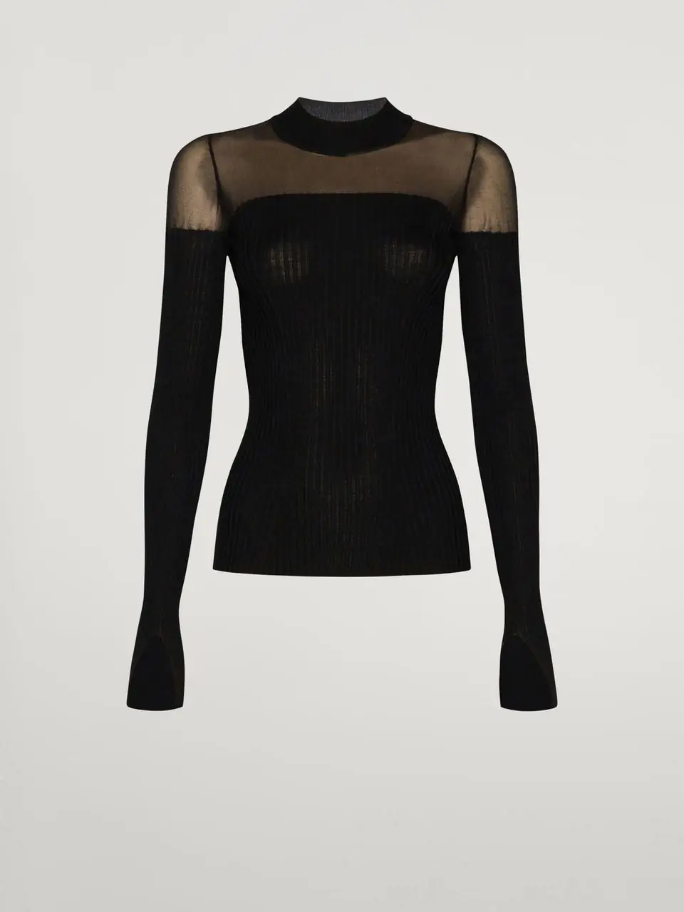A sheer viscose panel contrasts with the long-sleeved top's soft, ribbed wool knit. The simple, ribbed collar completes the look.